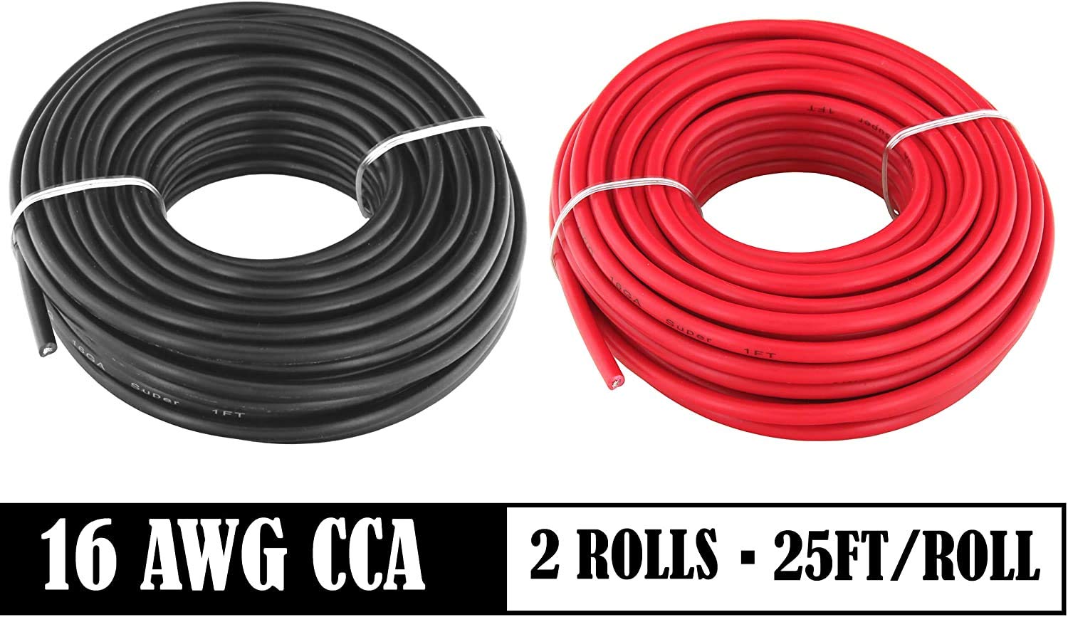 Primary automotive wire: 16 AWG wire x 2 rolls, 16Ga wire in 25ft roll total of 50ft. This electrical wire comes conveniently in black and red rolls. Speaker wire 16 gauge.
