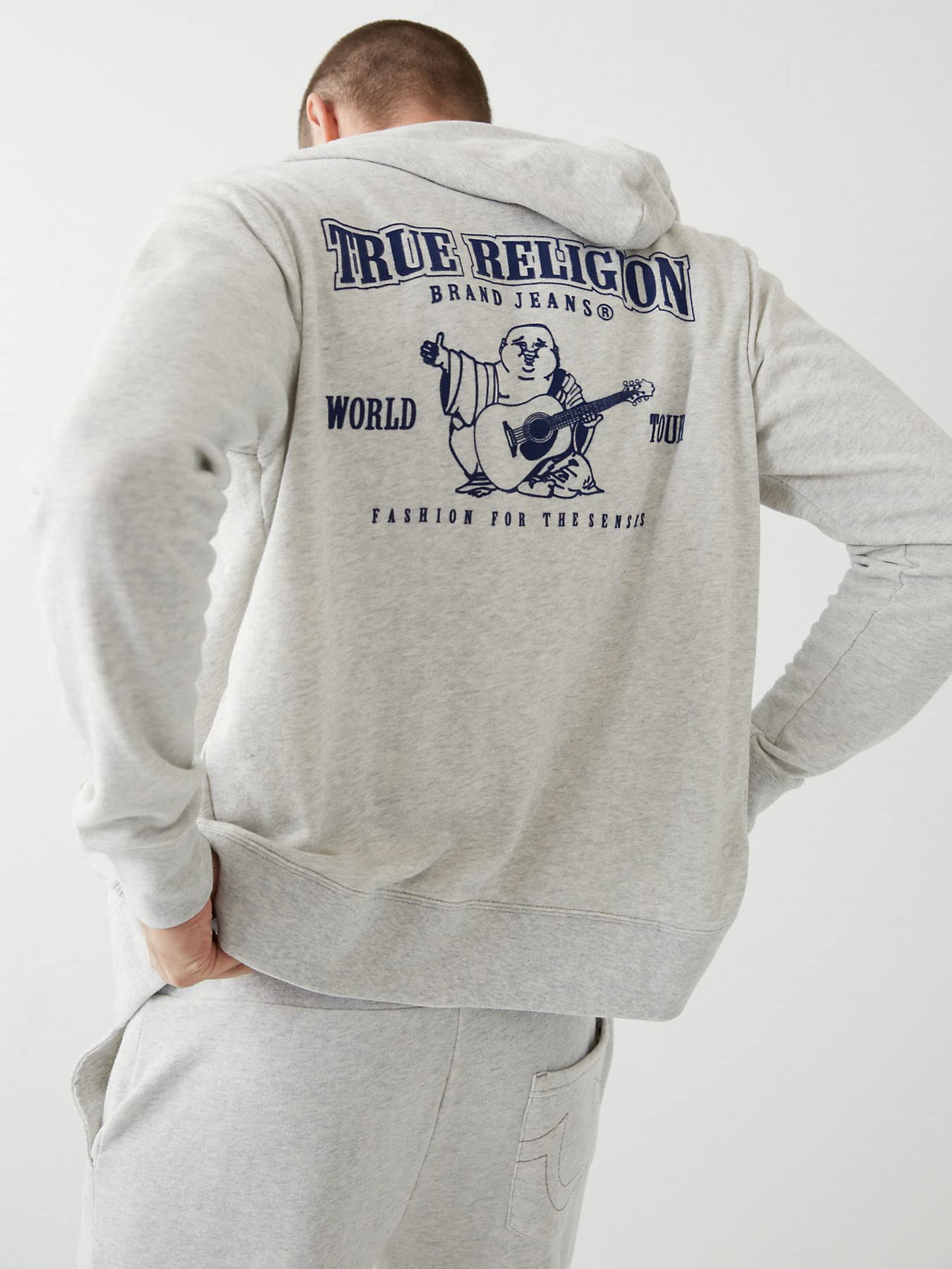 Made from 100% cotton, this True Religion Buddha Logo Zip Hoodie features a zip front, drawstring hood, kangaroo pockets, contrast stitching, and bold graphics for durable comfort and modern streetwear style.