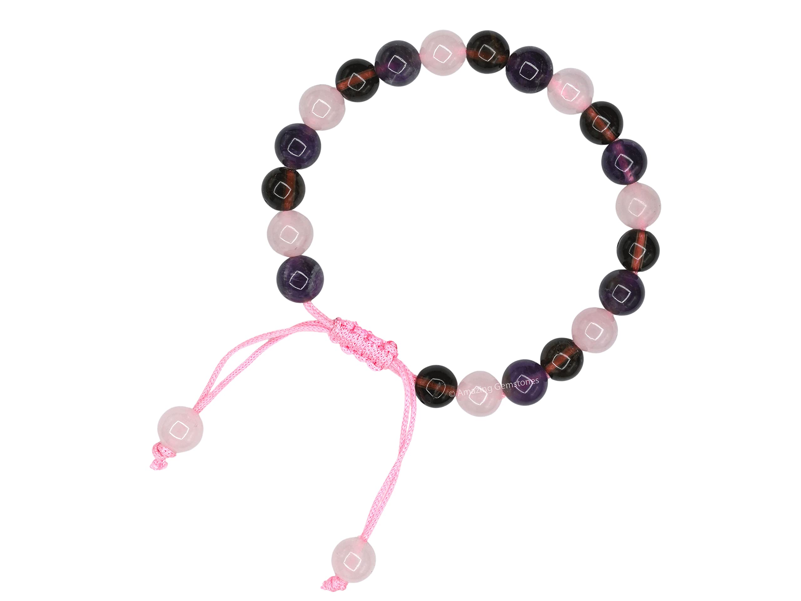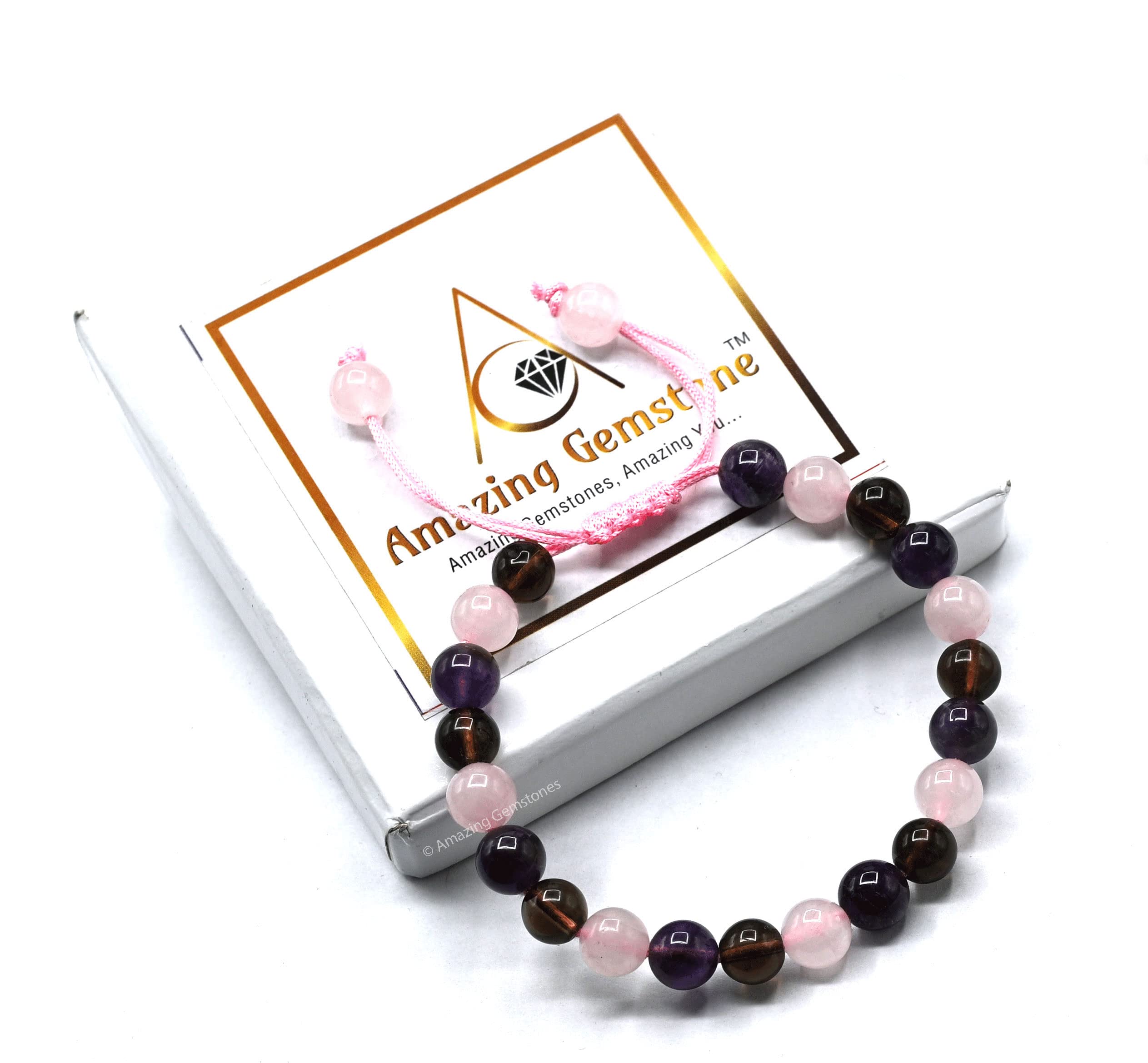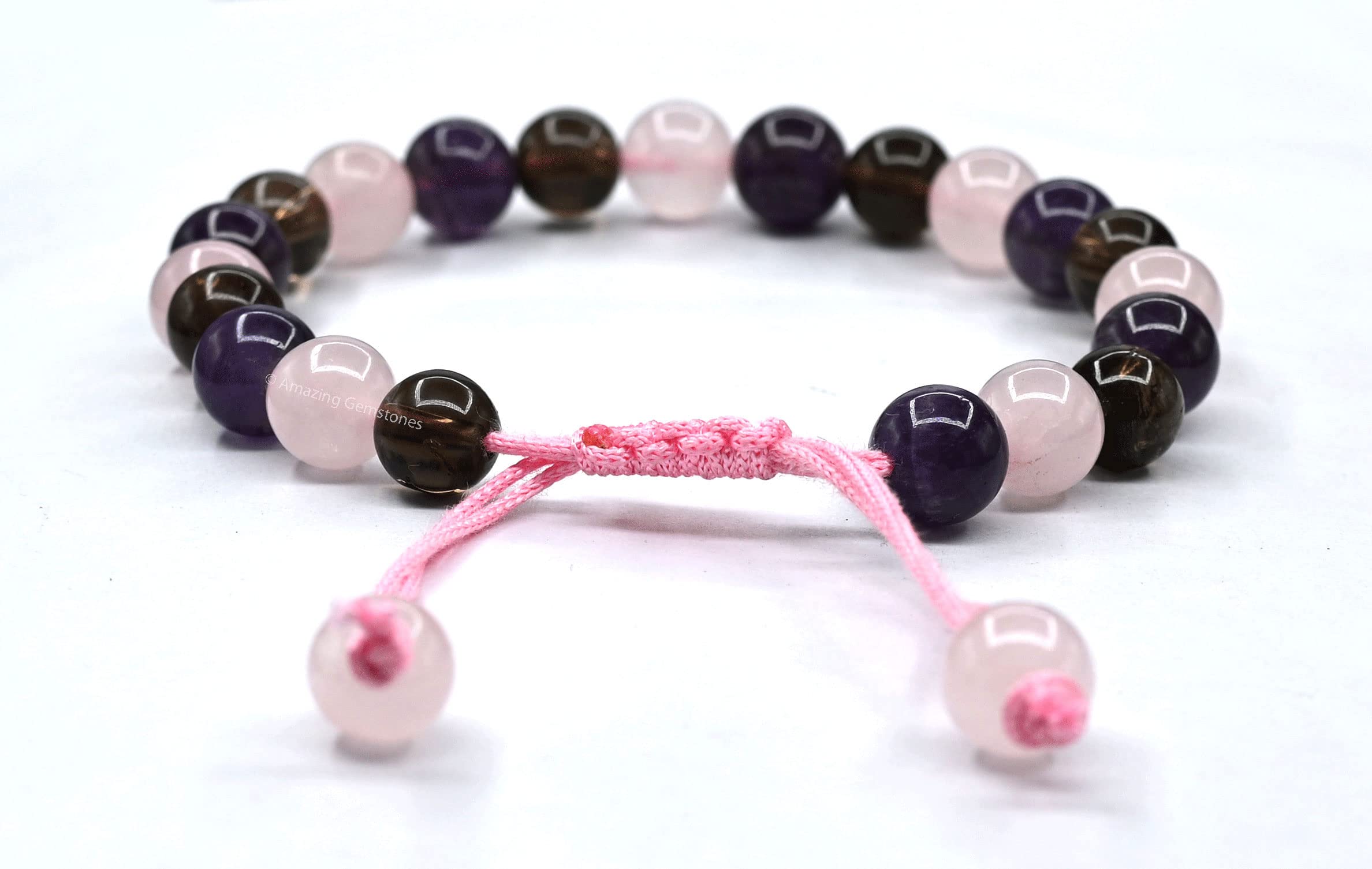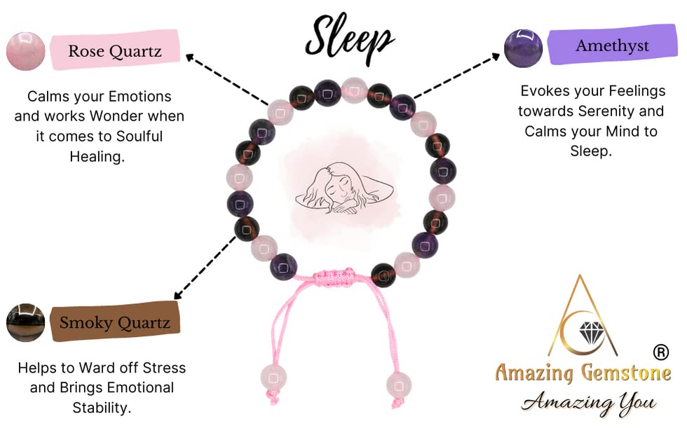 Bracelet for Sleep contains real crystal beads Rose Quartz, Smoky Quartz and Amethyst. Rose Quartz calms your emotions, Smoky Quartz wards off stress & Amethyst calms your mind.