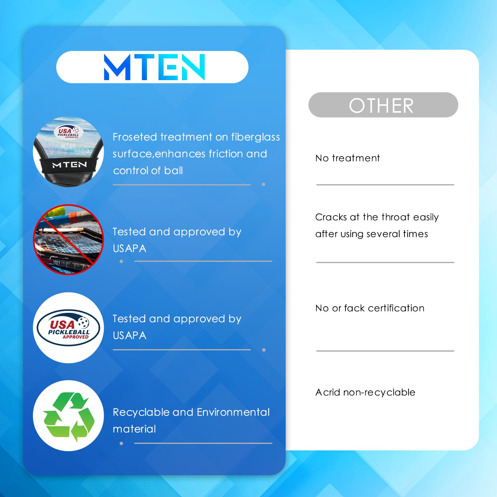 USAPA Approved Pickleball Paddles: Enjoy tournament play with MENT paddles, officially approved by USA Pickleball and carrying the USAPA seal. Rest easy knowing our paddles have passed stringent quality and safety tests