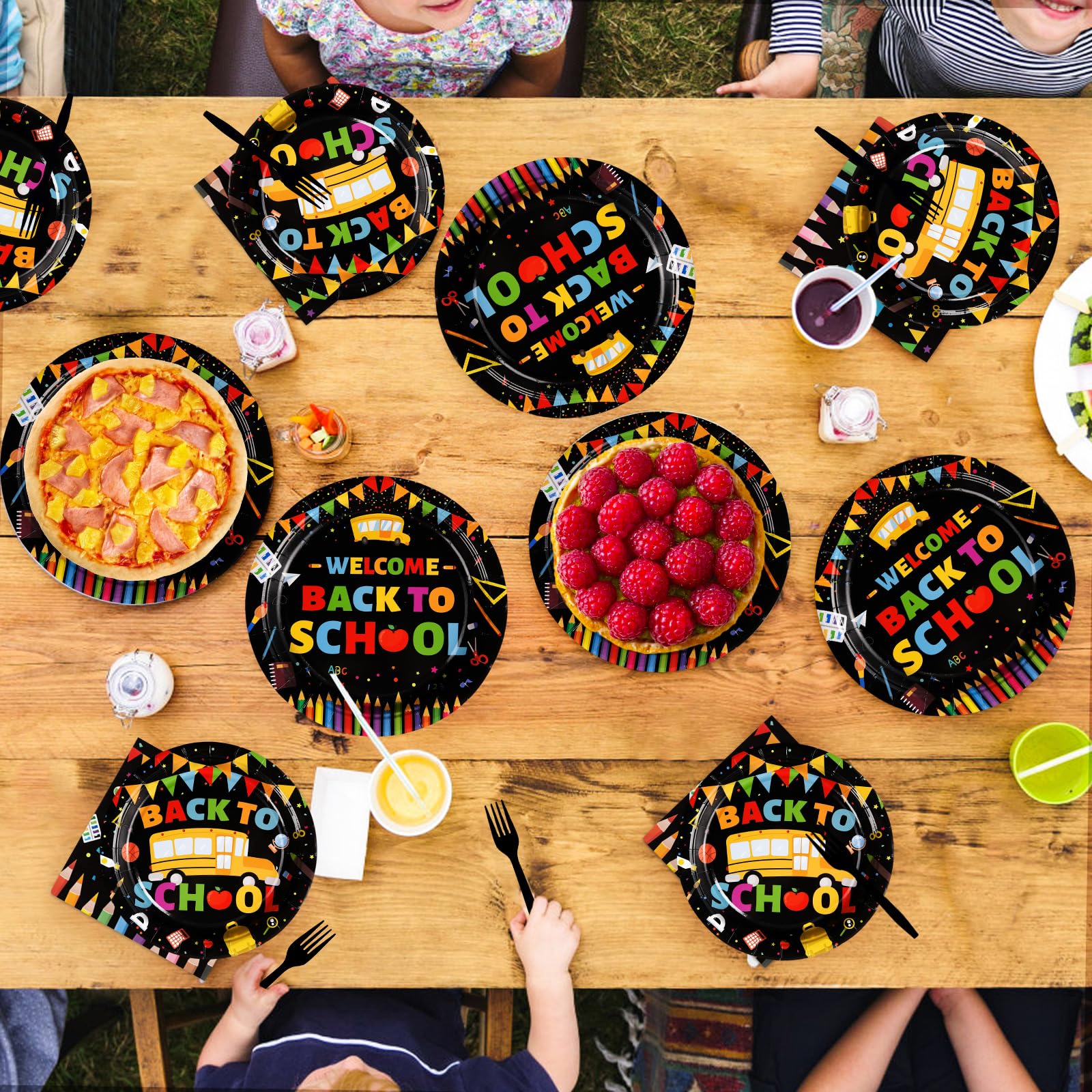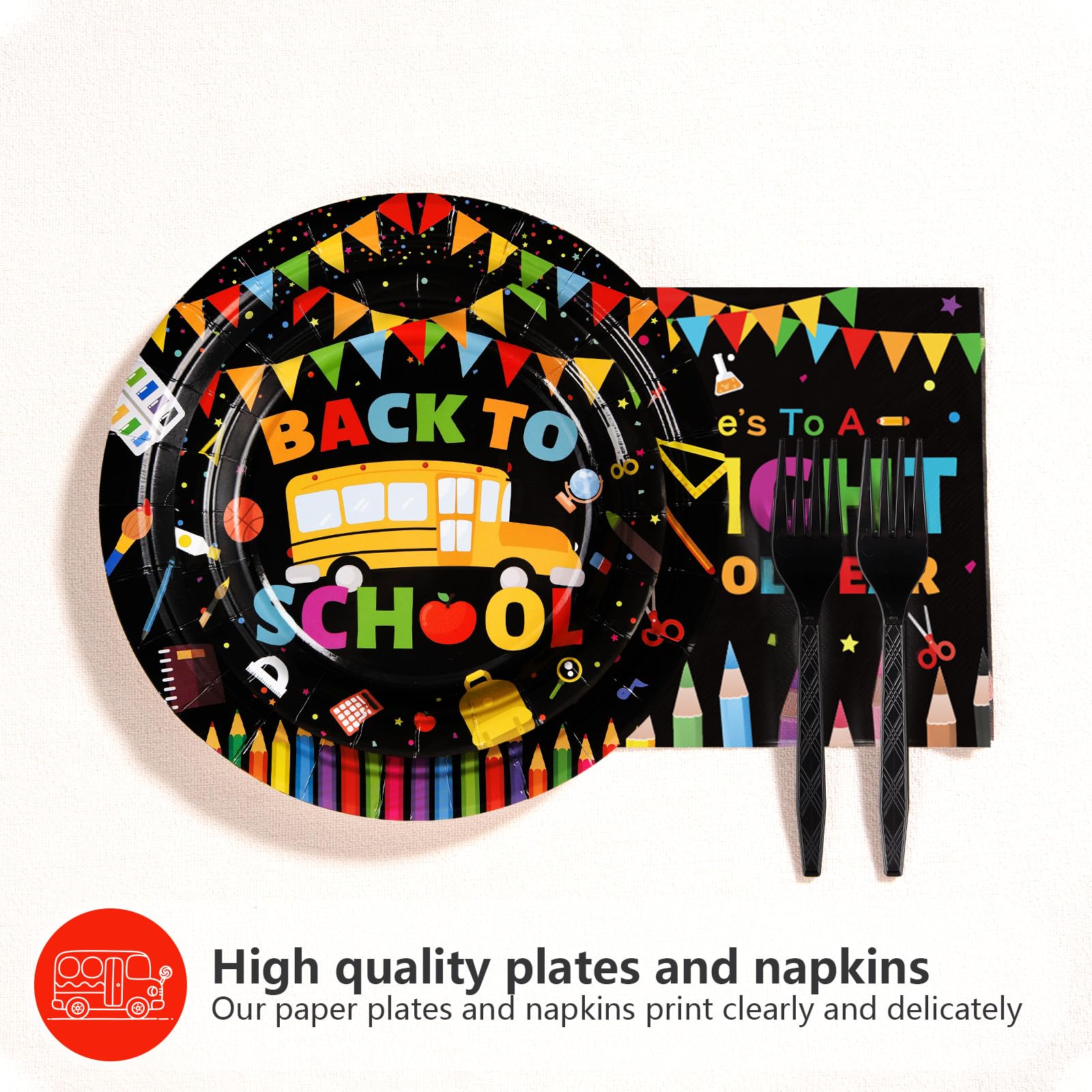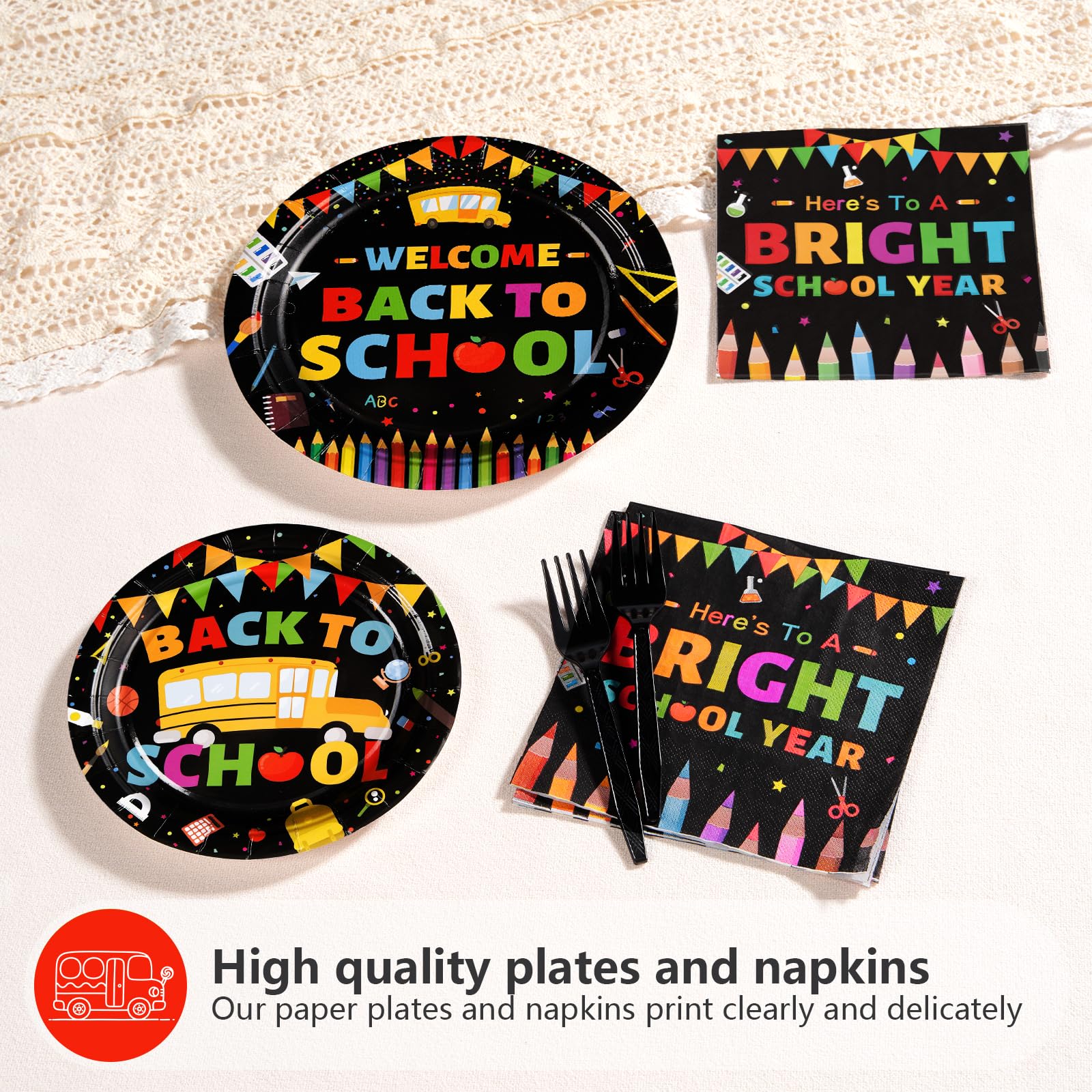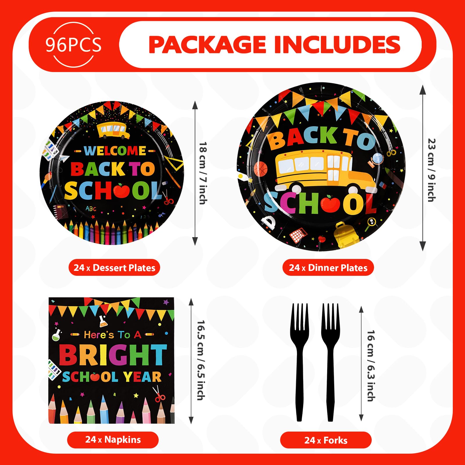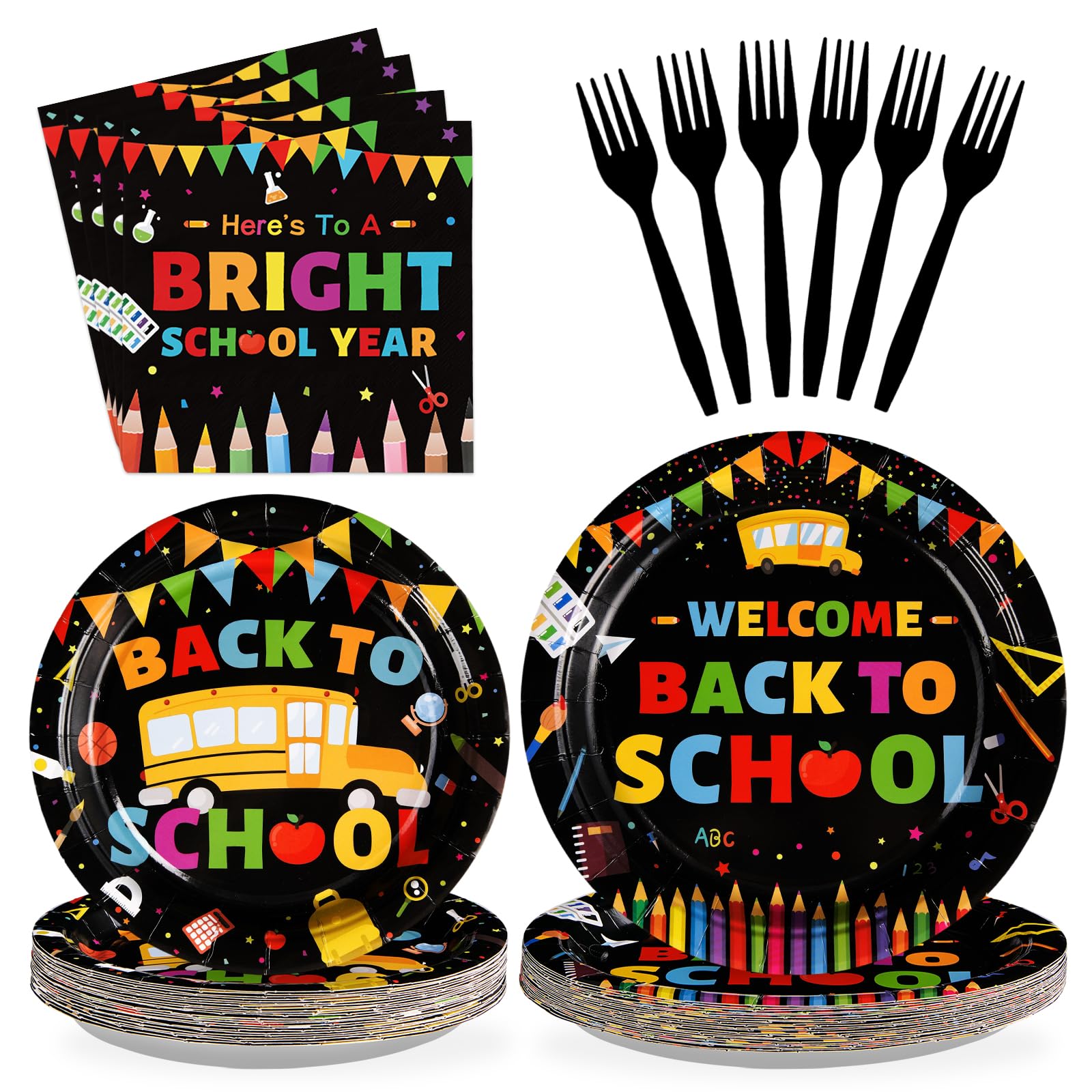 Back to School Party SuppliesοΌOur 96 pcs back to school decorations tableware set includes 24 9" back to school dinner plates, 24 7" dessert plates, 24 6.5" napkins and 24 forks for each set that can serve 24 guests. Designed for the back to school students, this black back to school dinnerware provides the perfect party experience