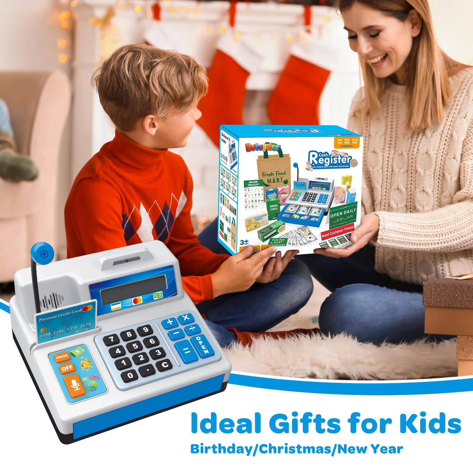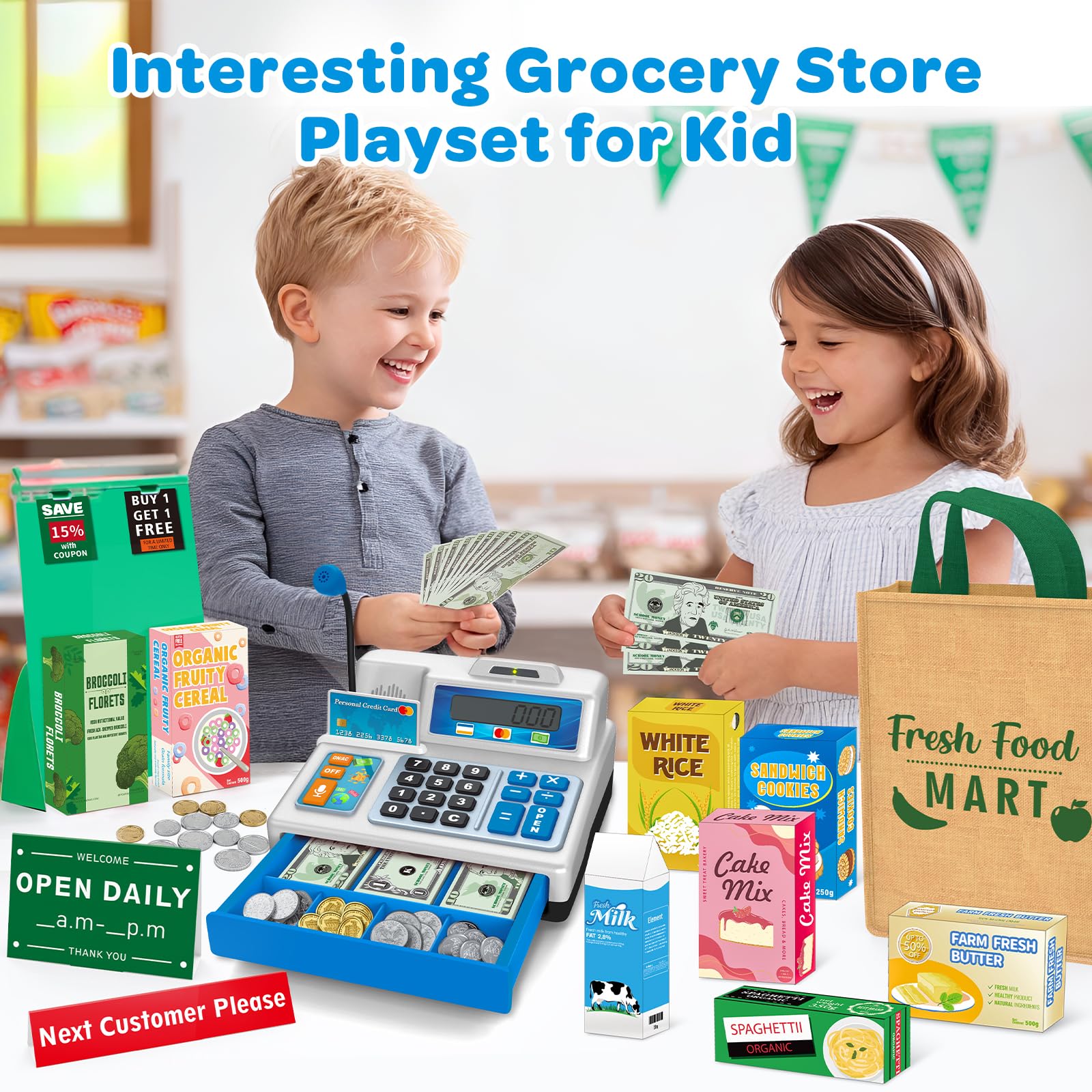 120 Pcs to Build a Funny Grocery Store: This grocery store game set includes a cash register with a microphone and sound effects, 40 plastic coins, 60 paper cash, 8 grocery boxes, a credit card, a market shopping card, a conveyor belt divider bar, a shopping bag, play money, cards, and coupons. It's an ideal grocery store play food and role play companion set for kids 3, 4, 5, 6, 7, 8.