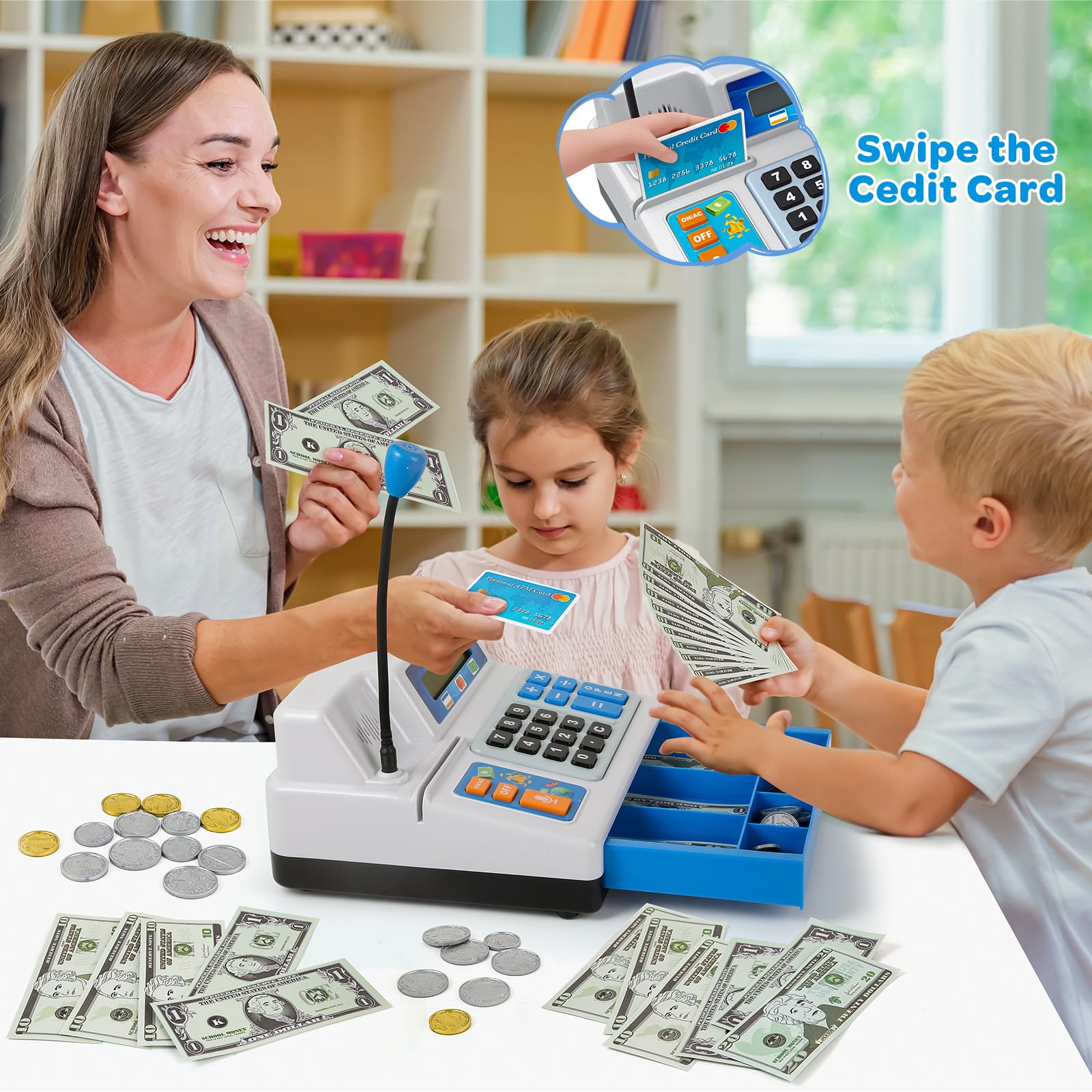 Realistic Toy Cash Register: The toy cash register is equipped with toy cash and coins. Playing with this cash register toy for kids can make learning numbers and counting skills more fun. In addition, this kids cash register is uniquely designed. When you swipe the toy credit card or press the button, you will get funny sounds and lighting. and the drawer makes a cha-ching sound when it is opened, just like a real cash register.