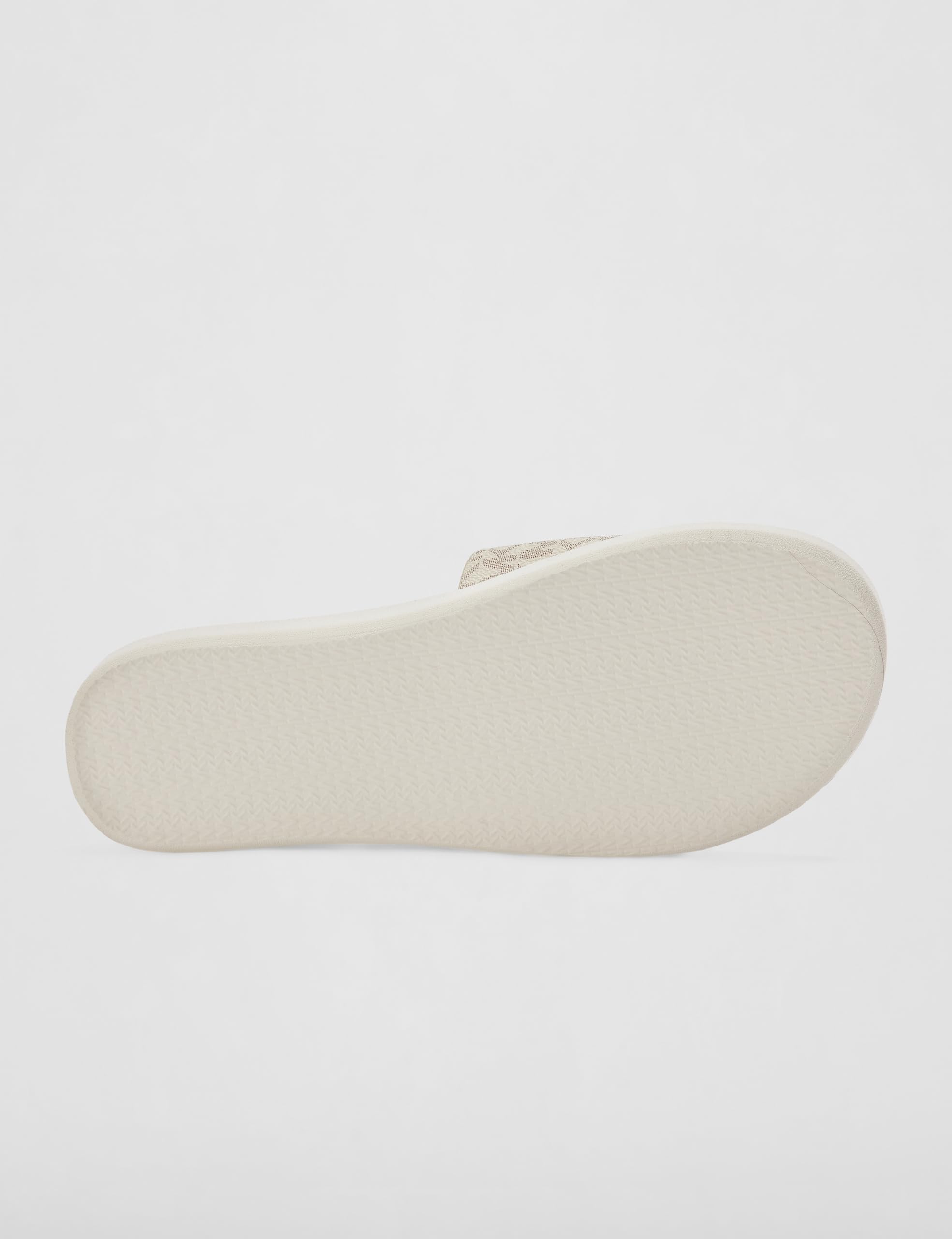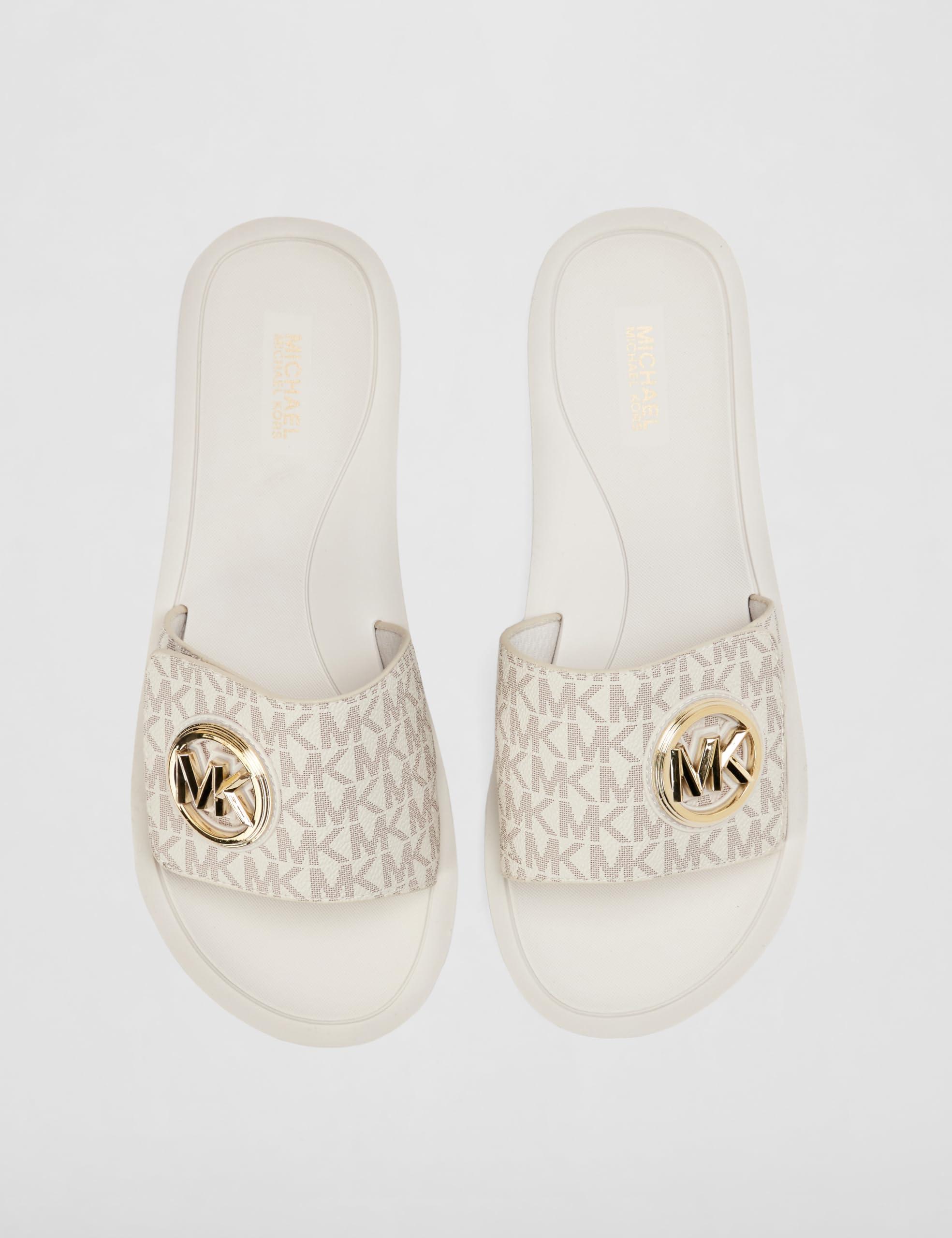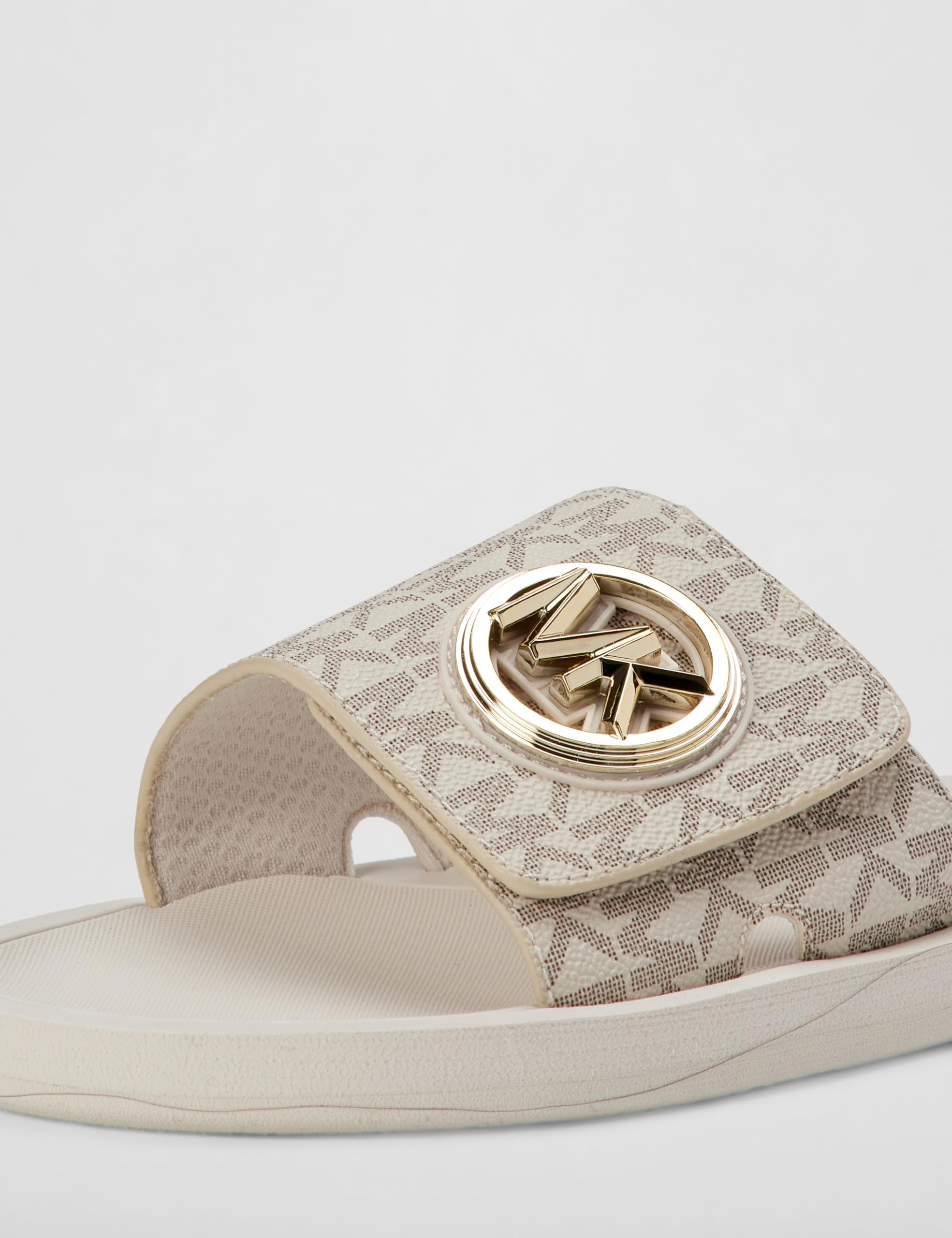 Description Pool slide sandal with MK circle stacked charm hardware on molded footbed.