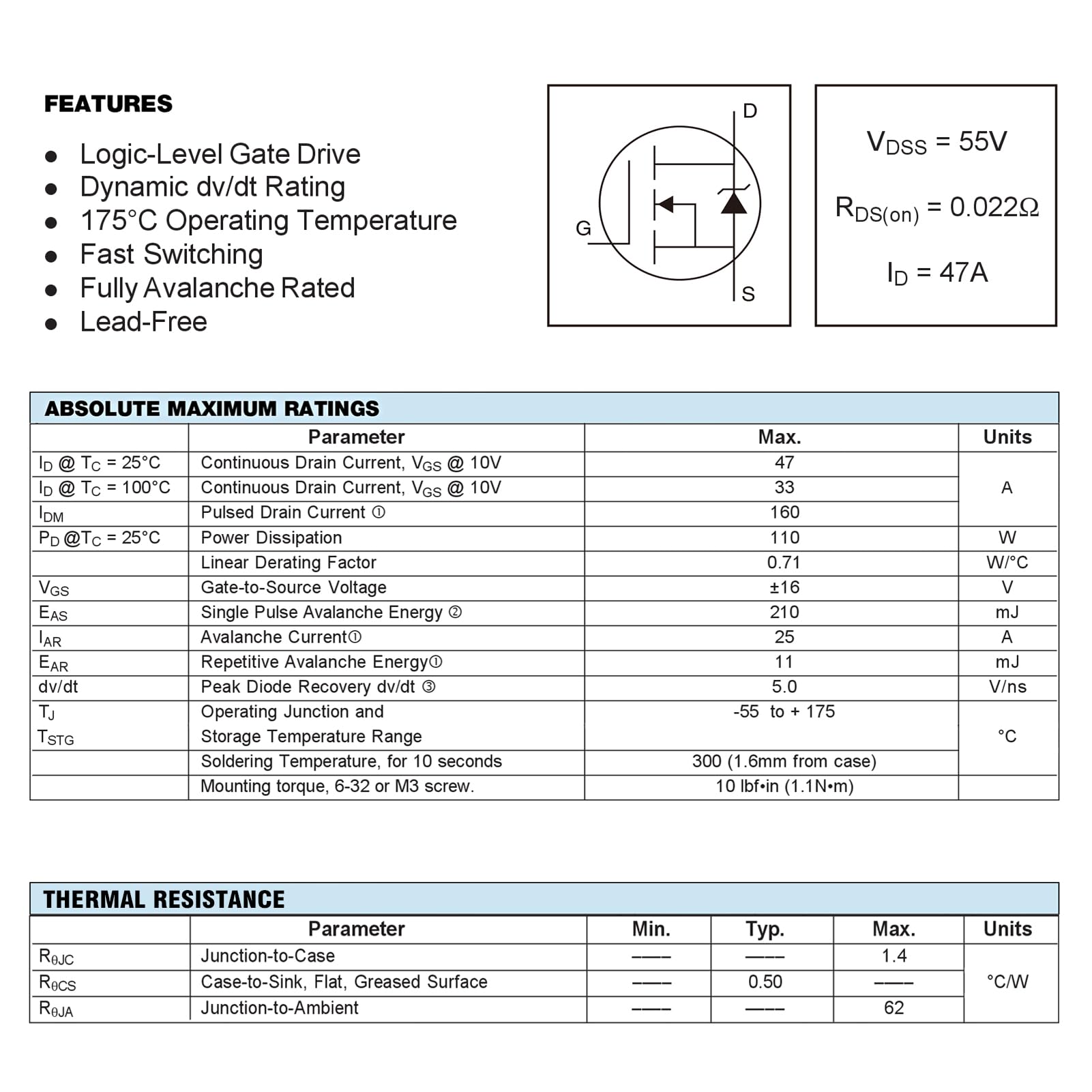 Rated Voltage: 55V ; Rated Current: 47A ; Dissipation Power: 110W.