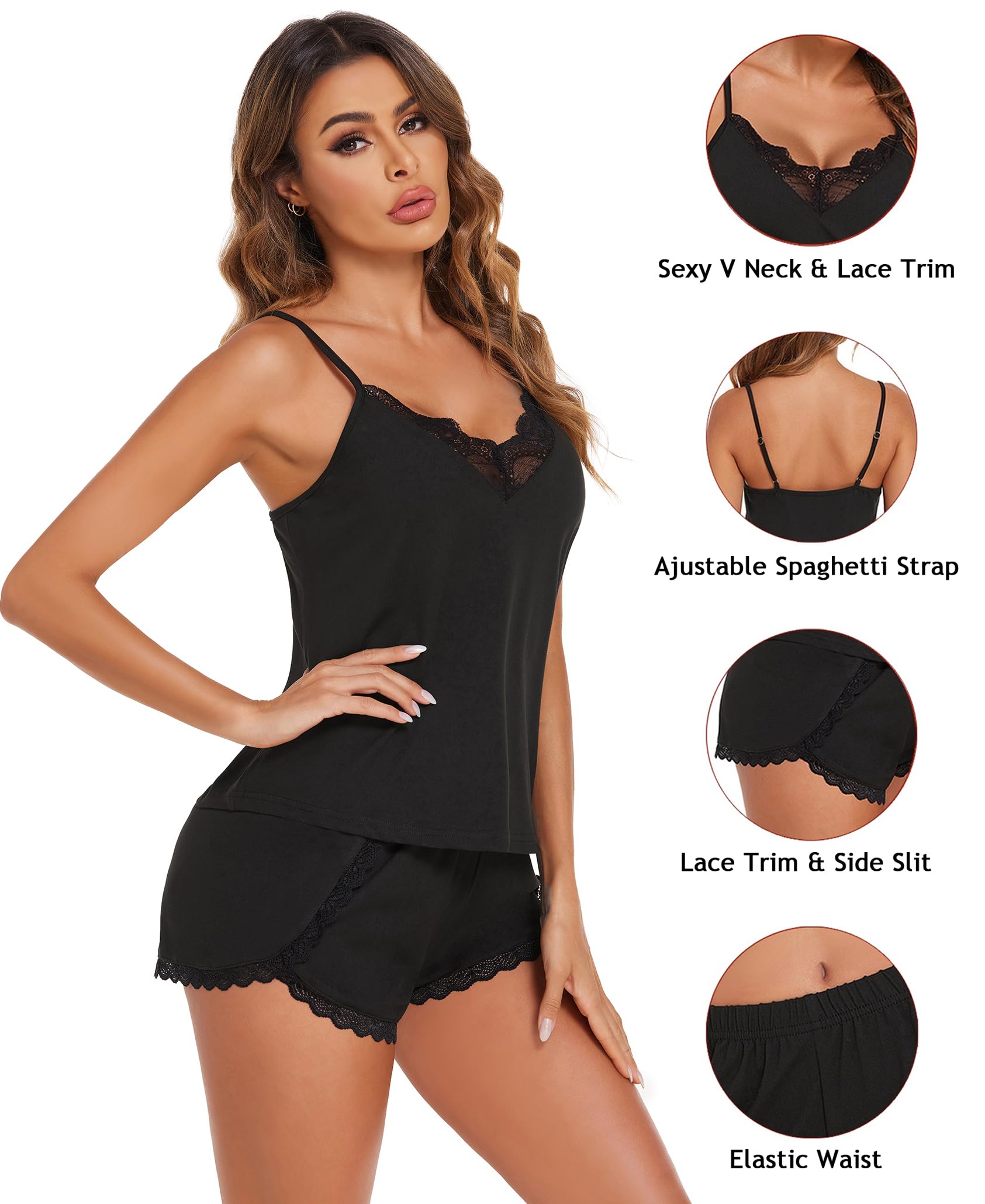【Cami Shorts Set】: The Cami of Pajamas Set for women is designed with sexy v neck & lace trim & adjustable spaghetti strap & camisole for easy wearing and adjustment to the comfort position you want. The shorts designed with elastic waist & lace trim & side slit cutouts for comfortable fit and elegant look