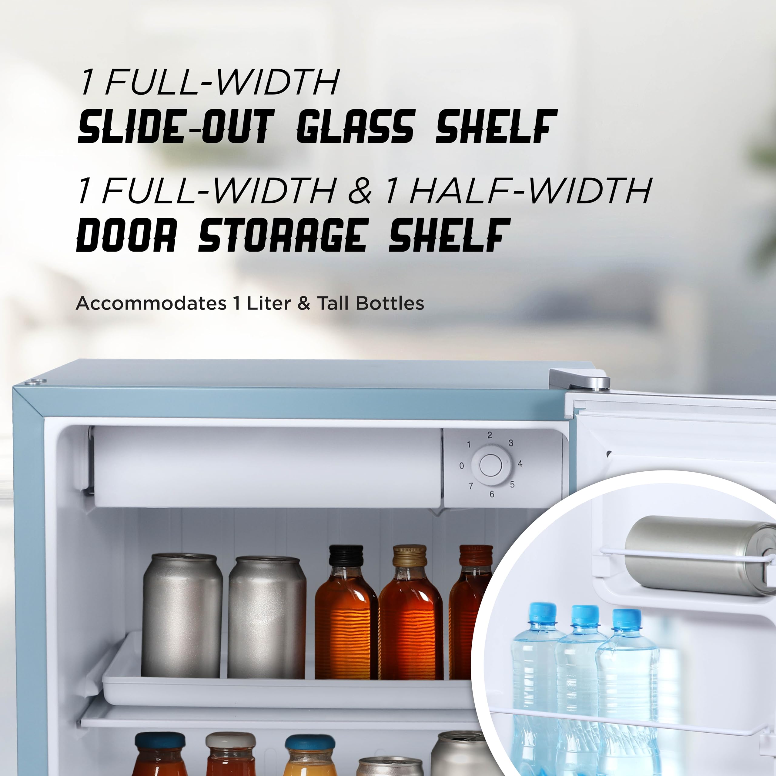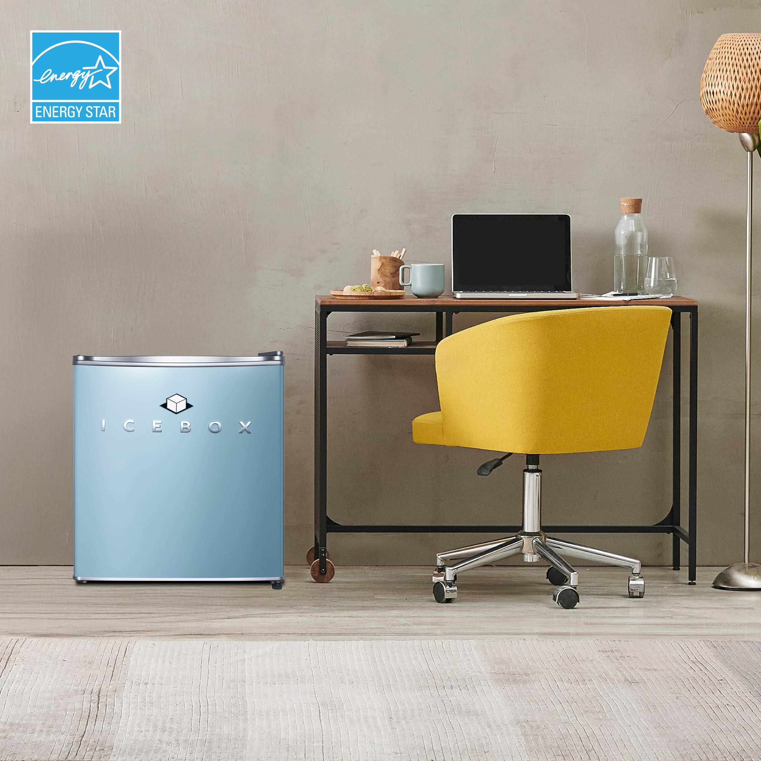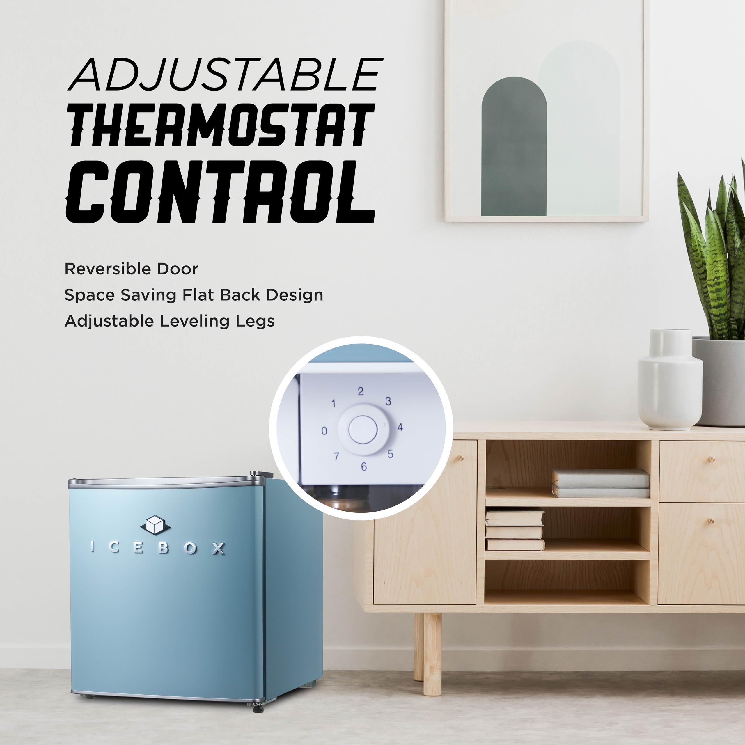ICEBOX 1.7 Cu. Ft. Compact Refrigerator, a perfect solution for those seeking efficiency and style in their food cooling and storage needs. Ideal for dorm rooms, offices, and bedrooms, this dorm fridge with freezer is designed to cater to your limited storage requirements while maintaining a sleek and modern appearance. This versatile mini fridge with freezer compartment offers multiple features that make it a standout choice among mini fridges and compact refrigerators available in the market today. The IceBox small fridge with freezer is equipped with a full-width freezer compartment that includes an ice cube tray, allowing you to enjoy chilled beverages and frozen treats anytime. Its full-width slide-out glass shelf provides ample space for organizing your groceries, while the 1 full-width and 1 half-width door shelf accommodate 1-liter and tall bottles effortlessly. Adjustable thermostat control enables you to set the temperature to your preference for optimal cooling. The reversible door design allows for flexible placement, making it a convenient mini refrigerator for various room layouts. Additionally, the adjustable leveling legs ensure stability on uneven surfaces, making it a practical and adaptable small fridge for office or personal spaces. With manual defrost and a recessed door handle, this compact fridge with freezer is designed for ease of use and maintenance. It utilizes R600a refrigerant, which is both eco-friendly and efficient. Available in four stylish color options, this small refrigerator for bedroom or dorm room is not only functional but also a chic addition to any setting.