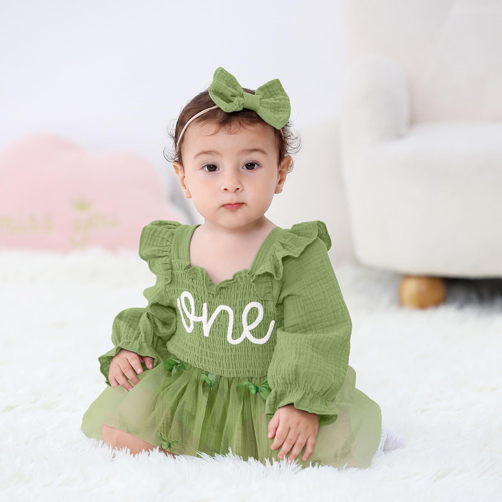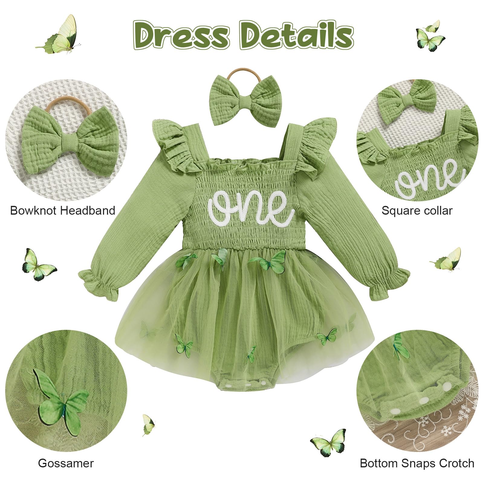 Design: Newborn baby girl playwear romper dress with long sleeve, solid color, multi-layered tulle, Snap leg openings for easy diaper changes, easier morning for novice mother.Cute princess 1st birthday outfit, fashionable and adorable embroidery ONE printed themed birthday clothes perfect for creating beautiful memory of her first birthday.
