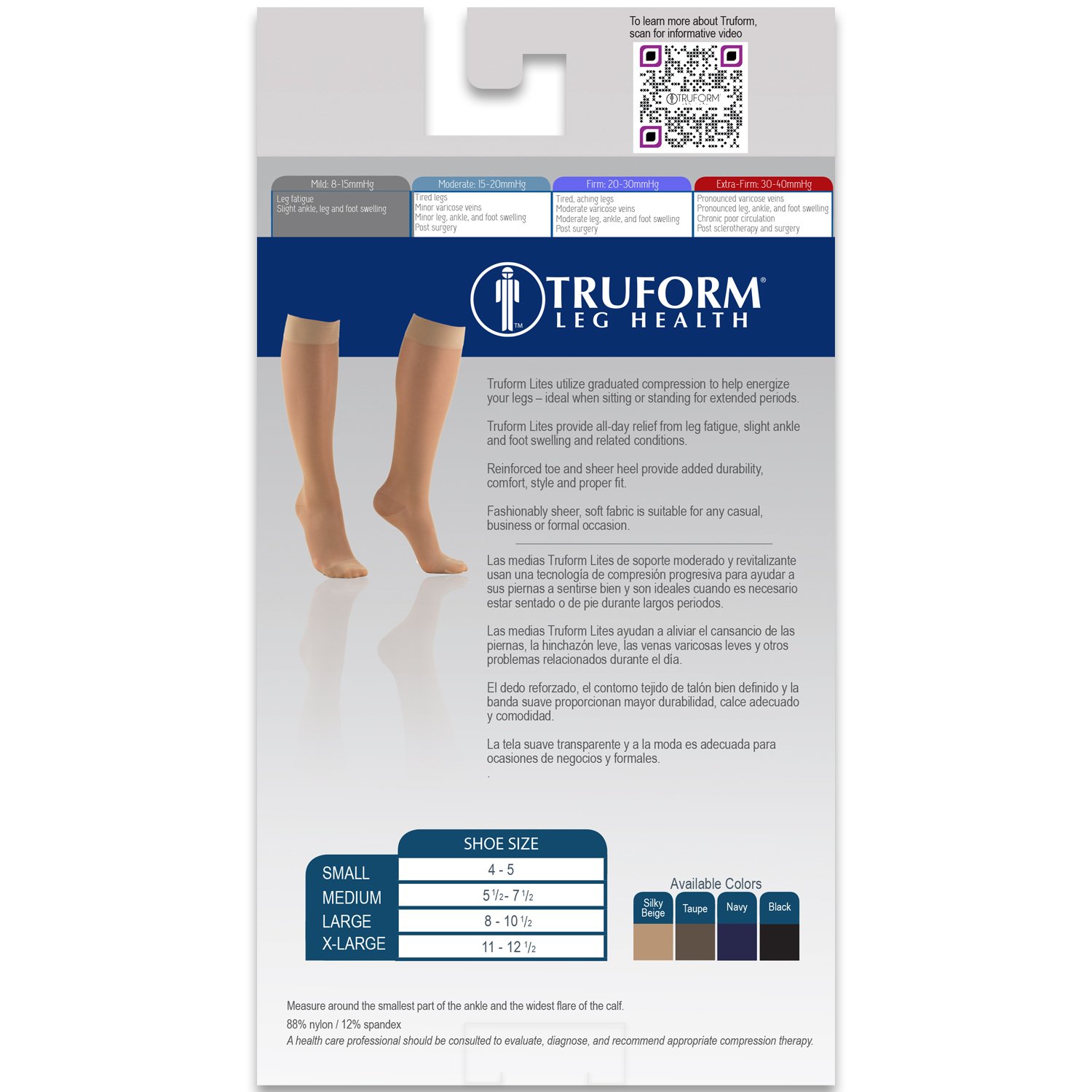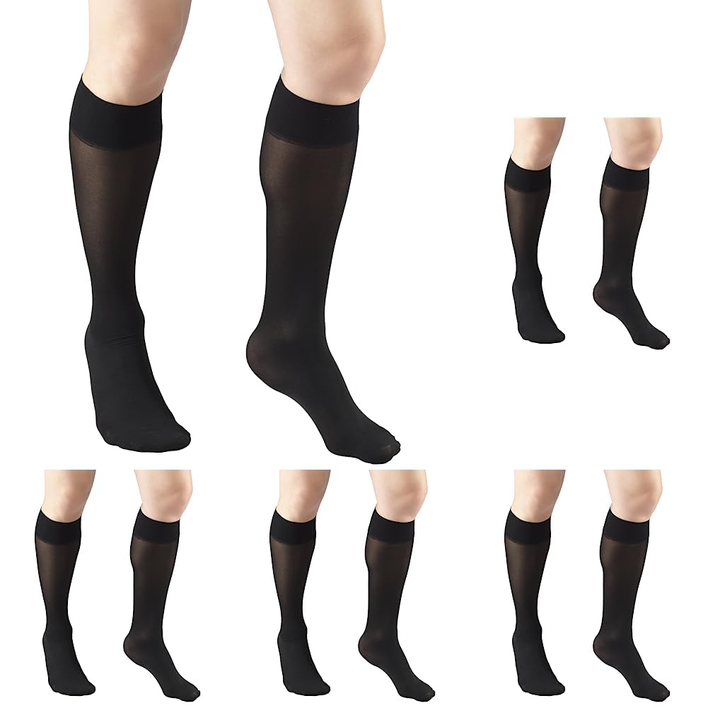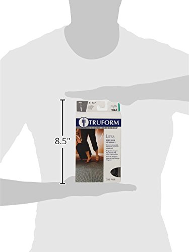Truform Sheer Compression Stockings provide graduated compression to improve circulation and relieve swelling. Made of nylon and spandex, these knee-high stockings feature a soft, breathable top band that won't constrict legs. The lightweight, breathable fabric helps prevent muscle fatigue during extended periods of sitting or standing. The stockings are designed to fit snugly without digging in, thanks to the nylon and spandex construction. The reinforced toe keeps the stocking in place.This 5-pack of black, medium-sized stockings is perfect for Halloween costumes or as a gift. The knee-high height helps relieve swelling and spider veins. The 8-15 mmHg graduated compression helps improve circulation and prevent blood clots. To use, simply pull the stockings on over shoes and dress. No need to measure, these are true to size. Care instructions: Machine wash cold, tumble dry low. Do not bleach. Do not iron.