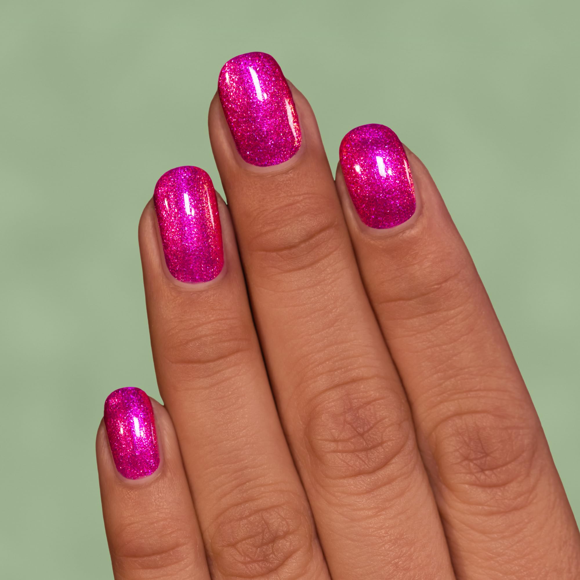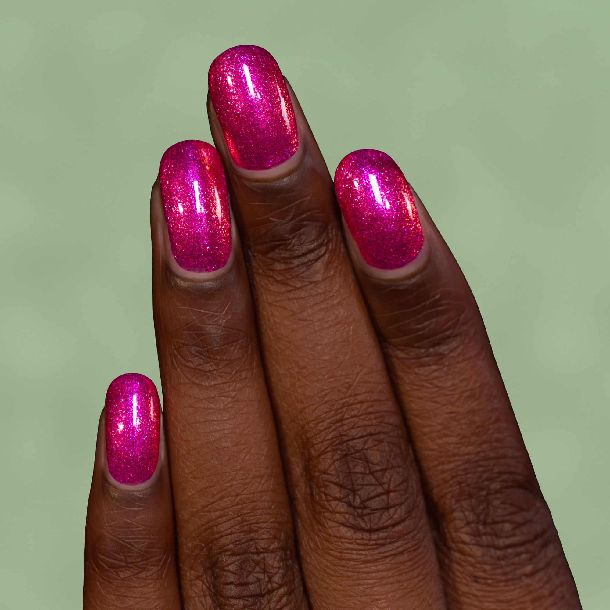 Petals is a vivid magenta nail polish that blooms with the dynamic beauty of wildflowers in late Spring. Embodying the spirit of nature's most vibrant season, Petals captivates with a vivid magenta hue, alive with the radiant dance of wildflowers blooming in late Spring. Shimmering at every angle, Petal’s shimmer showcases a seamless shift in shimmer from romantic pink to warm, sun-kissed orange. Each layer invites the brilliance of a fully awakened flowerbed to your fingertips, transforming your manicure into a floral spectacle of joy. Petals is part of the Wildflowers Collection, a 6 captivating shades, each blossoming with the untamed radiance of a sun-drenched meadow. From nature's own palette, each polish mirrors the vibrant life, serene hues, and dynamic energy of a wildflower field in full bloom. Let the intricate play of color-shifting shimmers and luminous hues take you on a journey through the heart of the meadow, where every shade brings the serene and lively spirit of wildflowers to your fingertips. We recommend 2 coats for the ideal finish