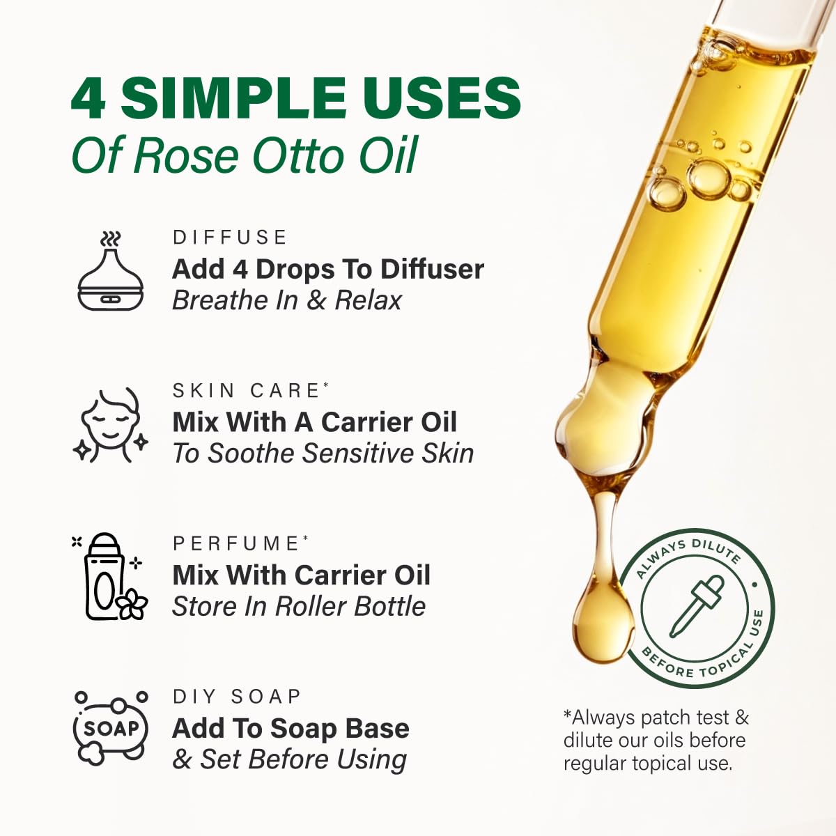 Serene moments that soothe. Imagine a peaceful retreat at home, using rose otto essential oil in your diffuser. It envelops your space in a calming, authentic rose aroma that eases and enhances tranquility, even in high-pressure settings.