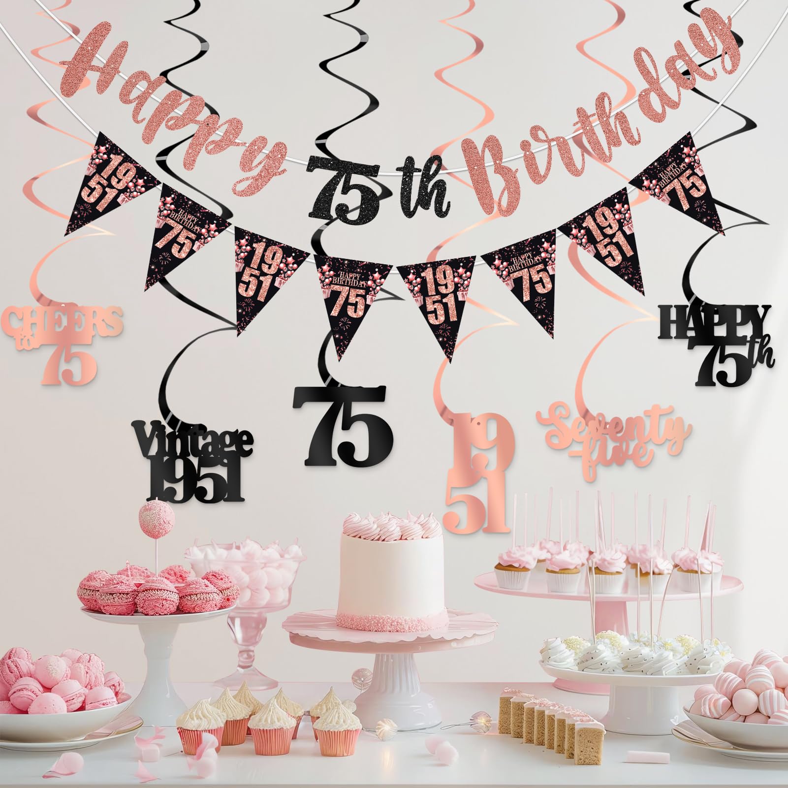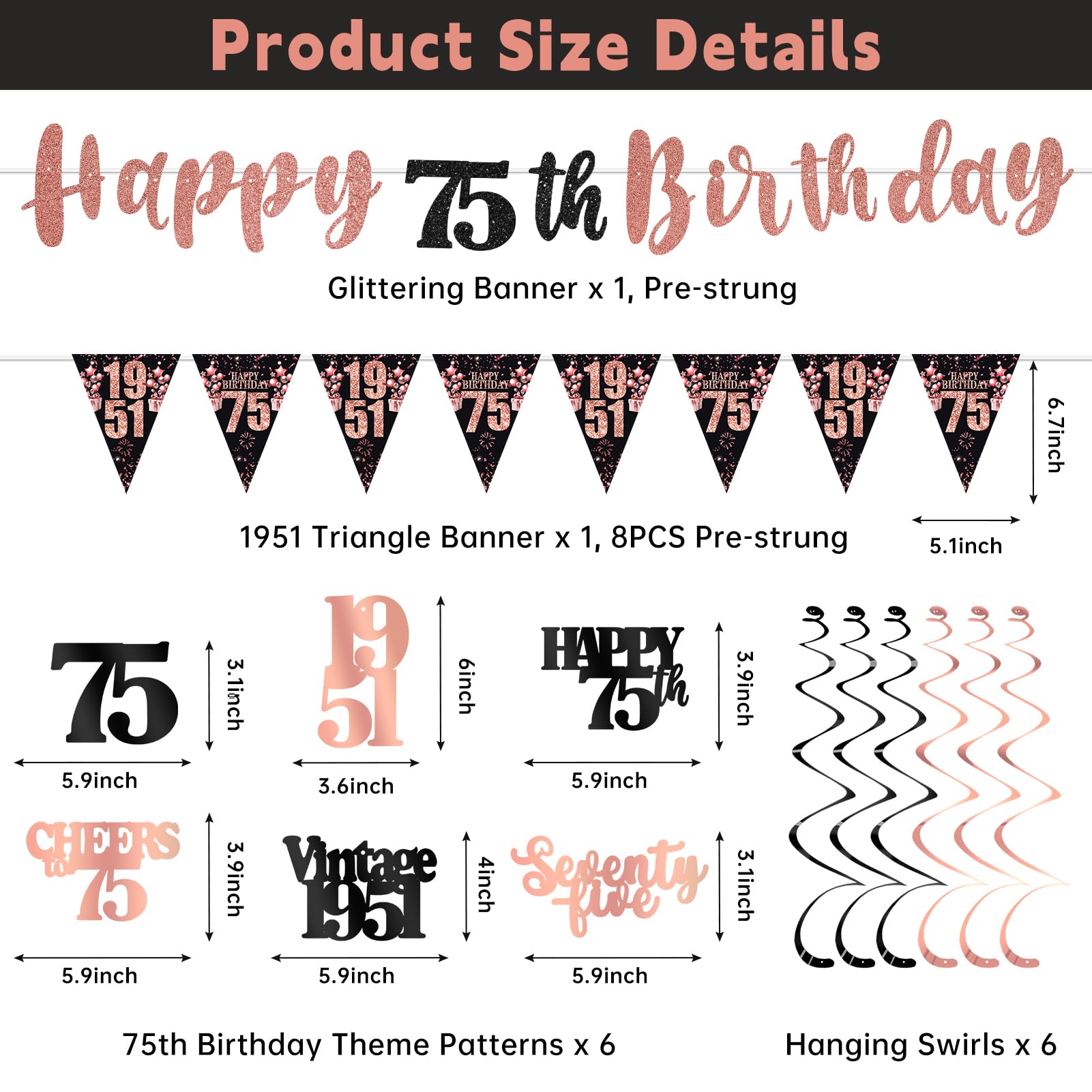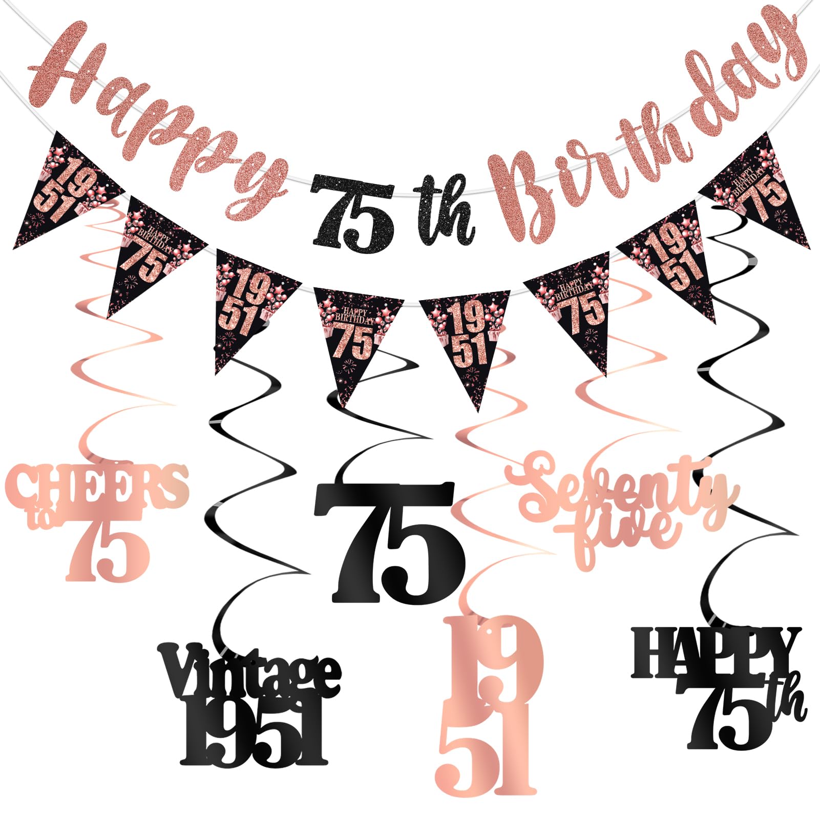 You Will Get: Rose gold 75th birthday decorations kit, including 1pcs "happy 75th birthday" banner, 1pcs 1951 75th birthday triangle banner, 6pcs seventy-five birthday themed hanging swirls, which are suitable for the 75 th birthday party