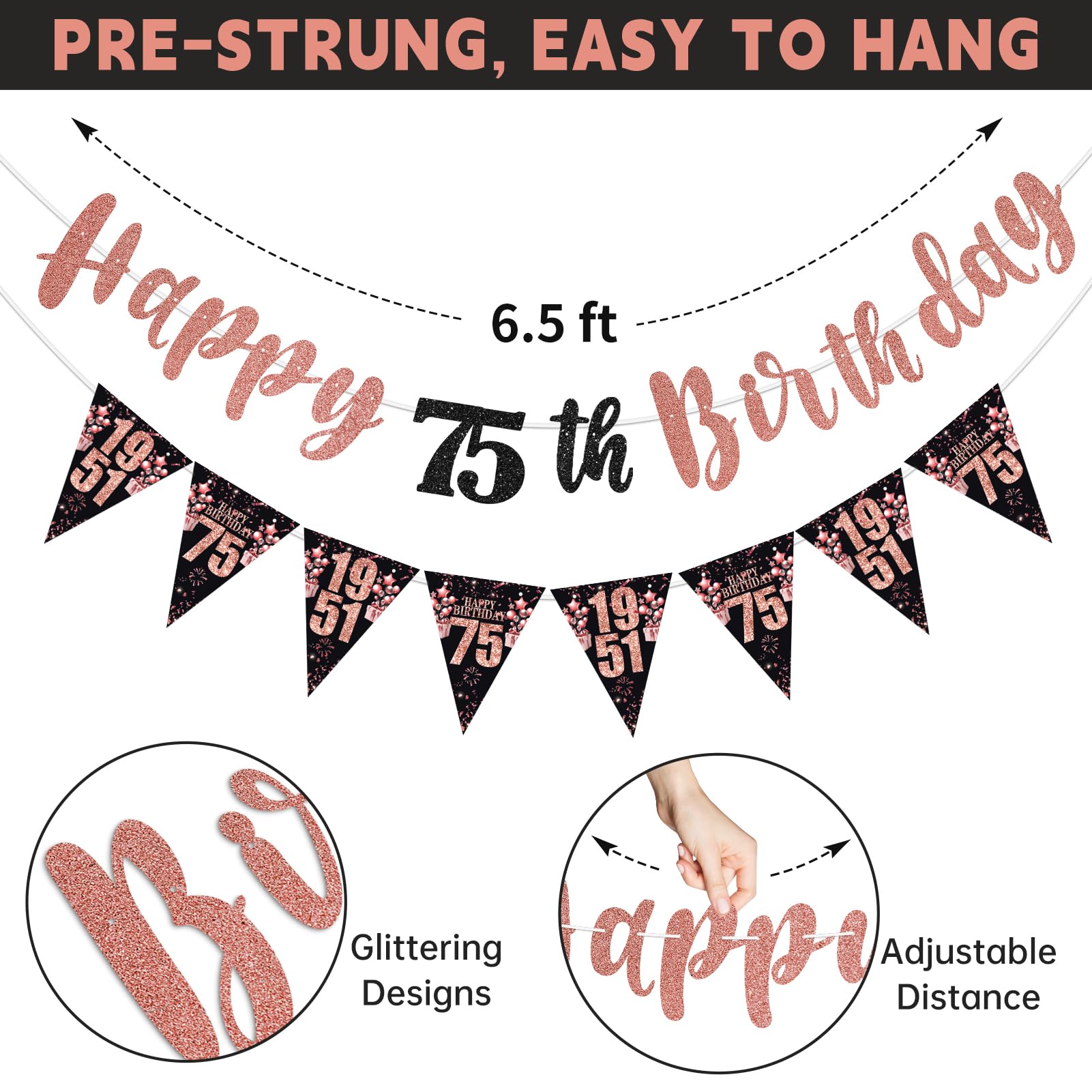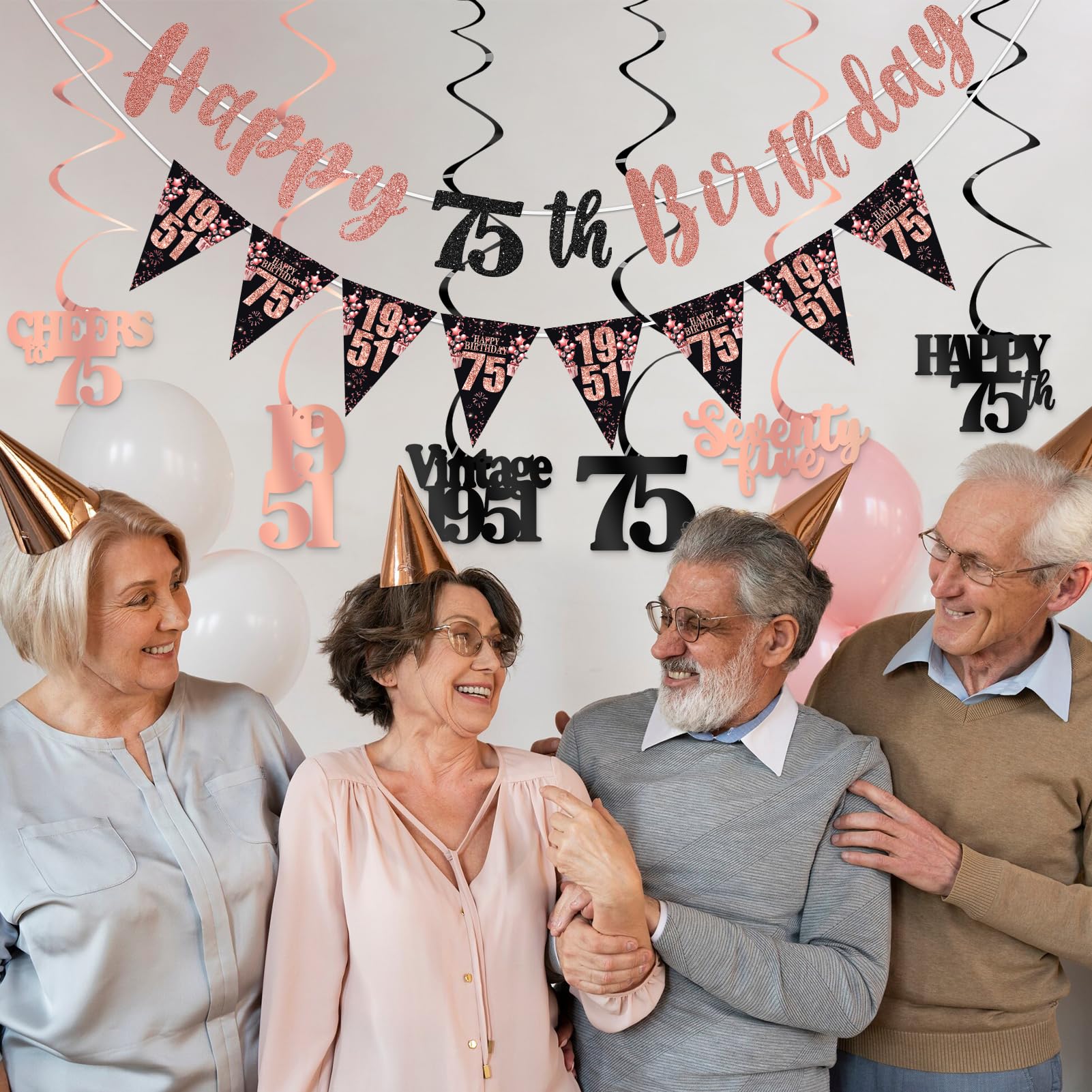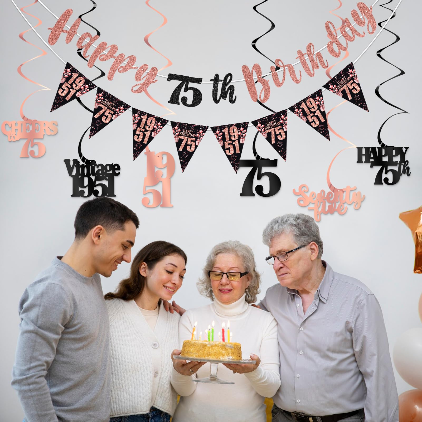 You Will Get: Rose gold 75th birthday decorations kit, including 1pcs "happy 75th birthday" banner, 1pcs 1951 75th birthday triangle banner, 6pcs seventy-five birthday themed hanging swirls, which are suitable for the 75 th birthday party
