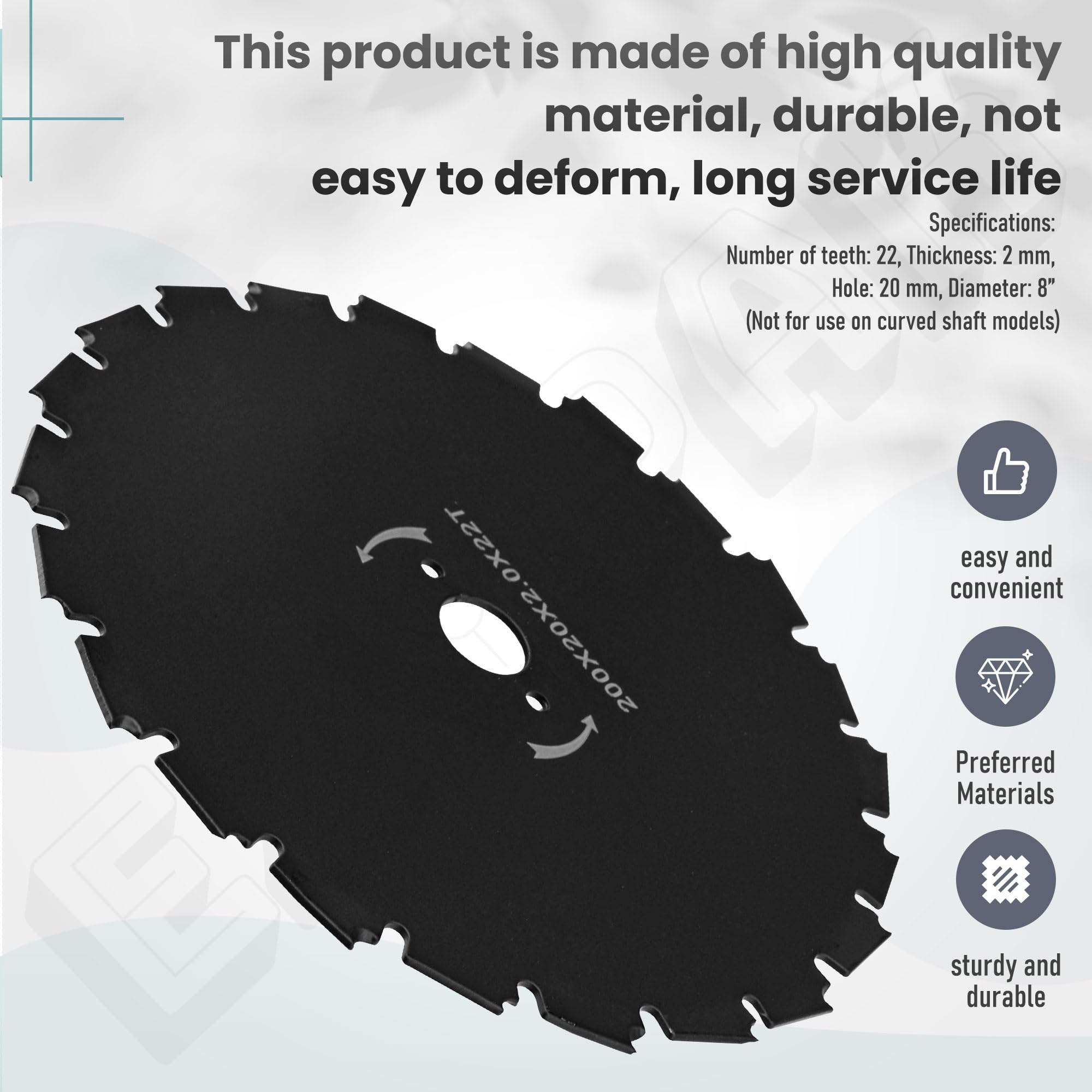 Specifications: Number of teeth: 22, Thickness: 2 mm, Hole: 20 mm, Diameter: 8” (Not for use on curved shaft models)