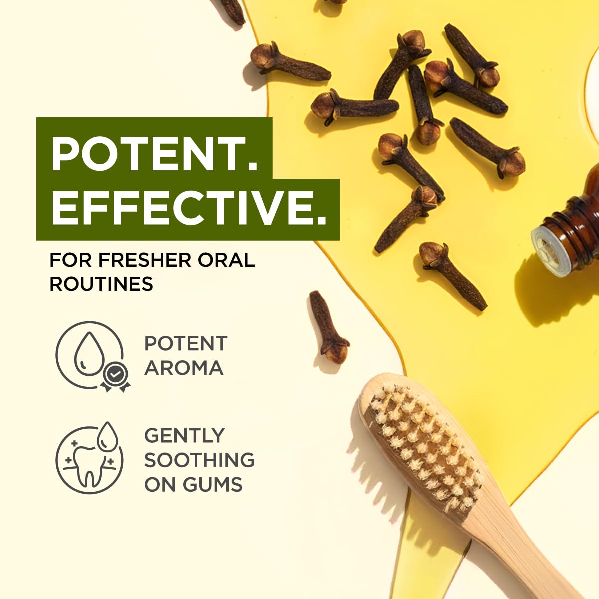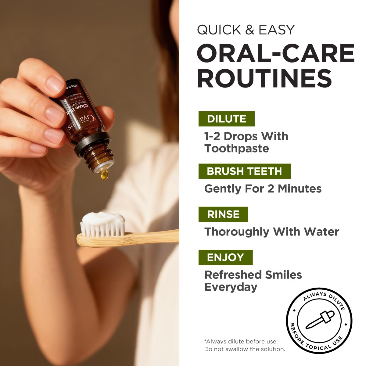 Clove oil for teeth and gums. Oil of cloves is known for its potentially soothing properties for dental care. Dilute 1-2 drops of clove oil for tooth with a carrier oil & apply directly to affected areas with a cotton ball. Do not swallow.