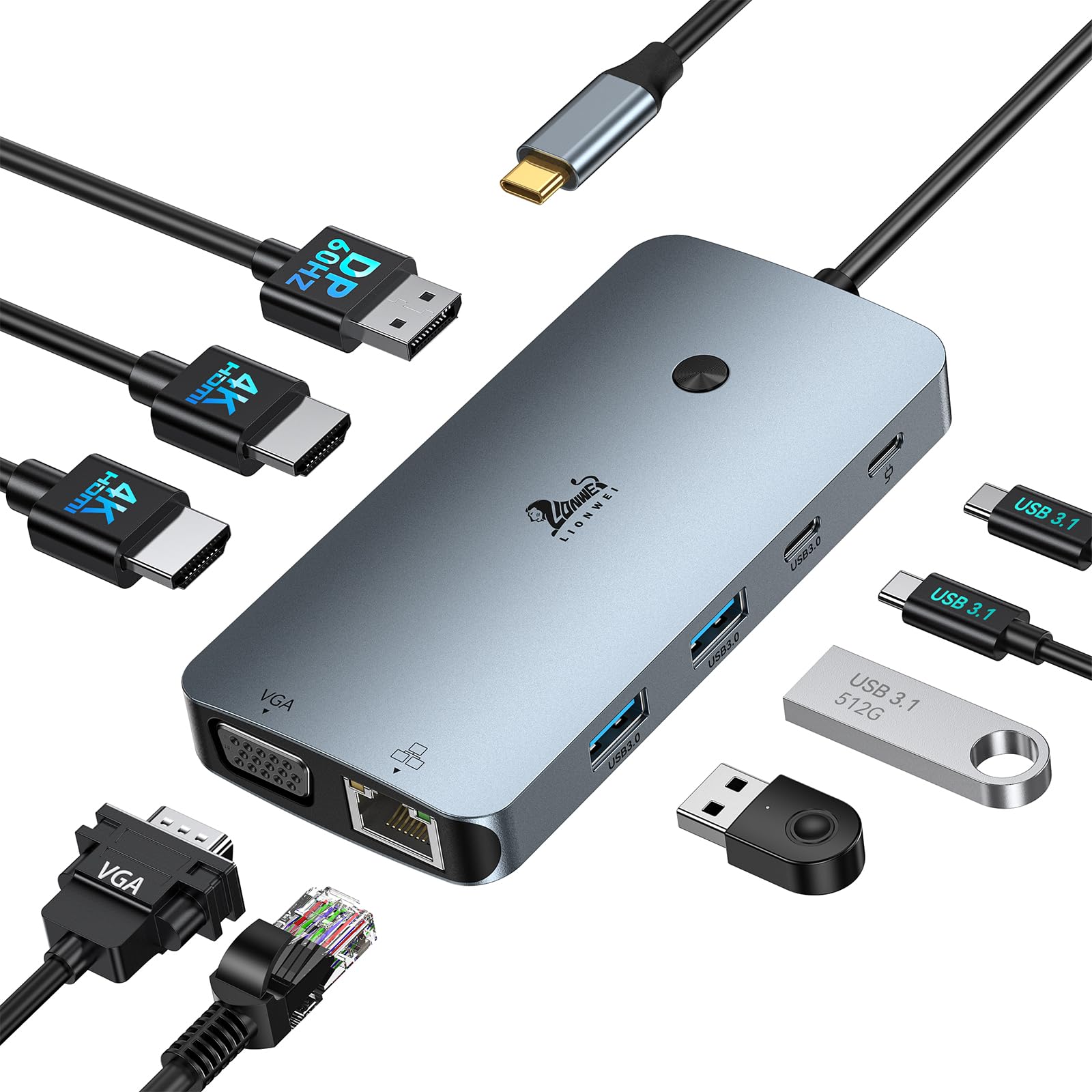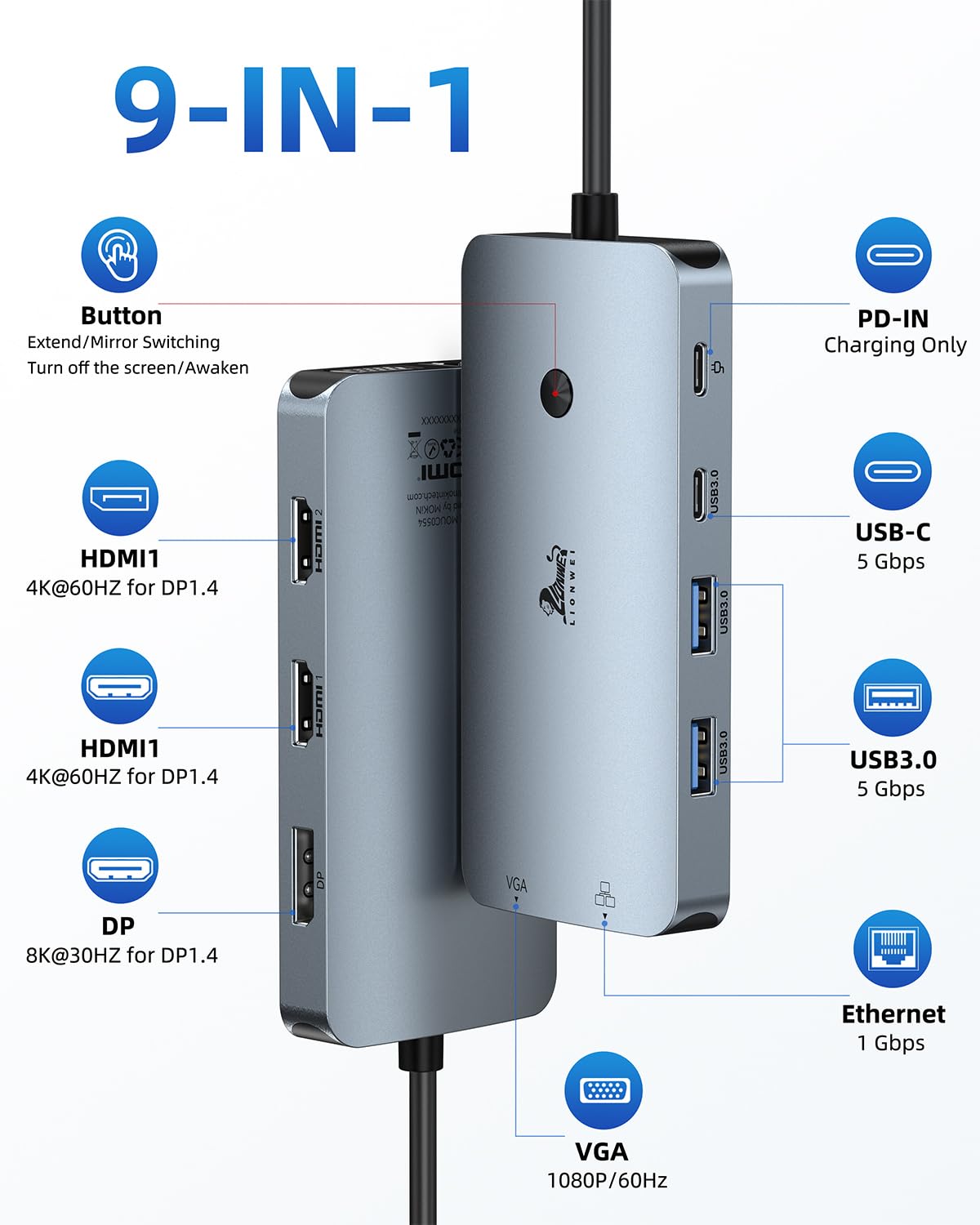 【9 in 1 USB C Hub with Button】Plug and play, no need to install software or drivers. With this multiple adapter docking station, you get 2*4K HDMI, DisplayPort, and the VGA Port, 100W PD charging port, 2*USB-A 3.0, 1*USB-C 3.0, 1000Mbps Ethernet port