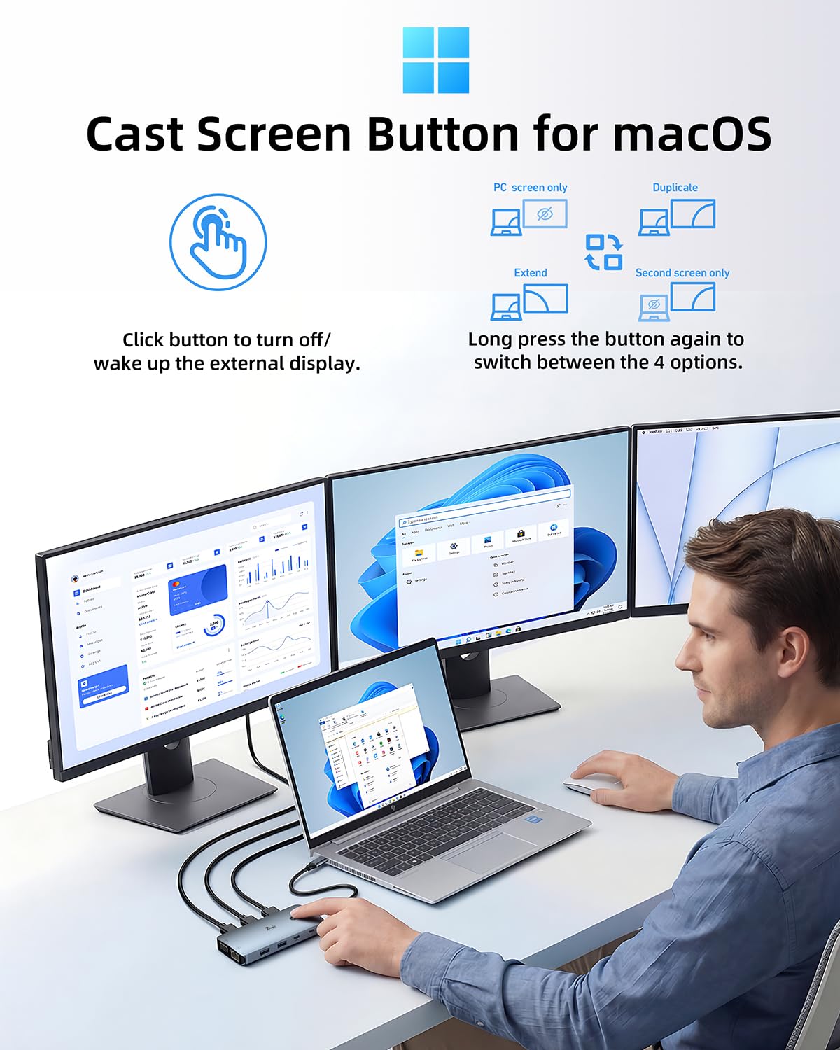 【Data Transfer & PD Charging】This laptop docking station with PD charging port support 100W PD Charging. USB 3.0 A/C up to 5Gbps, whether your device supports USB A or USB C, it can transfer data quickly
