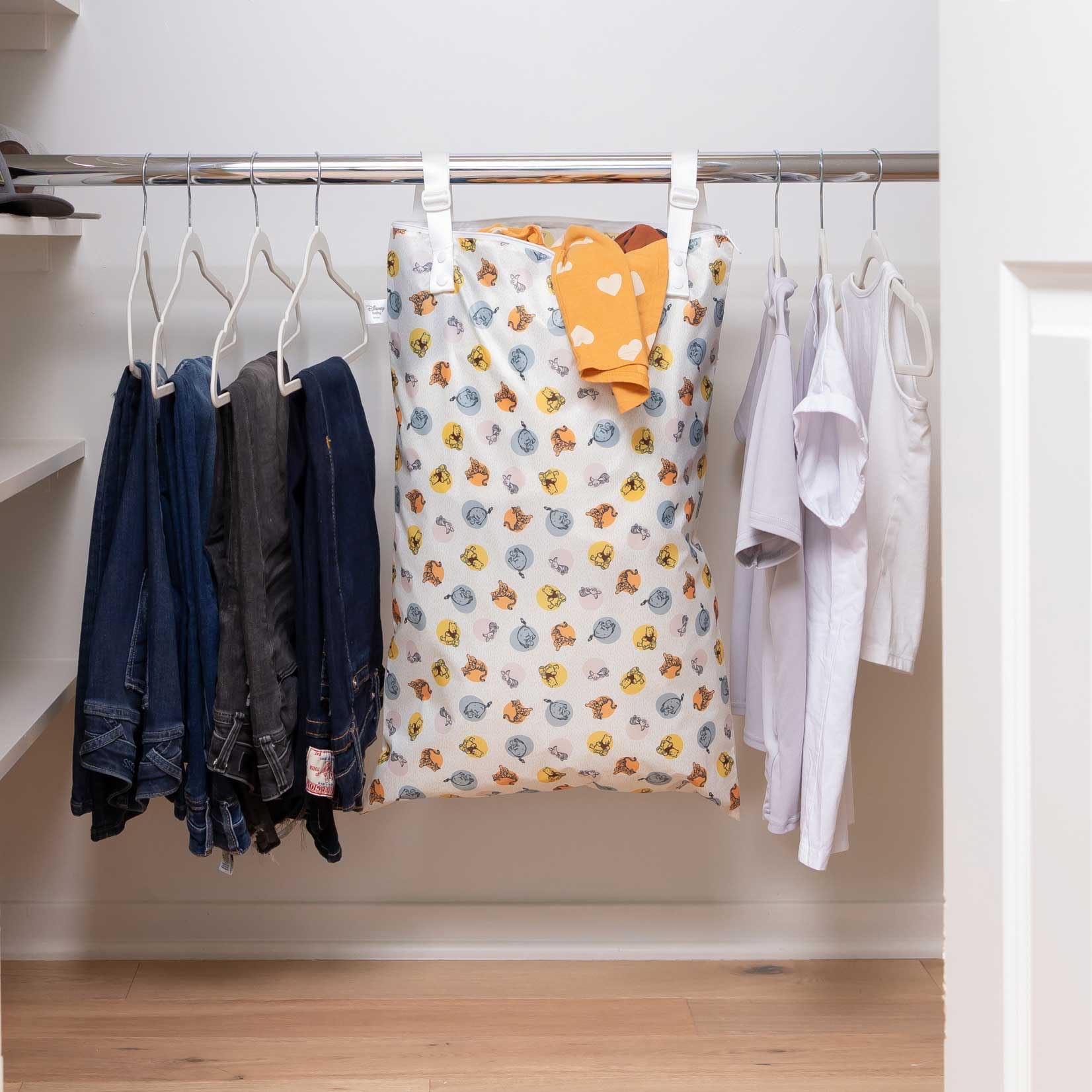 HANGING WET BAG – Essential for travel and laundry; hang in closet, playroom, nursery or hotel closet rod; pack dirty clothes, tote wet swimsuits, diapers and more; alternative to large hampers, these totes can fold and lay flat when not in use