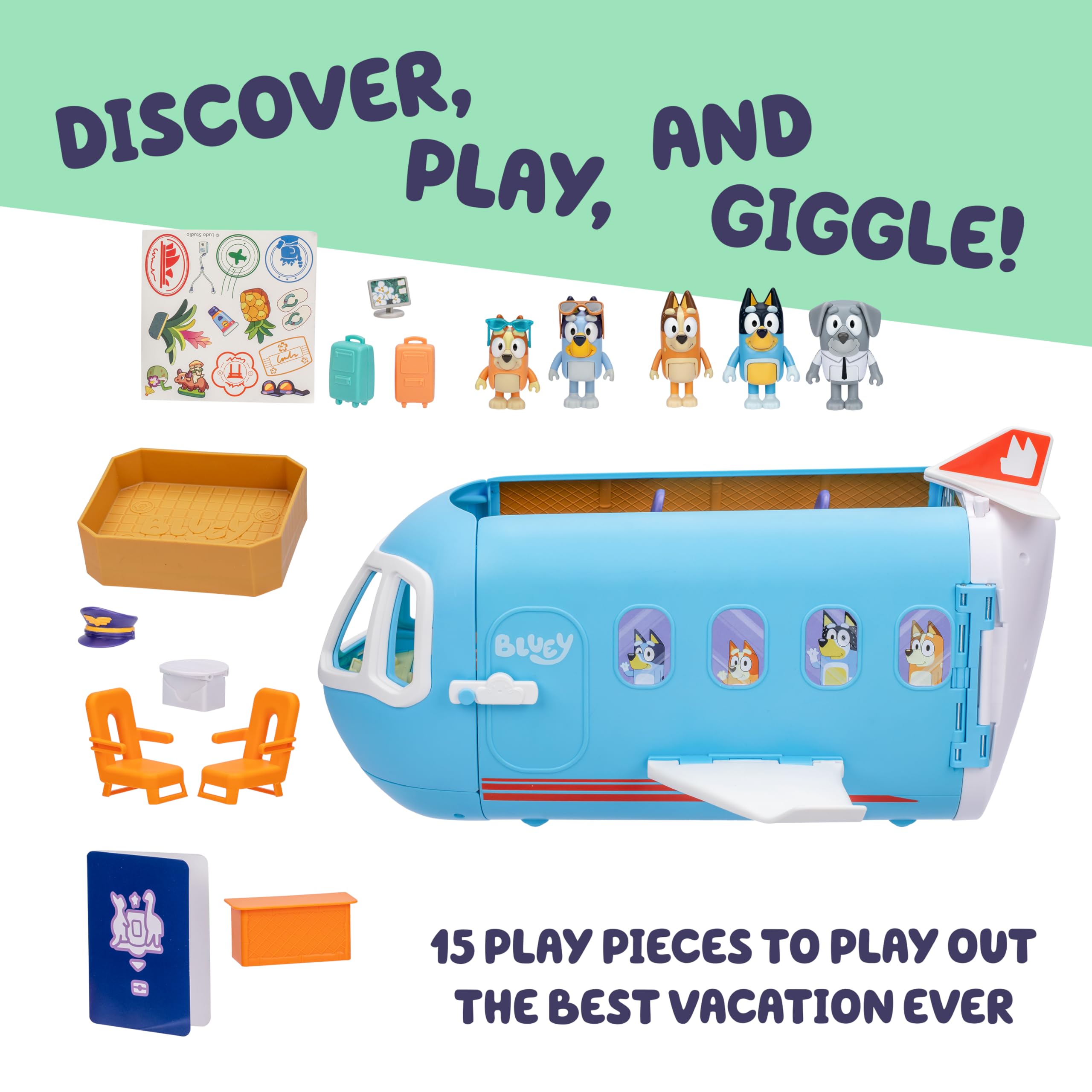 15 Fun Play Pieces Inside: This toddler airplane toys comes with 15 total accessories to fuel play, including figures and travel-themed items that enhance the fun, making this transforming set the perfect gift for Bluey fans aged 3 and up