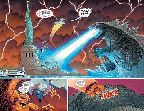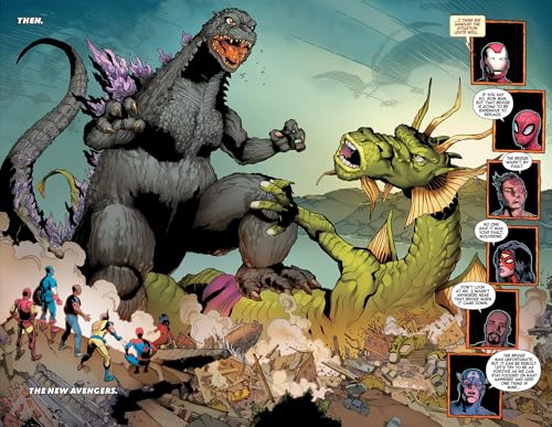 The King of the Monsters Godzilla returns to Marvel Comics to battle every Marvel legend: the Fantastic Four, Hulk, Spider-Man, X‑Men, Avengers, and Thor across the decades! An all star talent extravaganza with Ryan North, Gerry Duggan, Joe Kelly, Fabian Nicieza, David Walker, Jason Aaron, John Romita Jr., Giuseppe Camuncoli, Nick Bradshaw, Emilio Laiso, Georges Jeanty, and Aaron Kuder Godzilla returns to Marvel Comics at last, and will face off against Marvel's greatest heroes in a showdown that will span all eras of both the Marvel Universe and Godzilla's own long history! Godzilla vs. The Fantastic Four (Classic Era) The original classic Fantastic Four vs the raw power of Godzilla Godzilla vs. The Hulk (Vintage Era) The green skinned goliath of the 70’s vs a unique version of Godzilla Godzilla vs. Spider-Man (Black Costume Era) The Iconic Black Costume Spider-Man against the explosive 80s Godzilla Godzilla vs. The X-Men (X-Men Mutant Genesis Era) The intensity of the 90’s X-Men vs the fury of Godzilla Godzilla vs. The Avengers (New Avengers Era) Modern heroes the New Avengers battling the turn-of-the-new century Godzilla Godzilla vs. Thor (Modern Era) The immortal God of Thunder Thor will face the overwhelming adversary Godzilla in the tumultuous era of the present. In the first round, the King of the Monsters takes on Marvel’s First family! The Fantastic Four know a thing or two about fighting titanic threats, but Godzilla is something else entirely! And then there’s an all-new version of one of Godzilla’s deadliest adversaries to contend with! You know it’ll be clobberin’ time — but for who?! Plus: Godzilla resurfaces again and again to take on the Hulk, the Avengers, the X-Men, Thor and a majorly-outside-his-weight-class Spider-Man!