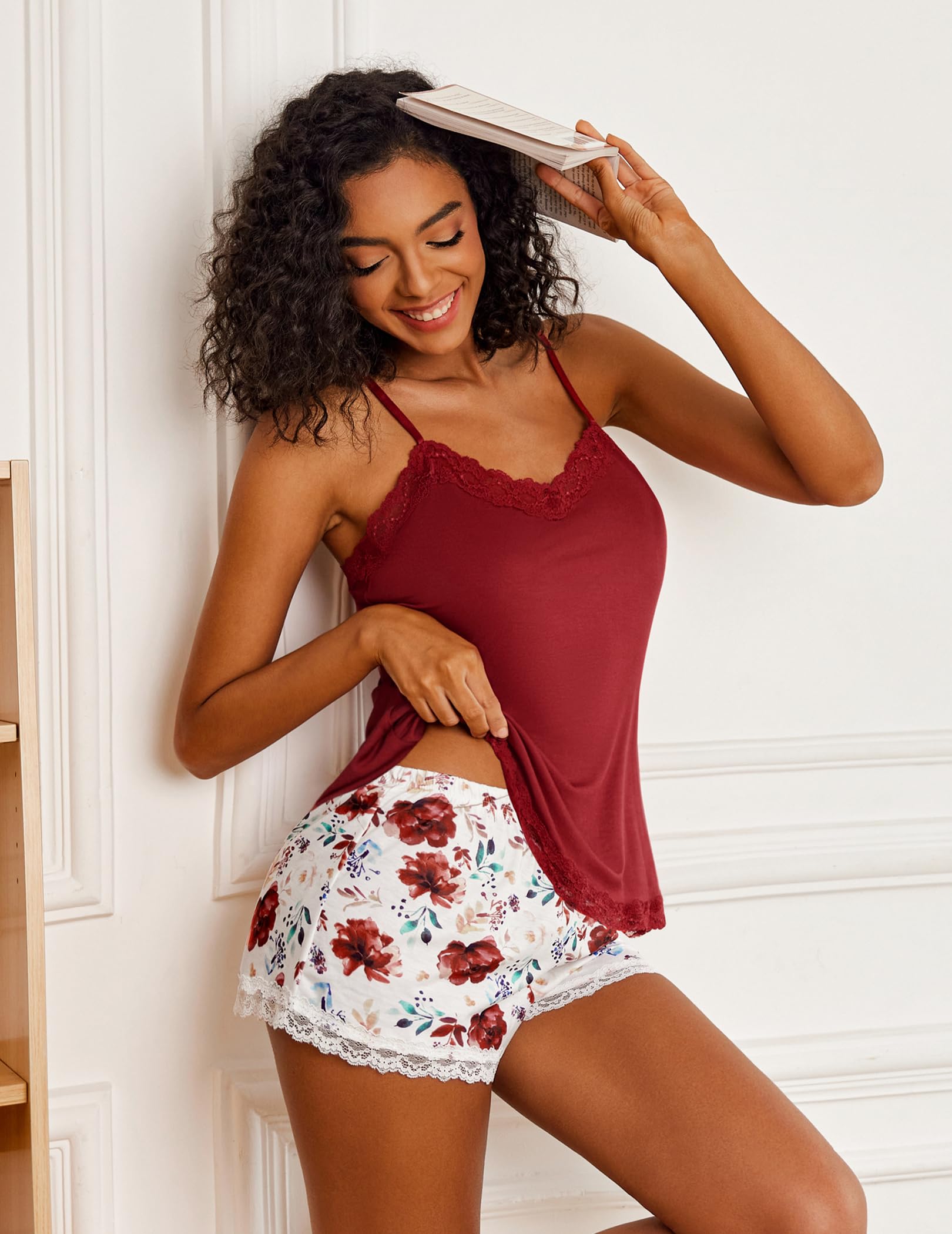 Cami pajama set women shorts featuring a plunging v neck, decent lace trim and adjustable shoulder straps, simple and stylish, shows off your body curves in nice coverage way