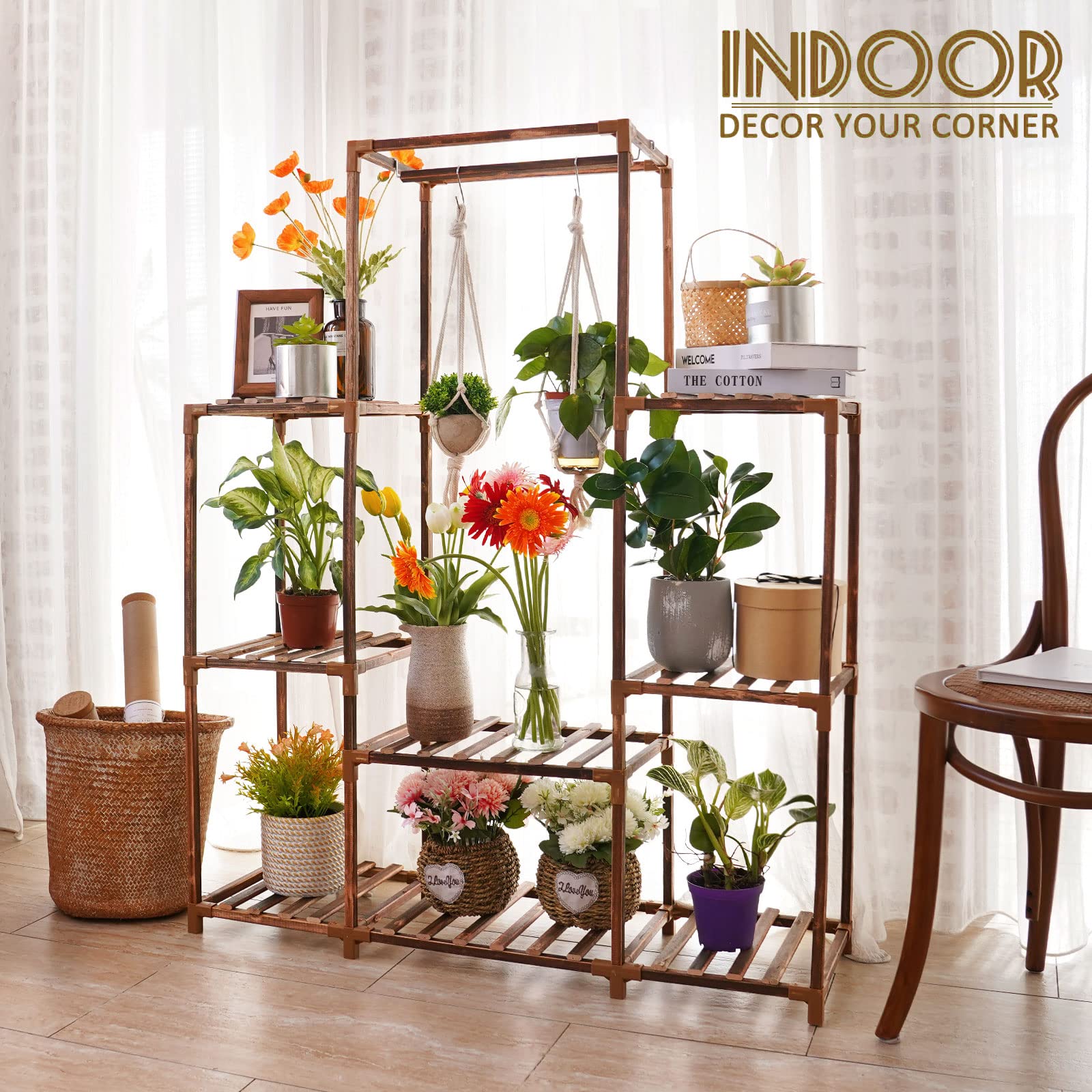 【100% Pine Wood, Sturdy & Durable】 The plant racks are made of high-quality pine wood and carbonized at high temperatures. More durable and easy to clean. No painting surface, healthy and eco-friendly, so the indoor plant stand is very safe for families with children and pregnant women. And the corner plant stand can be used indoors and outdoors.