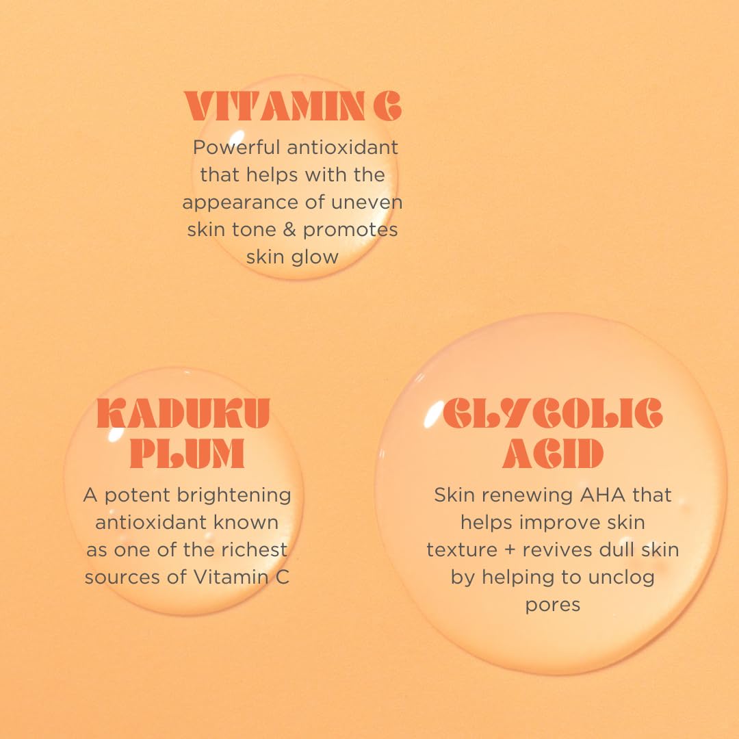 SKIN LOVING INGREDIENTS including Vitamin C which helps to brighten and even out skin tone, Kakadu plum which is a superfood with the highest natural source of vitamin c to help even out the appearance of skin tone and texture, and Vitamin E that works as both a humectant (helps absorb water into the skin), and an emollient (helps trap water in the skin).