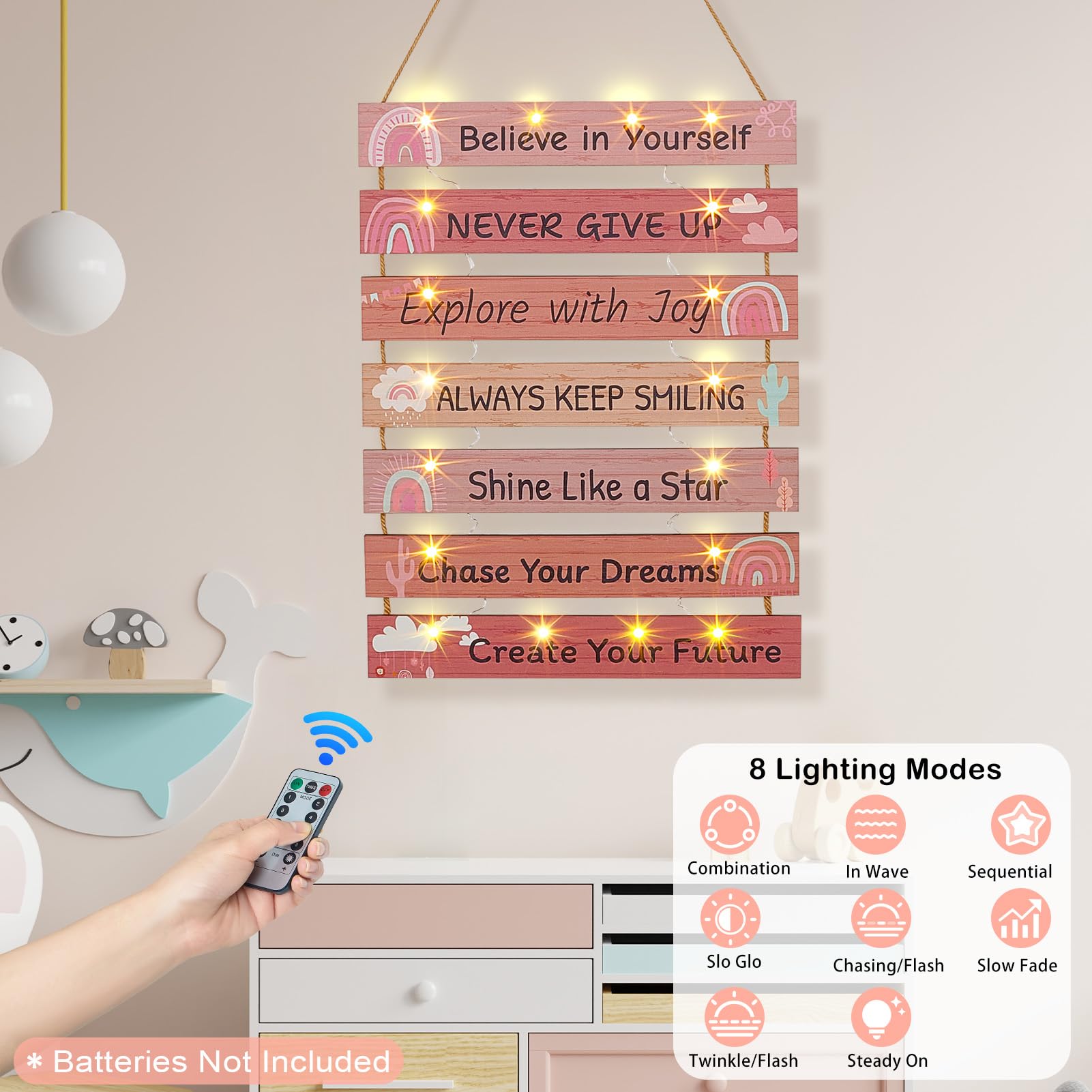 Package: The play room decor for kids package includeds 1 pcs girls room decor board, 1 pcs LED light with empty battery box (not including batteries), 1 pcs remote control (not including batteries), both do not including batteries, need to be purchased by customers themselves