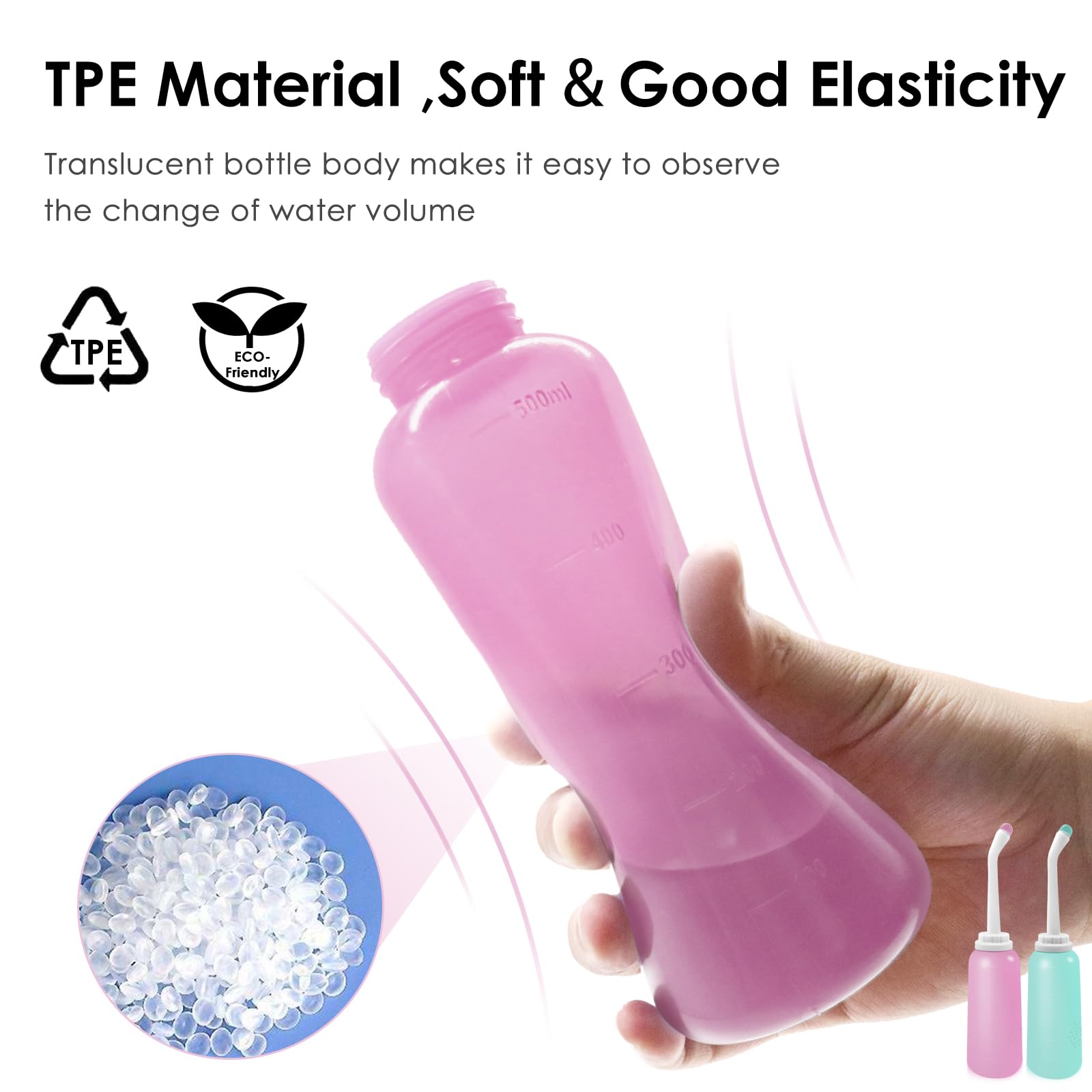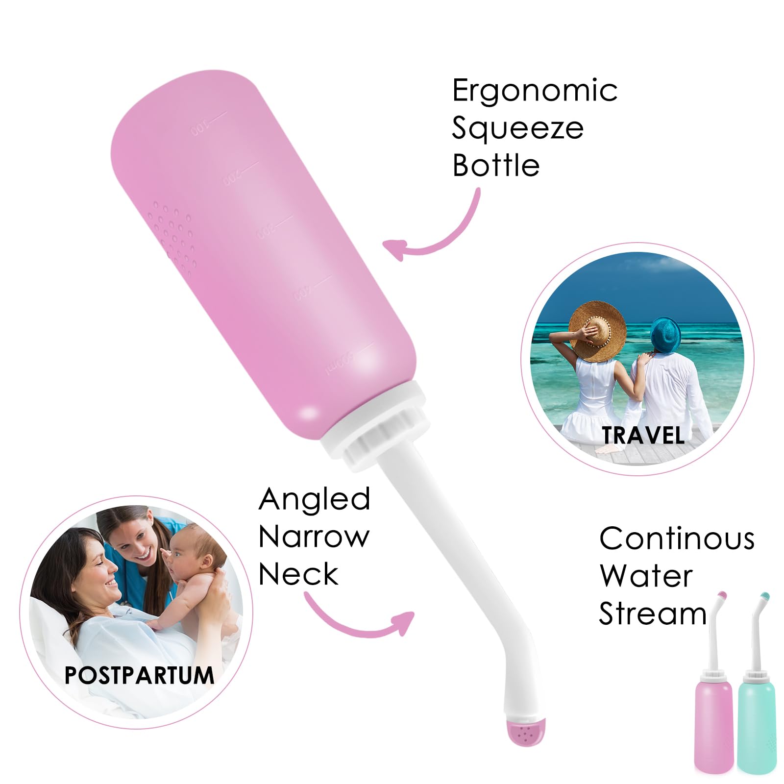 MAKE CLEANING EASIER: Angled neck design with 2 nozzle spray uses hydraulics to ensure a steady flow of water to the area, handheld size bidet bottle is portable and easy carrying, perfect for travel and personal care, feminine cleansing, momwasher, childbirth, baby registry search gift for new mom, labor & delivery hospital bag.