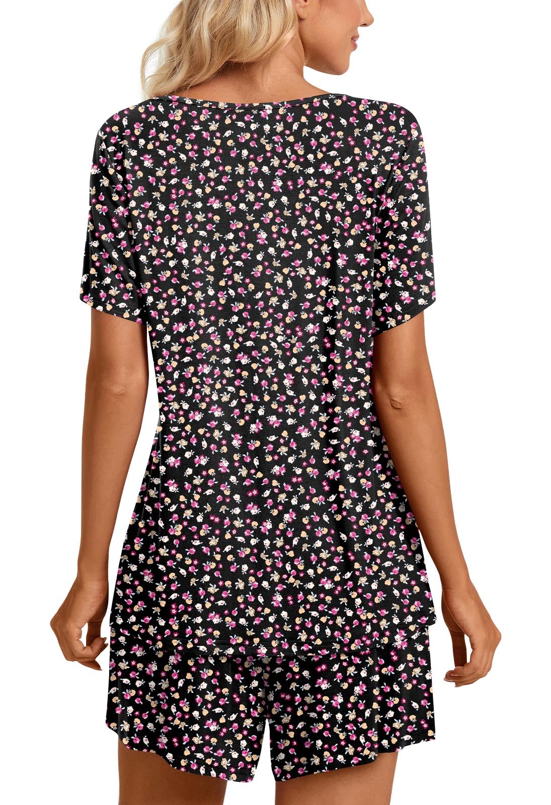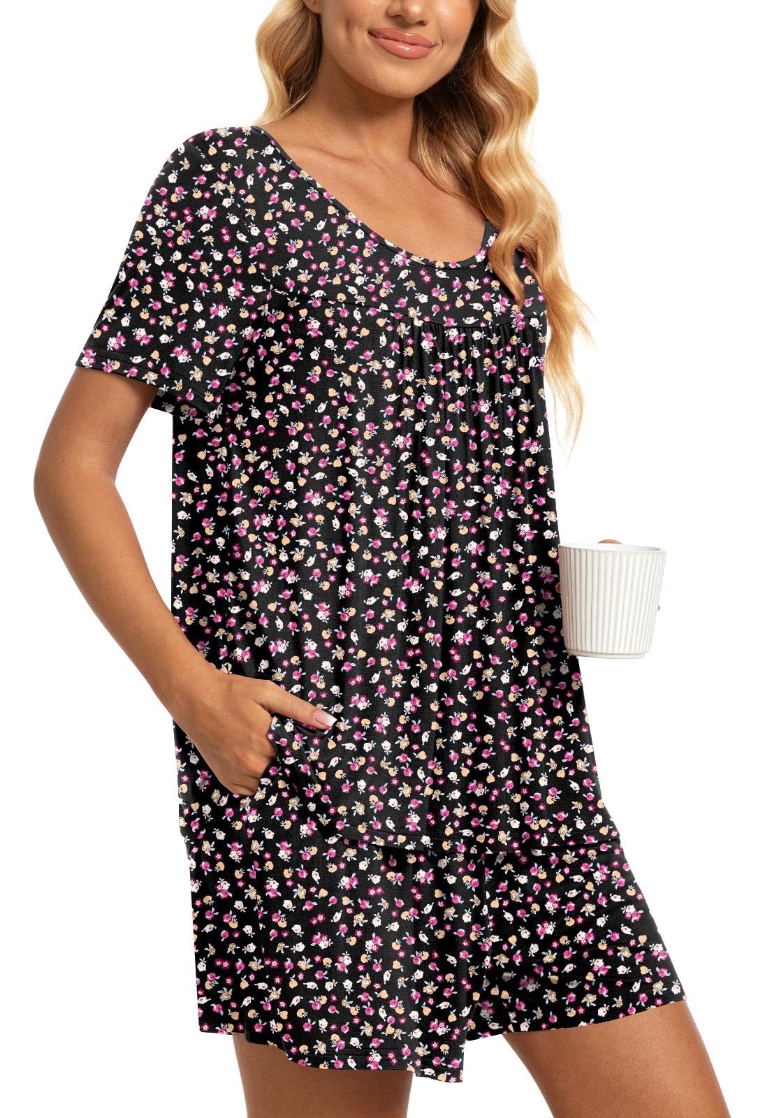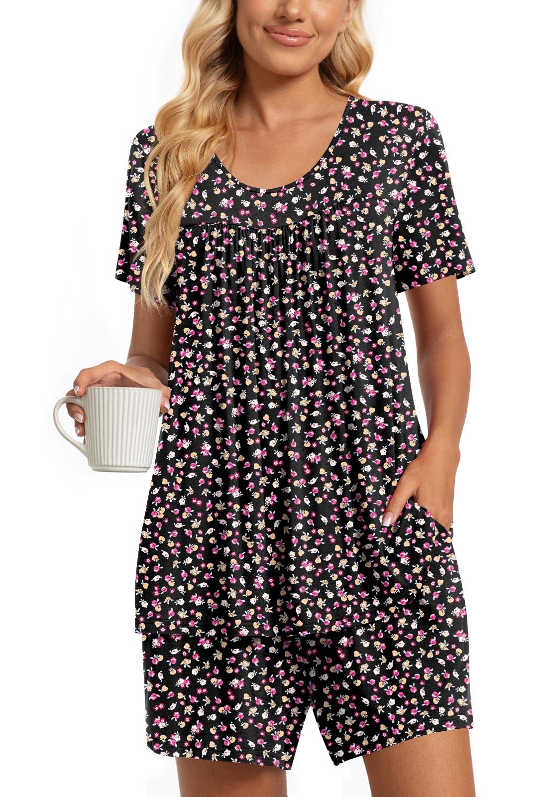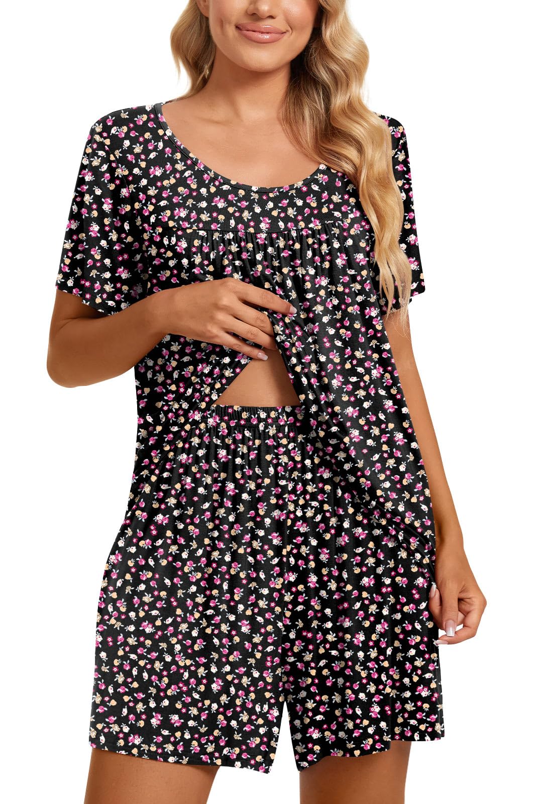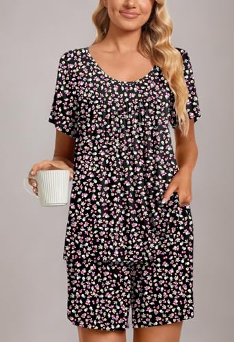 Fashion-Simple Design: Cute two piece outfits, short sleeve tops, soft nightwear, scoop neck and front pleated detailed design. Elastic waistband shorts, casual loose comfy, graceful and easeful