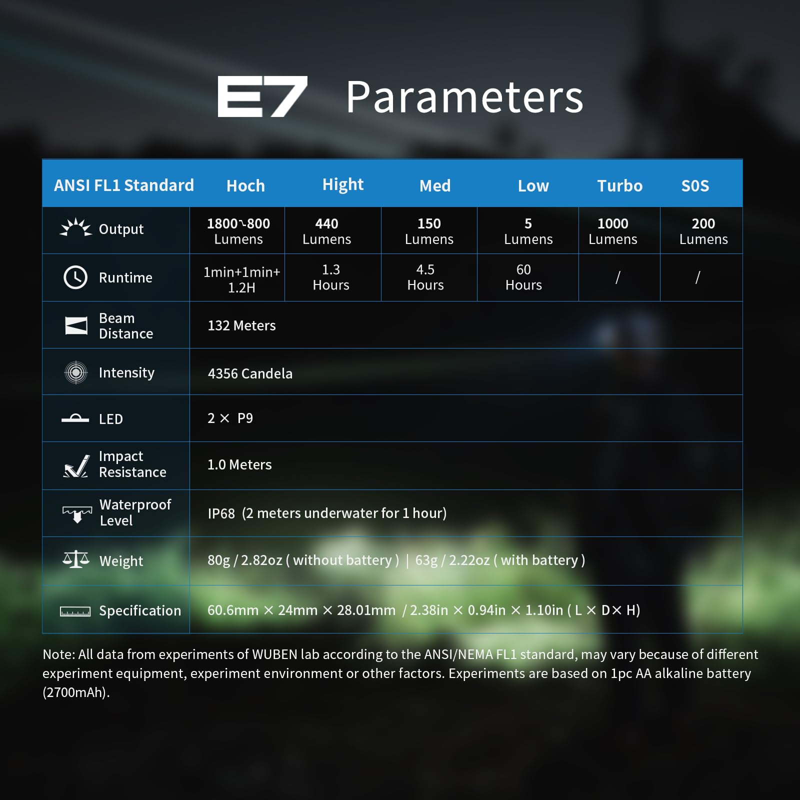 【YOU WILL GET】E7 Flashlight × 1, Rechargeable Battery × 1, Type-C Charging Cable × 1, Spare O-Ring × 2, User's Manual, Warranty Card × 1; If you have any questions about how to use the product or how to mix and match parts, please contact us!
