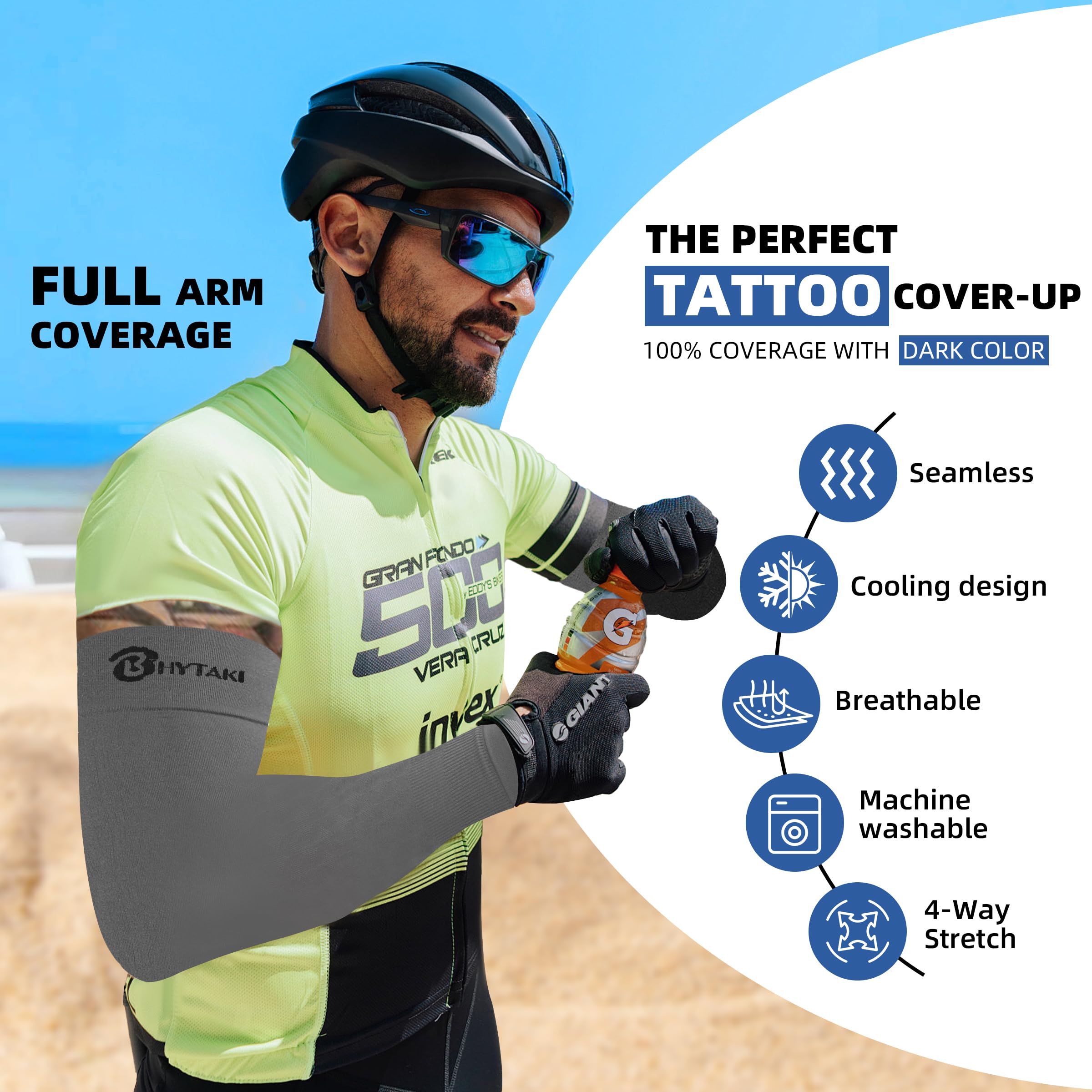 【Excellent Tattoo Sleeve Cover】Our tattoo sleeves are made of a slightly thicker material than ordinary protective sleeves for arms. A pair of regular arm sleeve weighs about 30g, while a pair of our tattoo cover up sleeve weighs about 48g. We have chosen yarns of moderate thickness to make them. So dark colors can cover 100% of tattoos. Since the yarn is more transparent as the sleeve is stretched, light-colored arm sleeves can only be used on thin arms when it comes to covering tattoos.