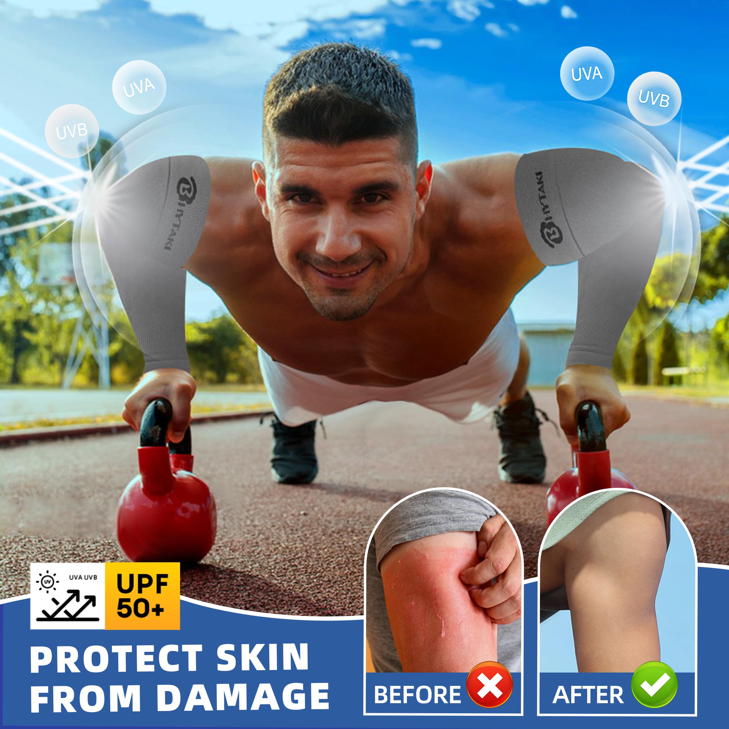 【Warm In Winter and Cool In Summer】The more you sweat, the cooler your skin becomes. Yes, wearing sun sleeves in summer can instantly cool your skin by 2-3°C. After sweating, the uv sleeves for men will quickly absorb the sweat and evaporate it, keeping you dry. In winter, sleeves are another tool for keeping warm. The graded compression sleeve allow your muscles to be fully wrapped comfortably and snugly, and promote blood circulation. Compression sleeve is like our second skin, protecting us.