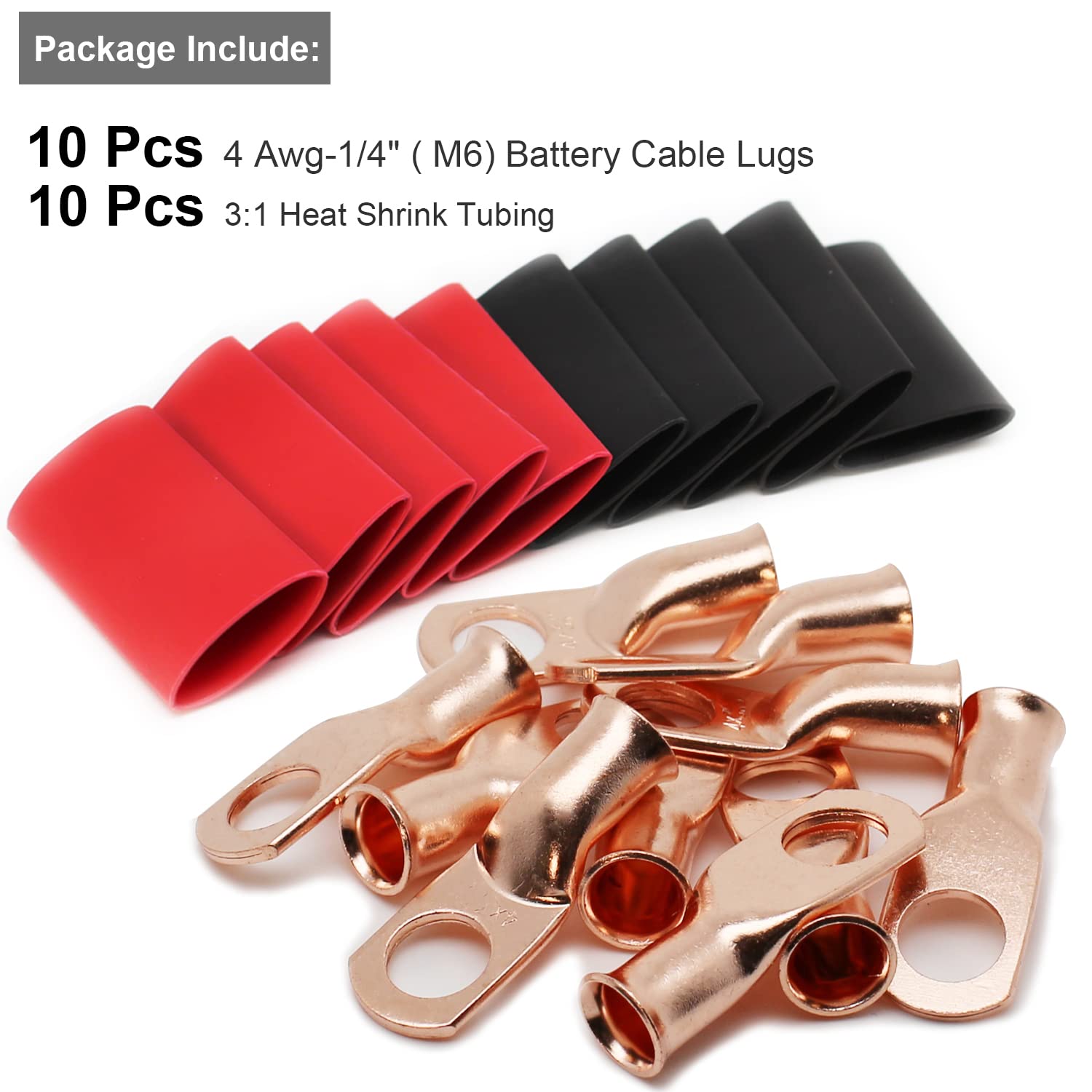 【What You Get:】 10 Pcs per pack of 4 Guage (AWG) 1/4" ring terminals, copper lugs closed end termination ring terminals with 10 Pcs 3:1 Dual Wall Adhesive Heat Shrink Tubing Tube for your work(5pcs Black and 5pcs Red).