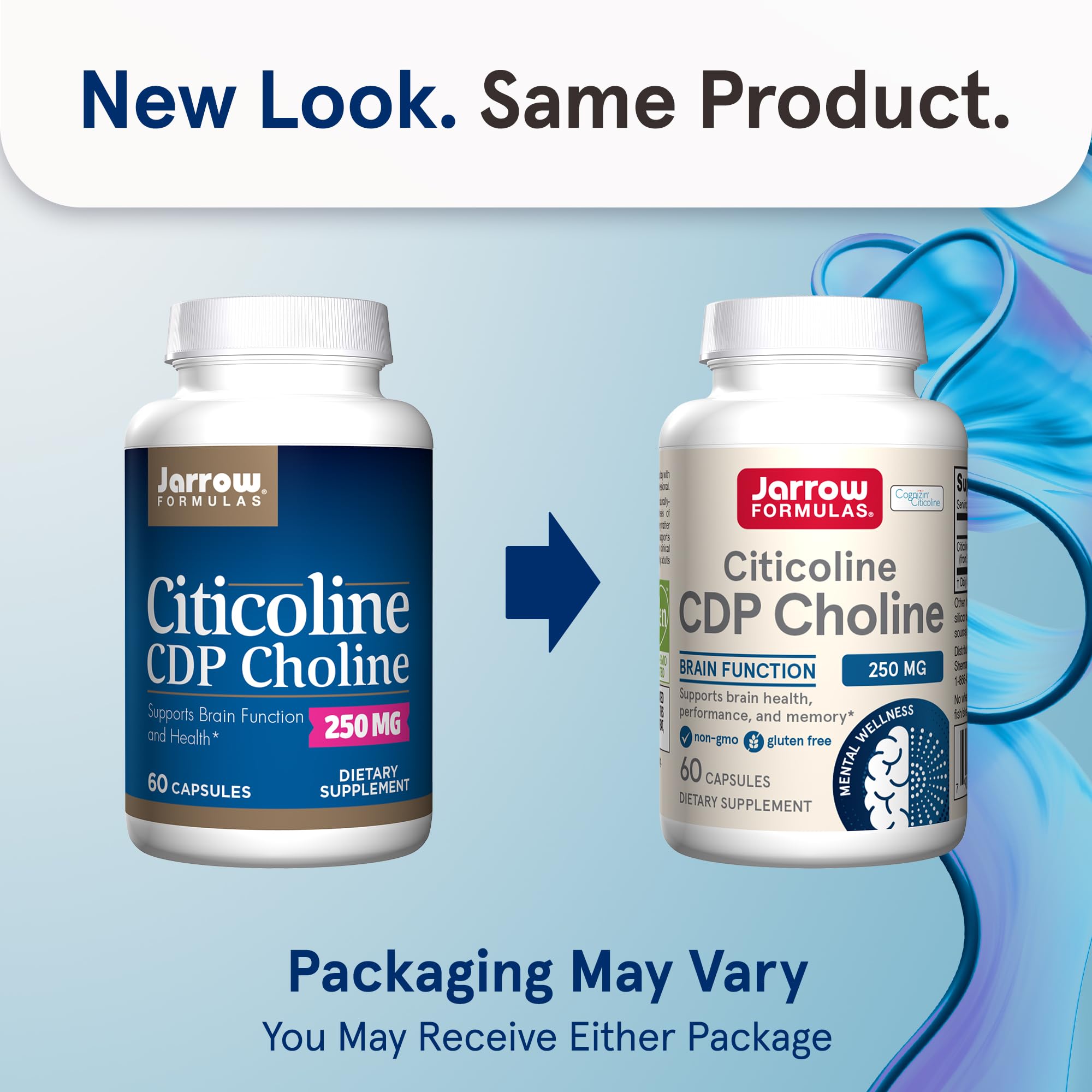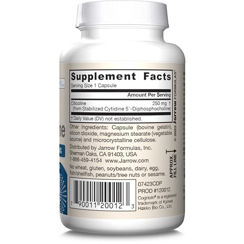 "Jarrow Formulas Citicoline CDP Choline 250 mg is a dietary supplement formulated to support brain health, performance, and memory. This citicoline supplement is made with a quality, non-GMO ingredient. This gluten free brain support supplement contains no wheat, soybeans, dairy, egg, fish, shellfish, peanuts, tree nuts or sesame, making it vegan-friendly. Citicoline is a naturally occurring intermediate involved in the synthesis of phosphatidylcholine, which is a major constituent of the grey matter of brain tissue. Supplementation with Jarrow Formulas Citicoline has been shown in clinical research to support brain energy metabolism and attention performance in healthy adults and adolescents. This brain supplement also supports the production of acetylcholine, dopamine and norepinephrine, three neurotransmitters. Suggested Use: Adults, take one easy to swallow capsule one or two times a day at home or on-the-go with food or as directed by your qualified healthcare professional. It's a great addition to your daily routine for school, studying, and work. (1)These statements have not been evaluated by the Food and Drug Administration; this product is not intended to diagnose, treat, cure, or prevent any disease"