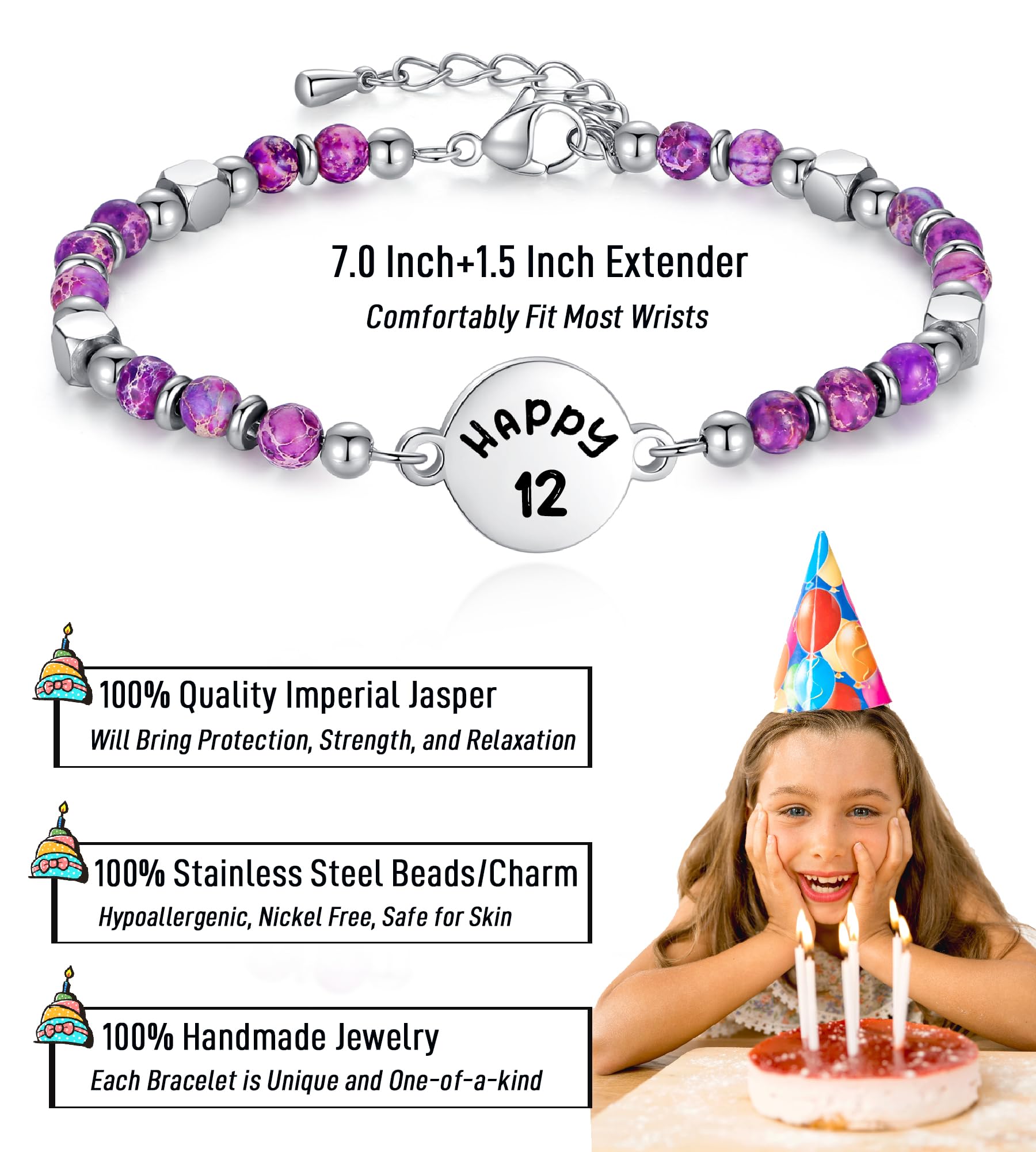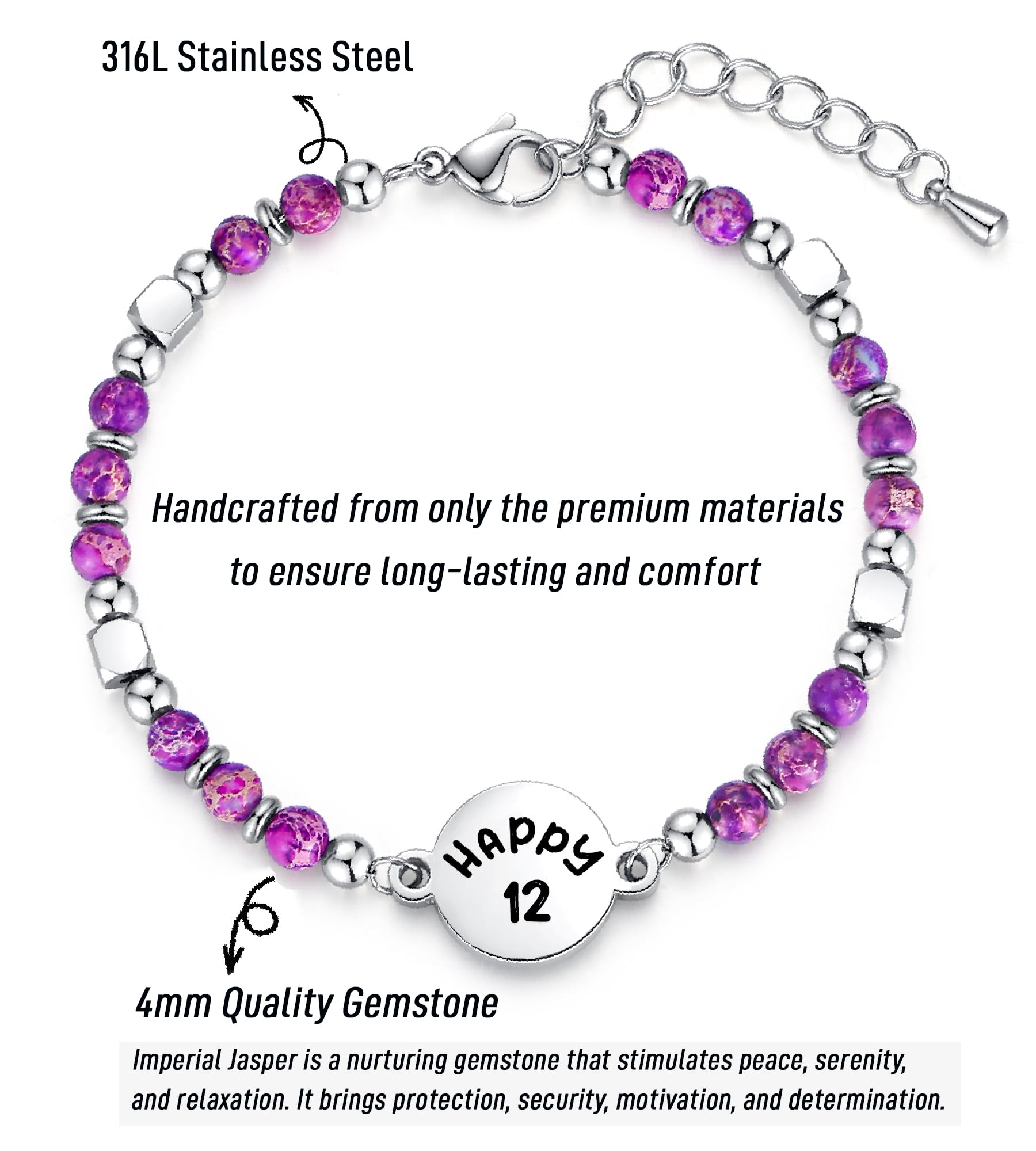 Birthday Bracelet for 12 Year Old Girl: Combination of tiny gemstones, stainless steel beads, and a sweet "Happy 12" charm, this pretty bracelet makes the perfect 12 year old birthday gifts due to its unique design and natural stone meaning. Imperial Jasper is said to bring peace, serenity, healing, and strength to your young girl. Celebrate her turning 12 with this beautiful bracelet, remind the sweet girl always remember that she is brave, strong and smart, and beautiful.