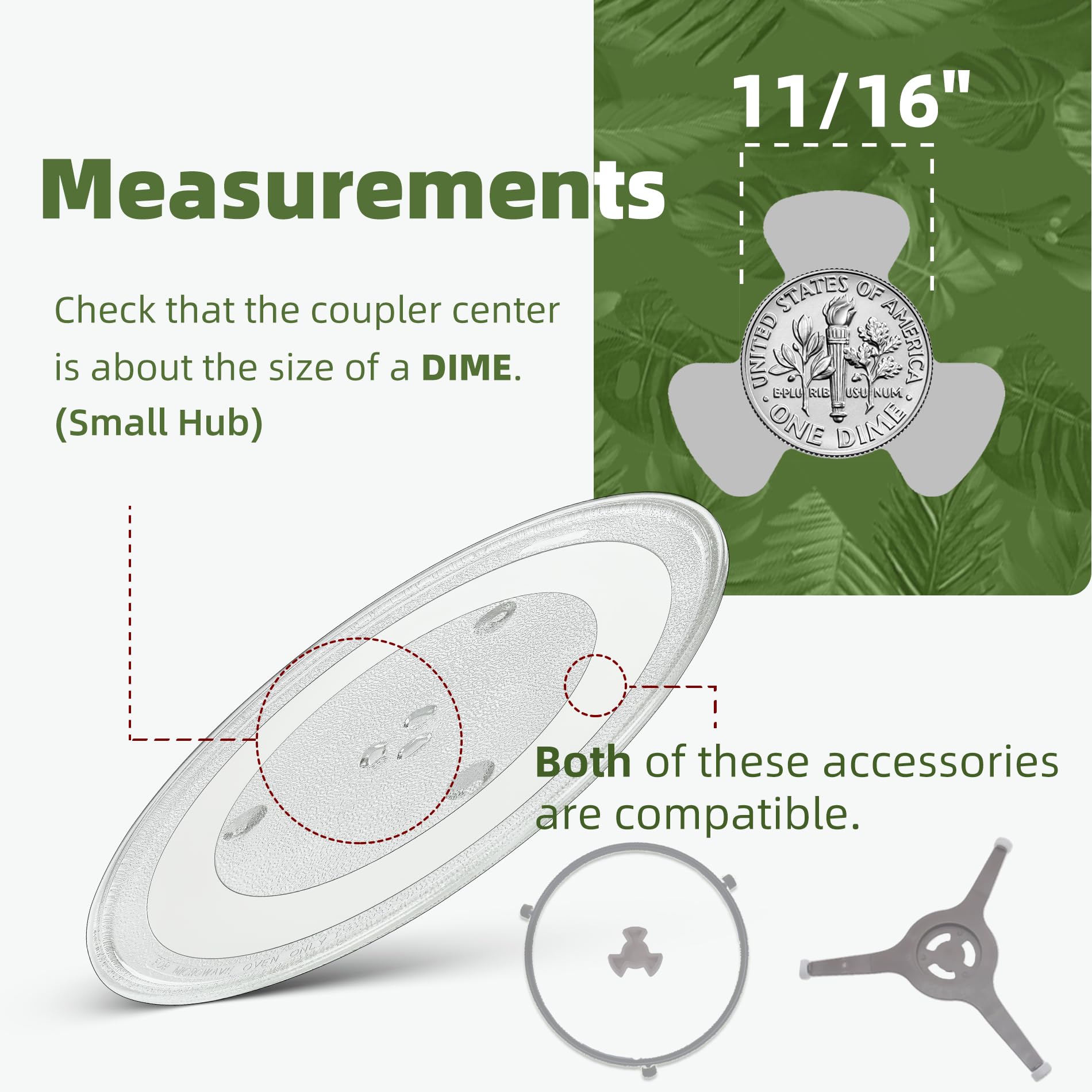 This 10.6 IN Microwave Glass Turntable has a one-dime sized small coupler hole in the center. (The center spot of turntable coupler measures 11/16" in diameter)