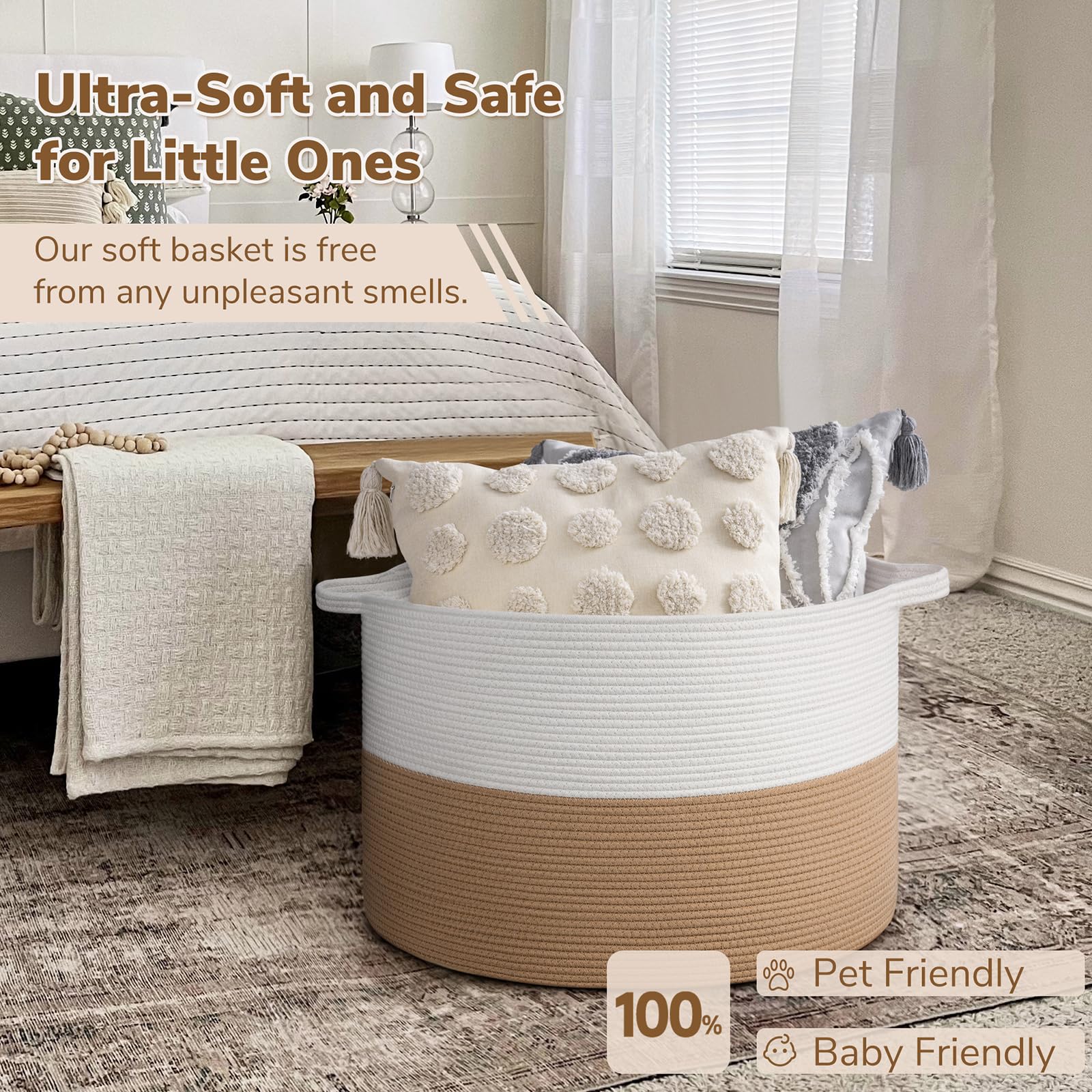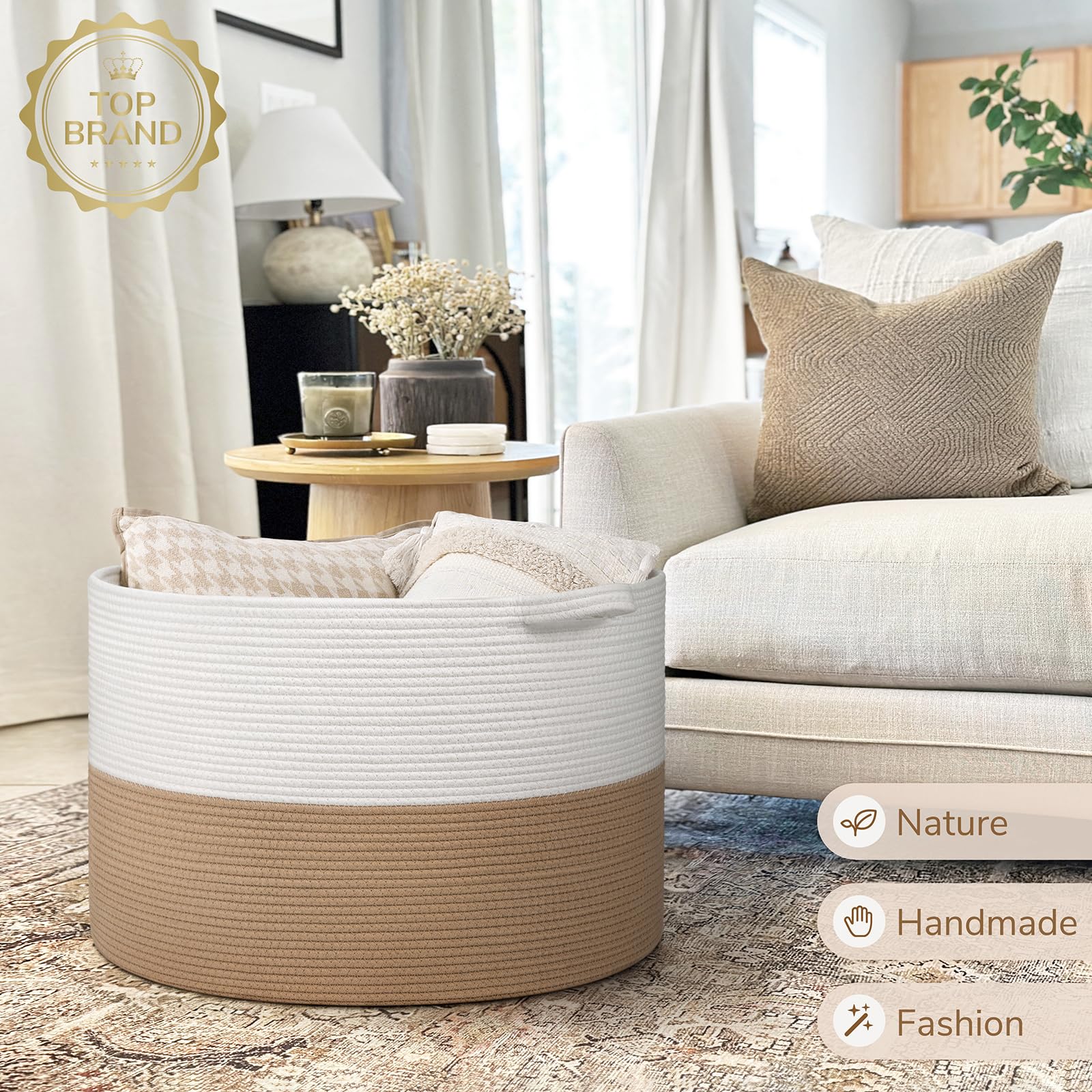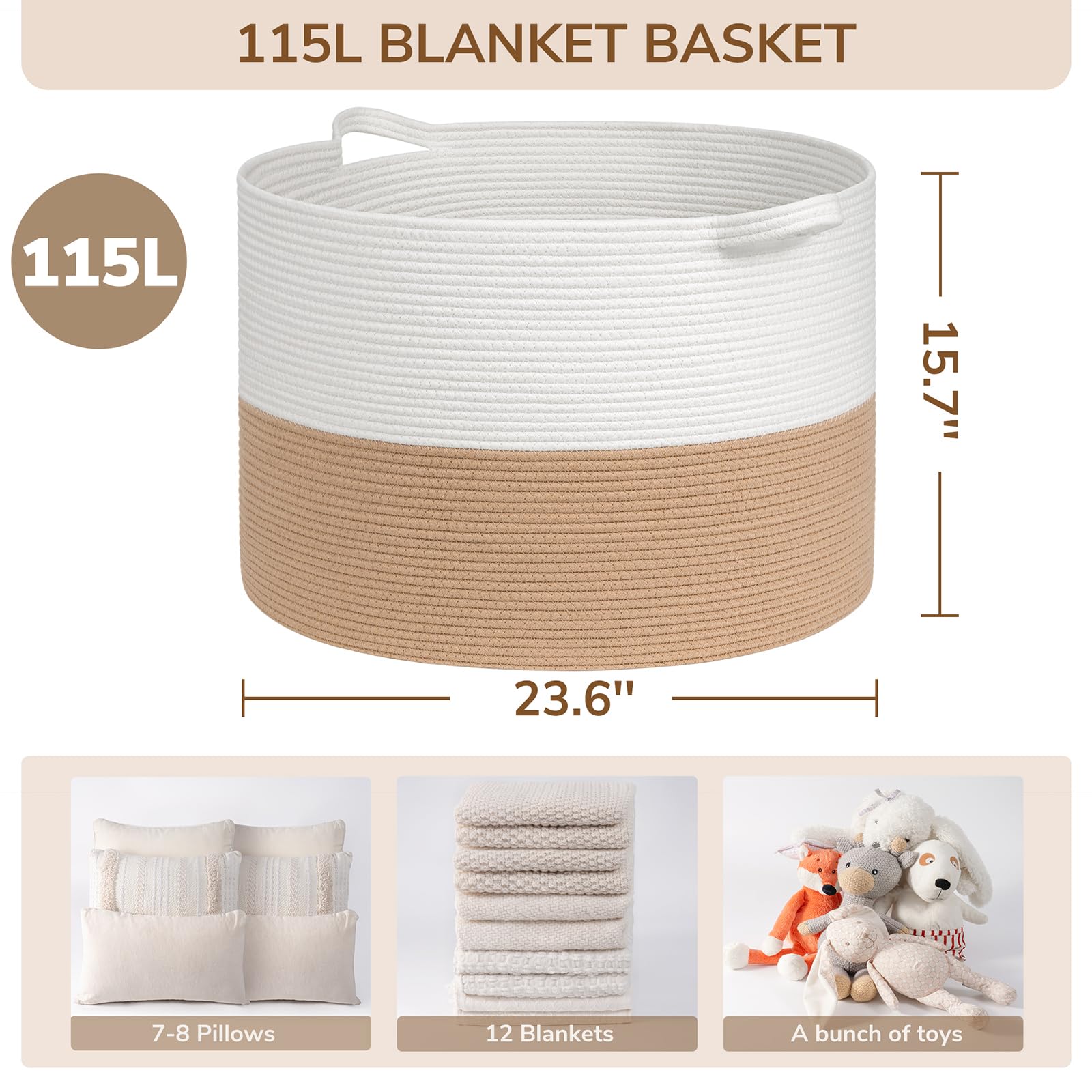 Spacious Jumbo Design. This 115L jute basket(23.6"D x 15.7"H) provides 30% more space than our 90L model, perfect for larger families or more extensive organizing needs. It easily holds extra blankets, clothes, and toys, keeping your home tidy and stylish.