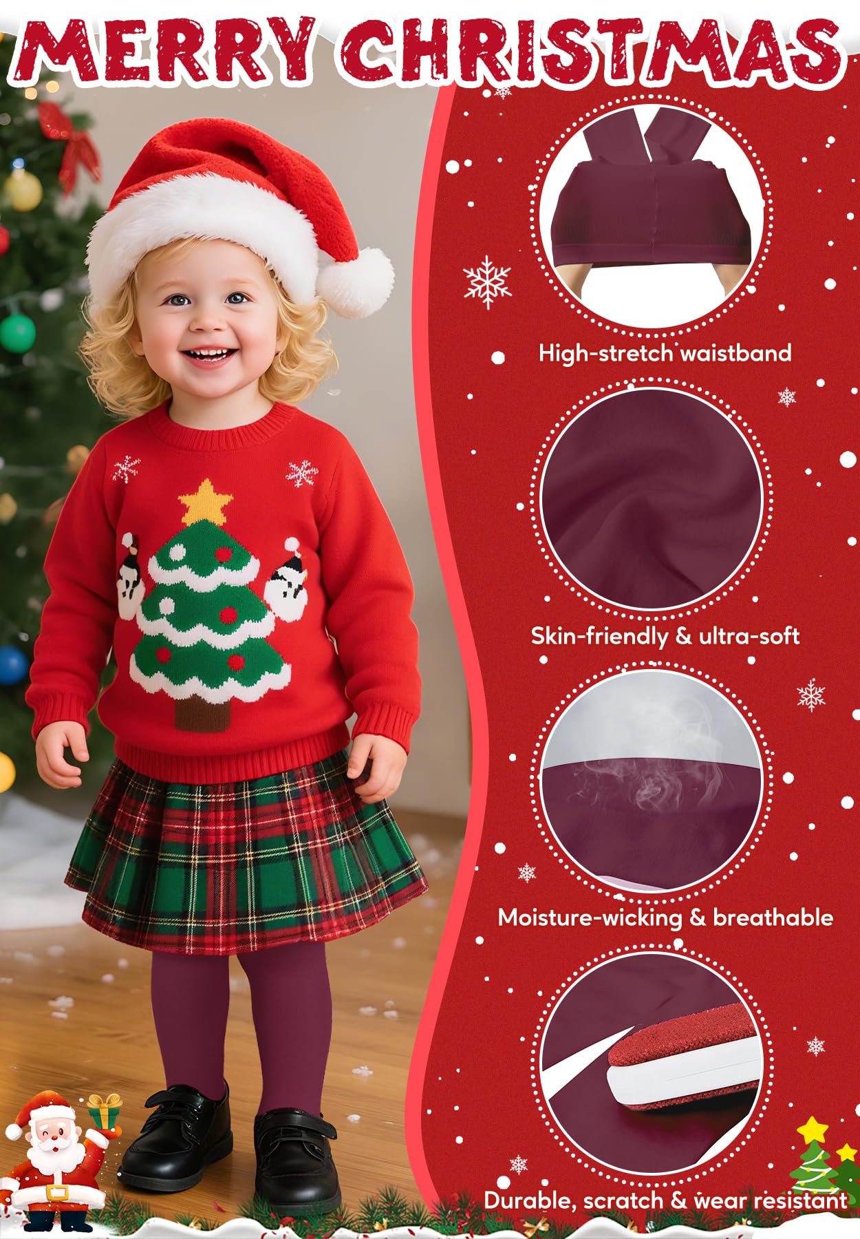 【Reinforced Toes , Durable, Fade-Resistant & Easy to Clean】 Specially reinforced toe area helps prevent snags and wear, offering extra durability throughout the season. Even after multiple washes, the toddler tights retain their vibrant color and stretch. Easy to care for and made to last—keeping up with all the excitement of the holiday season.