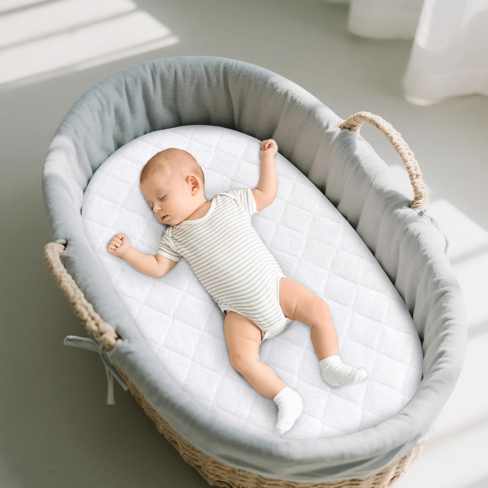 Waterproof and Noiseless: Ours bassinet mattress protector is made of Viscose Terry fabric with 100% waterproof TPU layer on the back to preventing mattress accident spills or frequent bedwetting in the night, Ours bassinet mattress protector ensures a noise-free sleep environment for your baby. It's crafted to eliminate the crinkling sounds often heard with plastic pads, maintaining a quiet setting for peaceful slumber.
