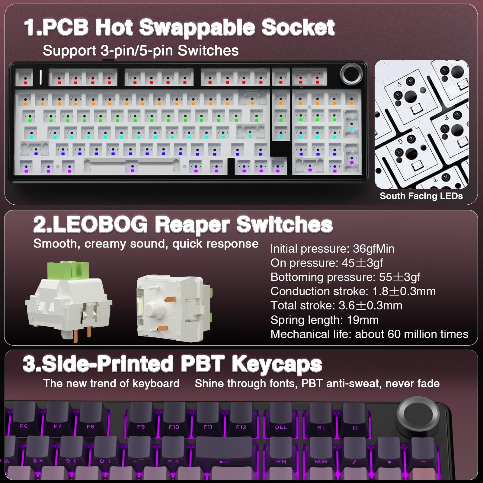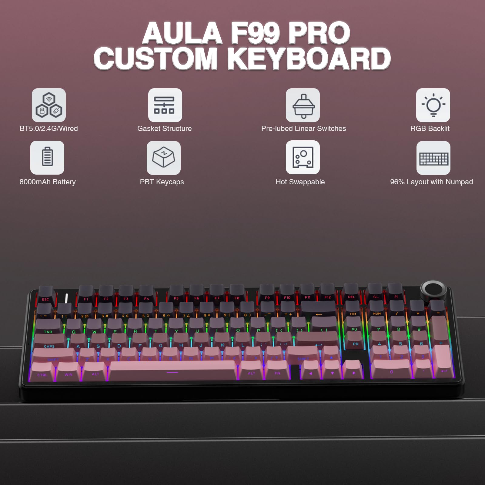 Hot-swappable Custom Keyboard: The switches and keycaps can be freely replaced(keycap/switch puller are included in the package).This customizable keyboard with hot-swap PCB allows users to replace 3 pins/5 pins switches easily without soldering issue. F99 Pro mechanical keyboards equipped with pre-lubed linear switches, bring smooth typing feeling and pleasant creamy mechanical sound, provide fast response for exciting game
