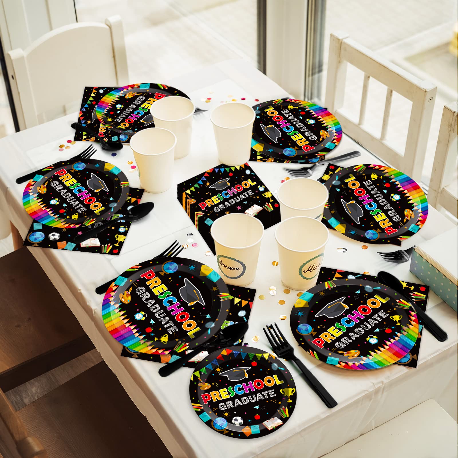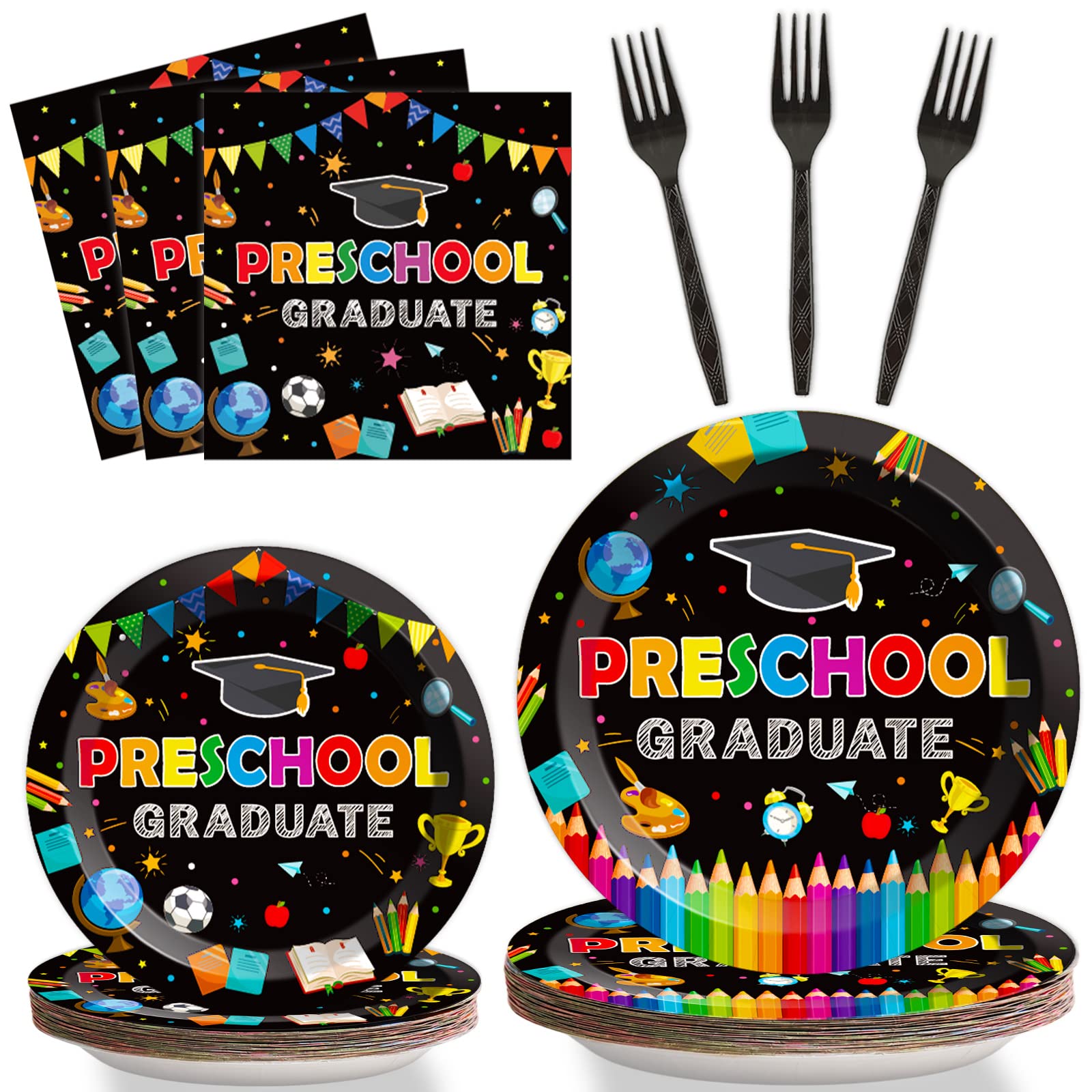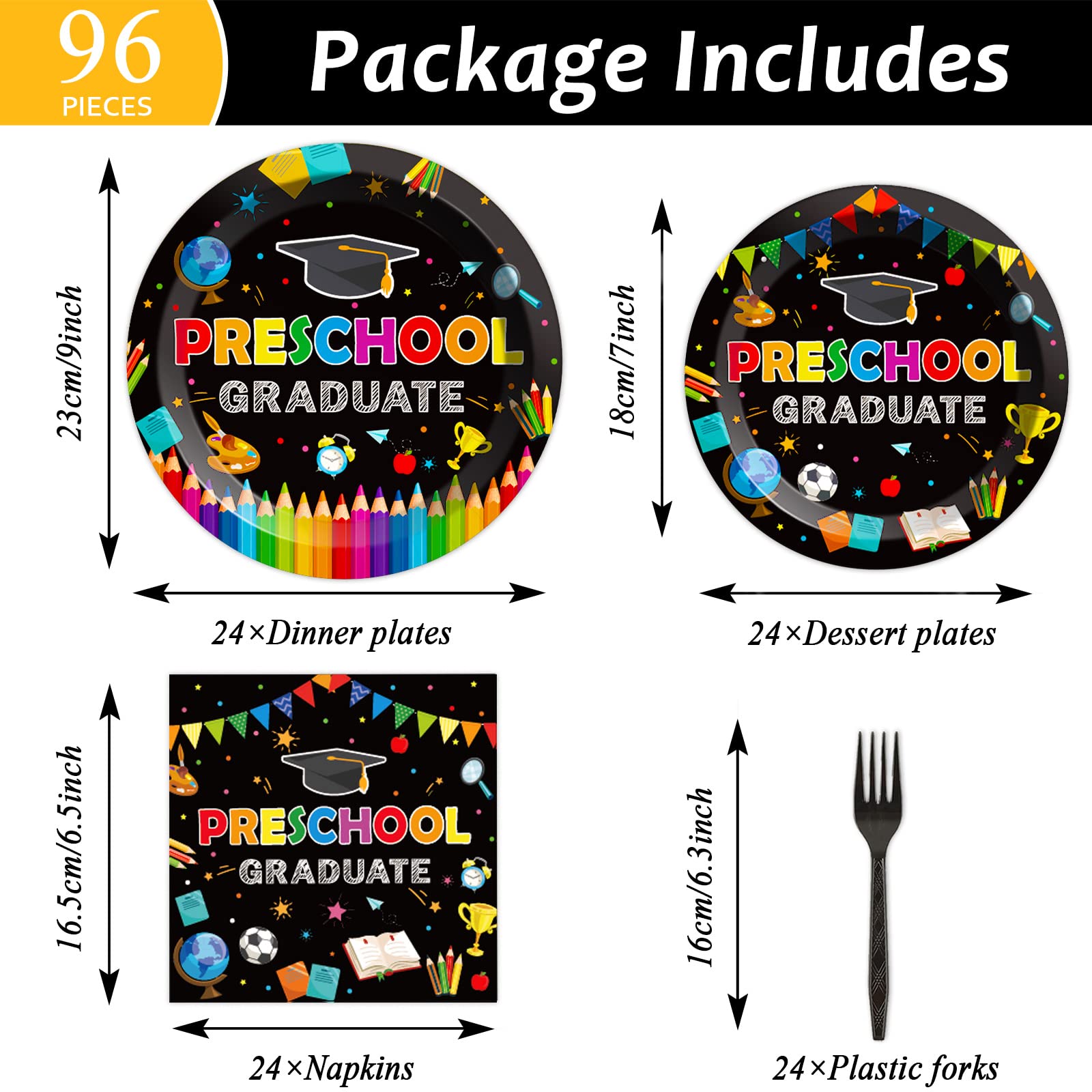 What you will get: You'll receive 24 9" preschool graduation party paper plates, 24 7" preschool graduation paper plates, 24 6.5" preschool graduation napkin replacers, and 24 plastic black forks each set serves 24 people guests
