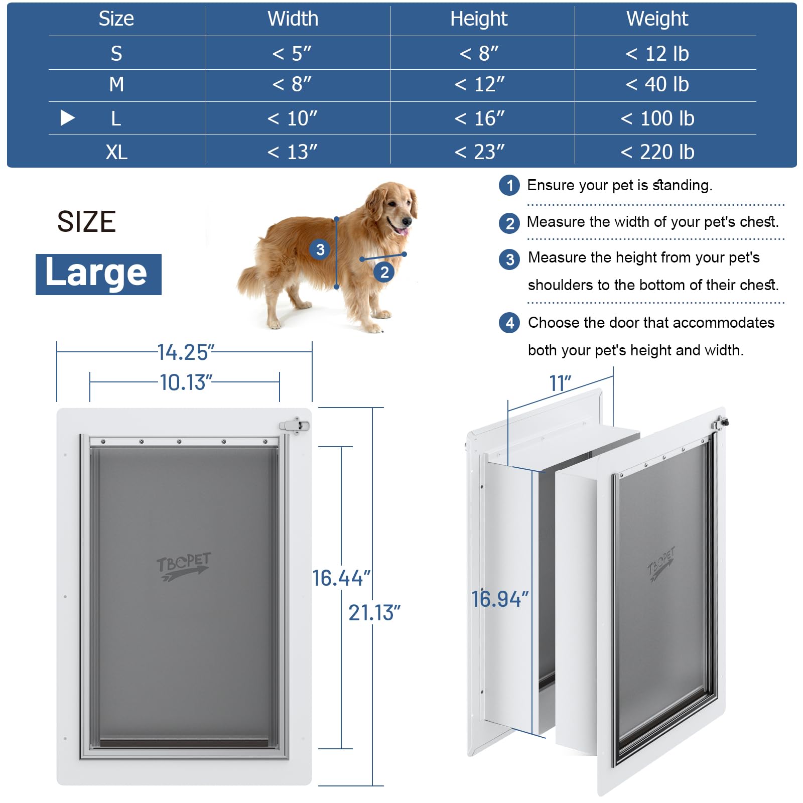 Dimension and Telescoping Tunnel: TBCPET large-sized dog door features an adjustable tunnel, perfect for walls that are 4.13 to 7.87 inches thick. The flap opening measures 10.37 x 17.22 inches. Please carefully review the size chart to confirm if the size is suitable before purchasing