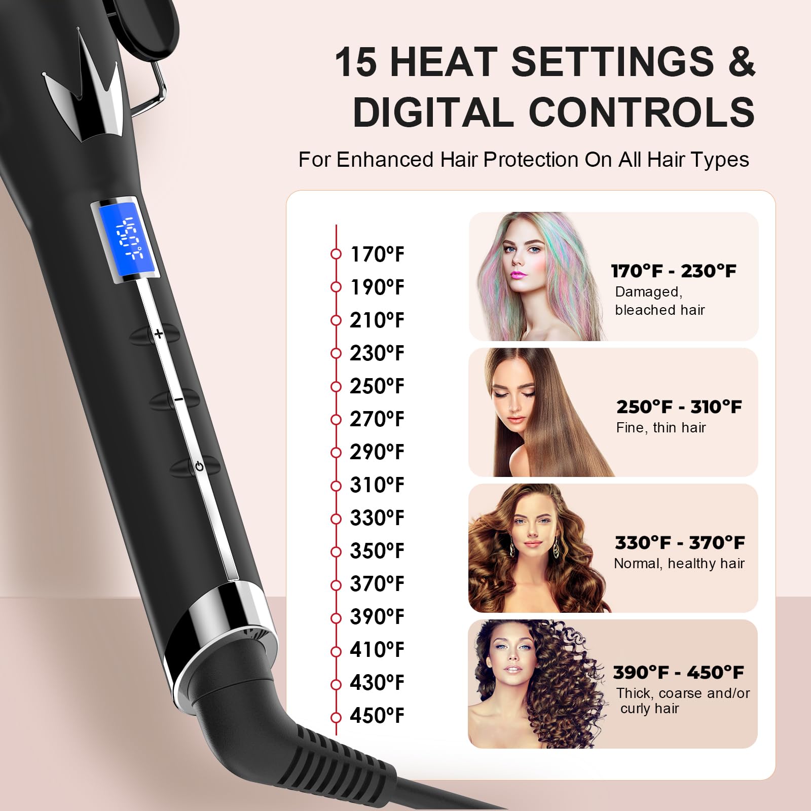 【15 adjustable temperature from 170°F - 450°F, suitable for all hair types】Create flawless, long-lasting waves with minimun heat damage by customizing the temperature for YOUR hair. With 15 heat settings ranging from 170°F to 450°F, from thick to fine to curly to straight hair, this hair curling iron works on every hair type, you can choose the perfect temperature for your hair type and texture. Moreover, There is a digital temperature display that offers easily adjustable temperature settings.