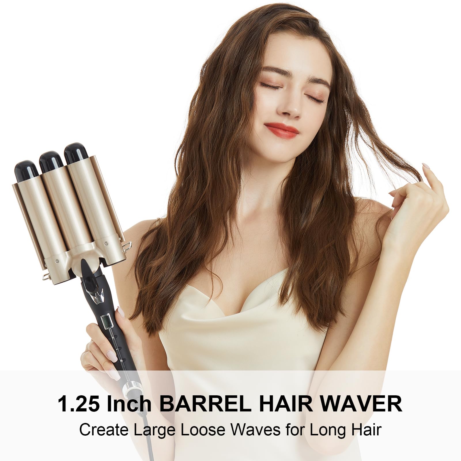 【Three 1.25" barrel: Instantly create EFFORTLESS LOOSE WAVES in seconds】 This must-have1 1/4 inch curling iron creates beachy, boho or glam waves in seconds, making it super easy for anyone to do.Featuring 3 x 1.25 in large barrels its super simple just simply clamp down and release for instant waves unlike old school single barrel curlers that take agers to curl hair its can now be done in seconds!
