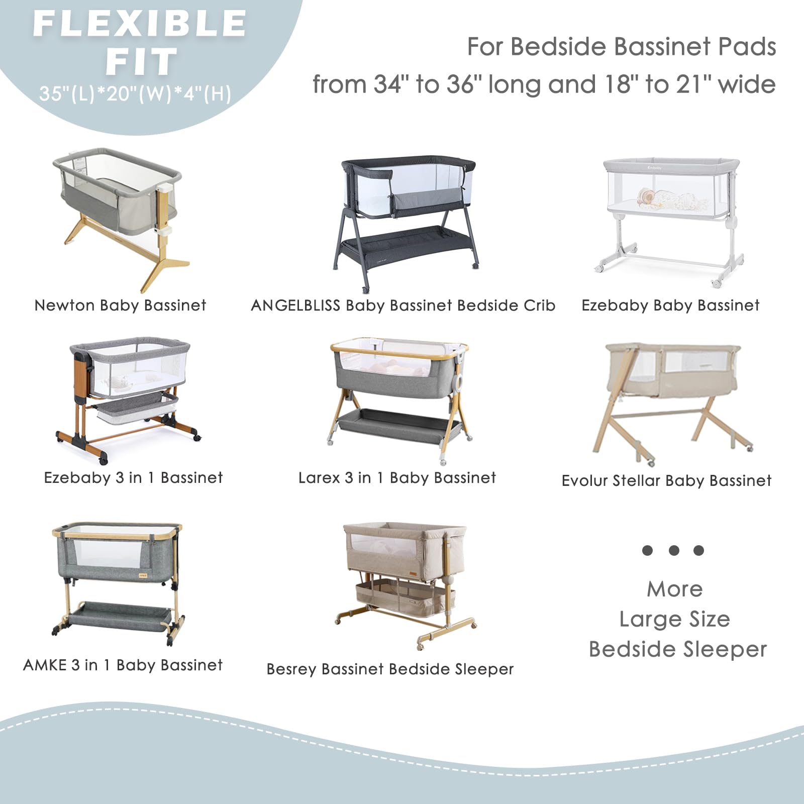 FLEXIBLE FIT - These bassinet fitted sheets measure 33x20 inches and made specifically for most regular-sized bedside sleeper bassinets such as Baby Delight Beside Me Dreamer, Dream On Me Skylar, Maxi-Cosi Iora and other rectangle bassinet mattress. With an elastic band around the bottom edge of each sheet to ensure a snug fit, these bassinet mattress sheets are flexible fit pads from 18" to 21" wide and 30" to 33" long