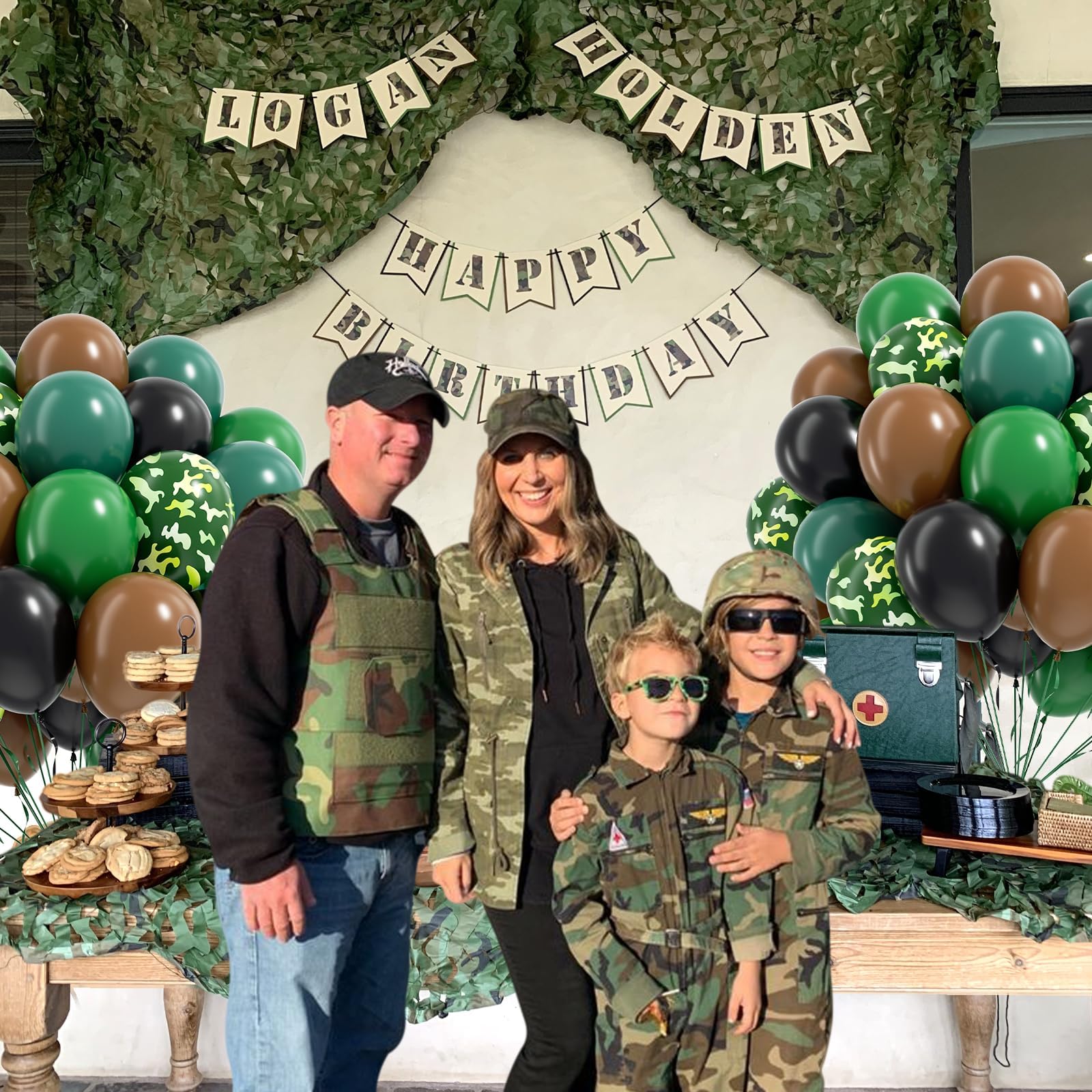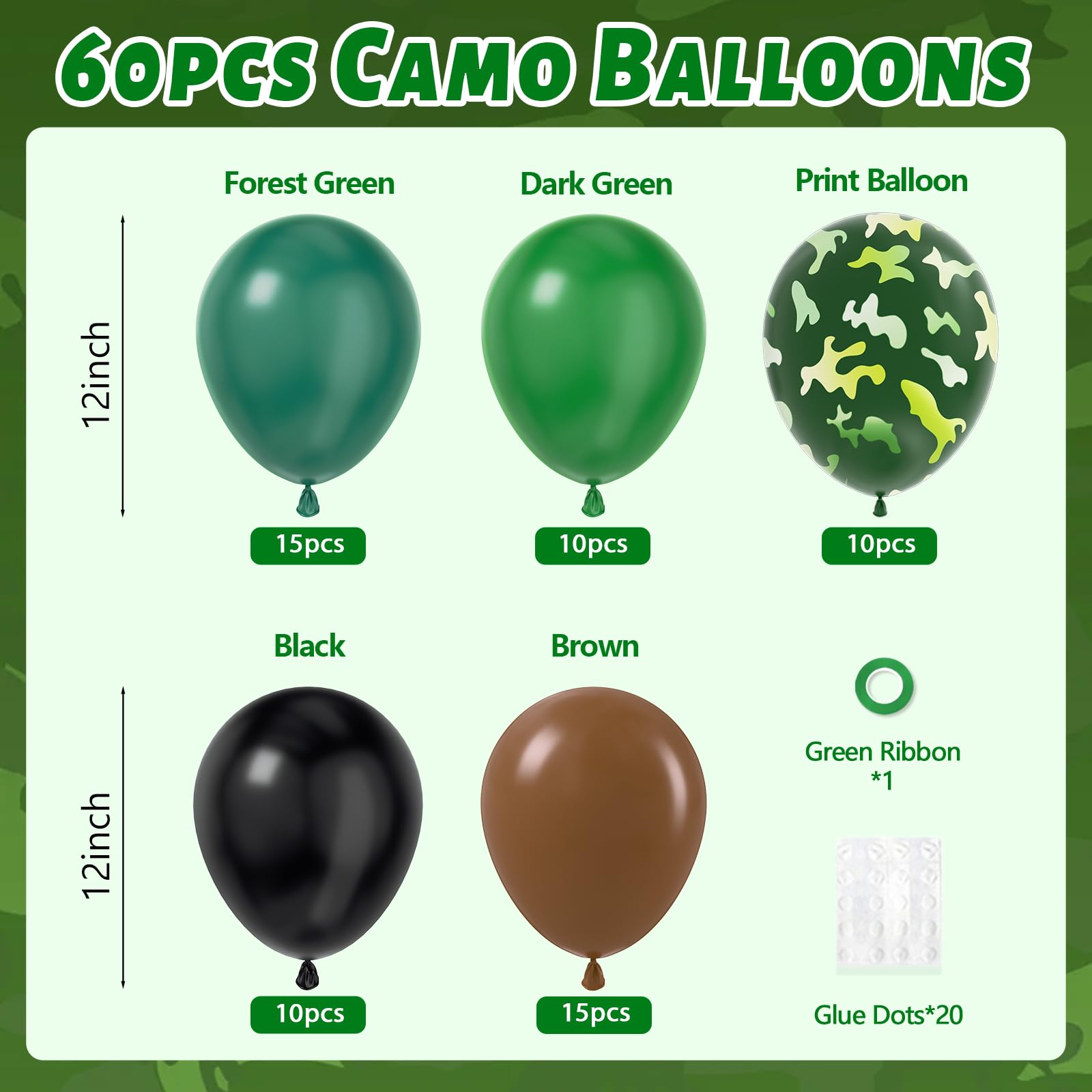 Package Include: The camo balloons include 12inch forest green balloonsx15, 12inch dark green balloonsx10, 12inch brown balloonsx15, 12inch black balloonsx10, 12inch print balloonsx10, glue dotsx20, green ribbonx1