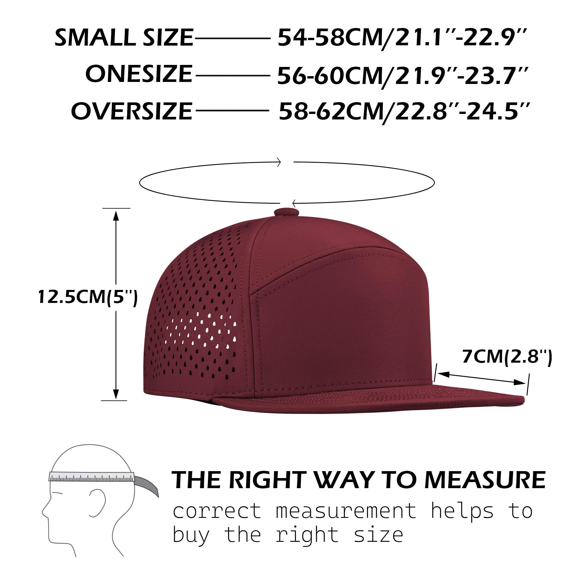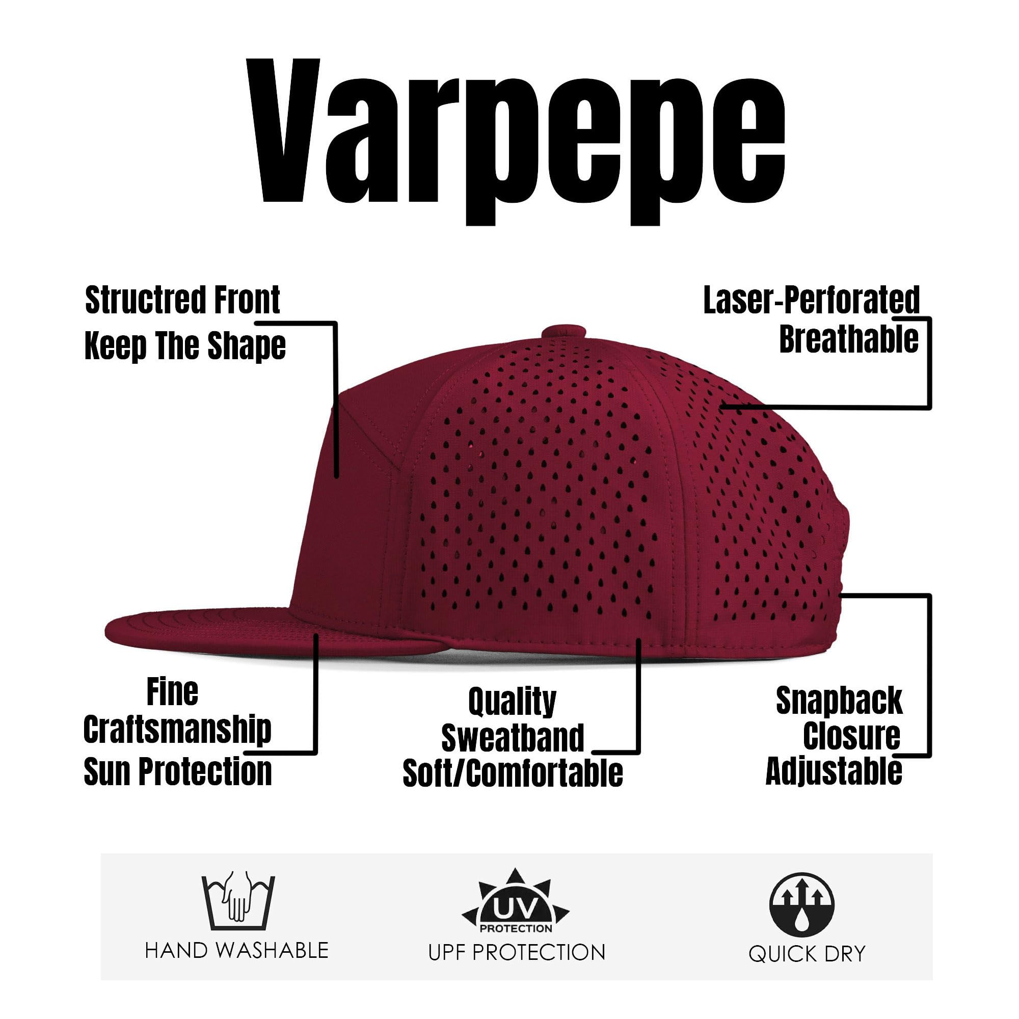 Varpepe Hat Design: Stylish and functional,structured front panels that maintains shape, 6-panel, flat brim, laser-perforated side & rear panels for breathability, and soft touch adjustable snapback closure