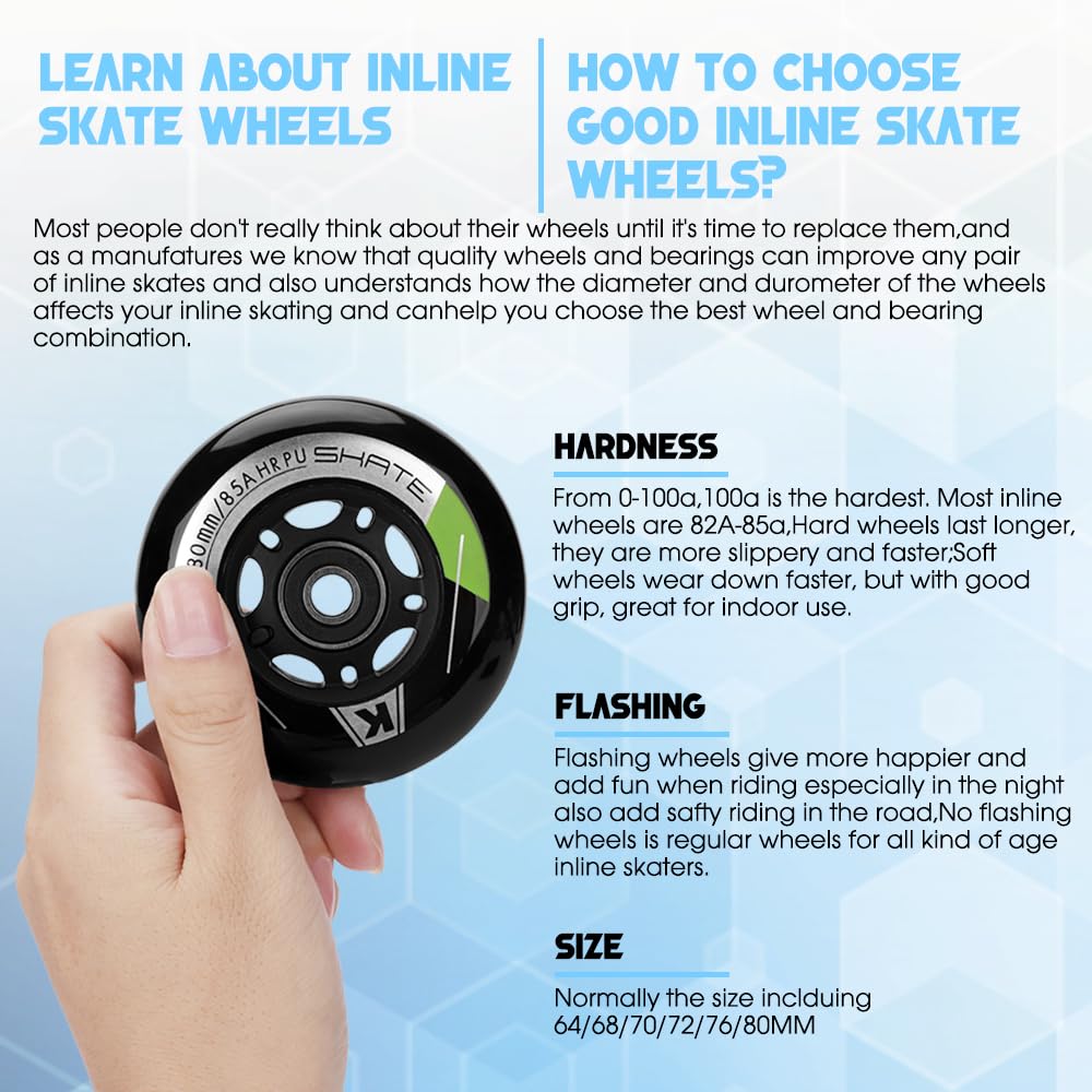[RIDING MORE SMOOTH IN INDOOR&OUTDOOR ] The combination of inline skate wheels diameter+durometer+Bearing will affects your inline skating shoe,Our skating Wheels Pu/bearing/hardness adopt performance material - tested weel by kids and adults riders - PU never worn easily and de-hubs.Great for indoor and outdoor riding.