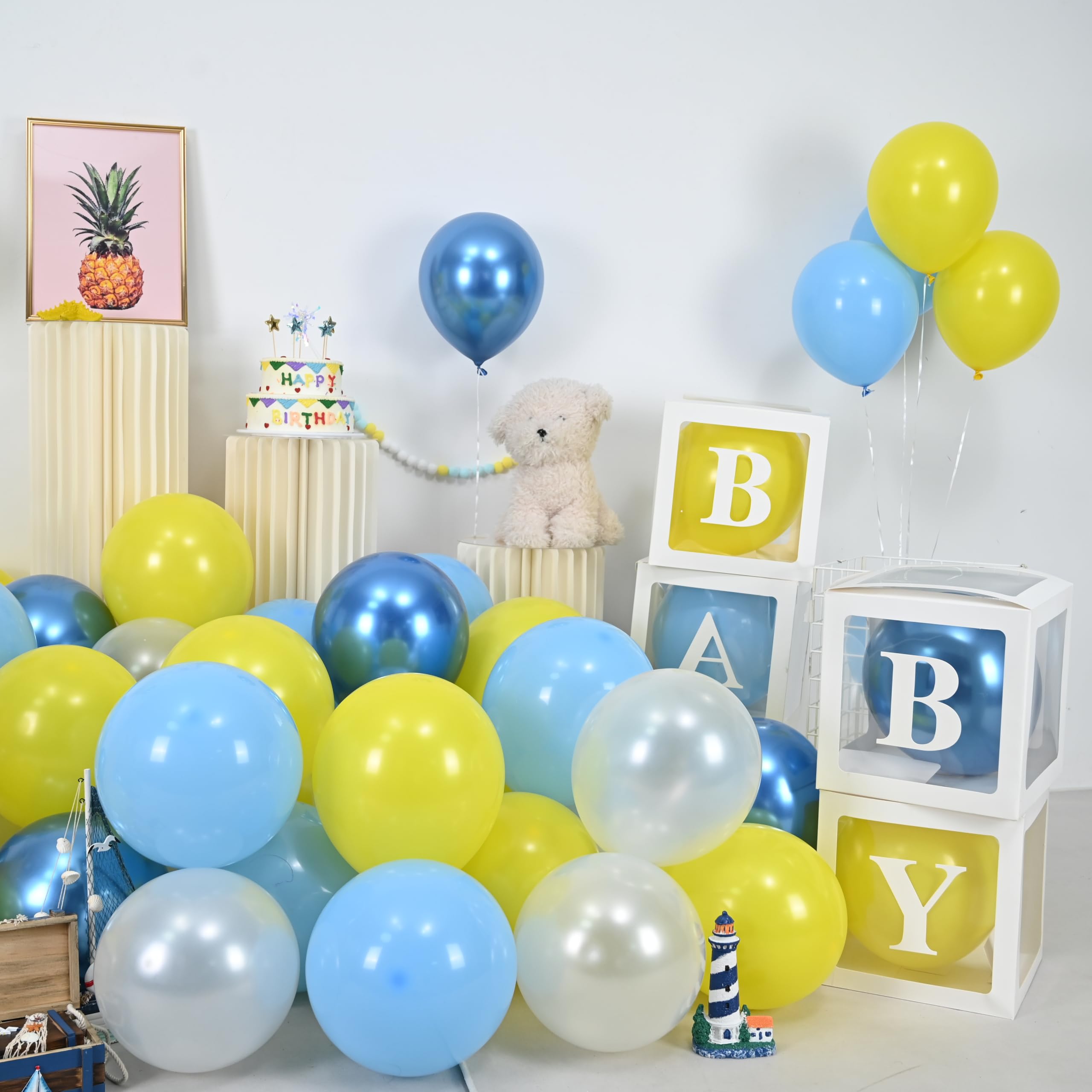 Blue Yellow Balloons๏ผYou will receive this 60pcs 12-inch yellow blue balloons, which includes 4 colors. Metallic blue balloons x 10, matte light blue balloons x 15, clear white balloons x 15, matte yellow balloons x 20. Accompanying by a 10M ribbon. Classic yellow blue colors to embellish your theme party!